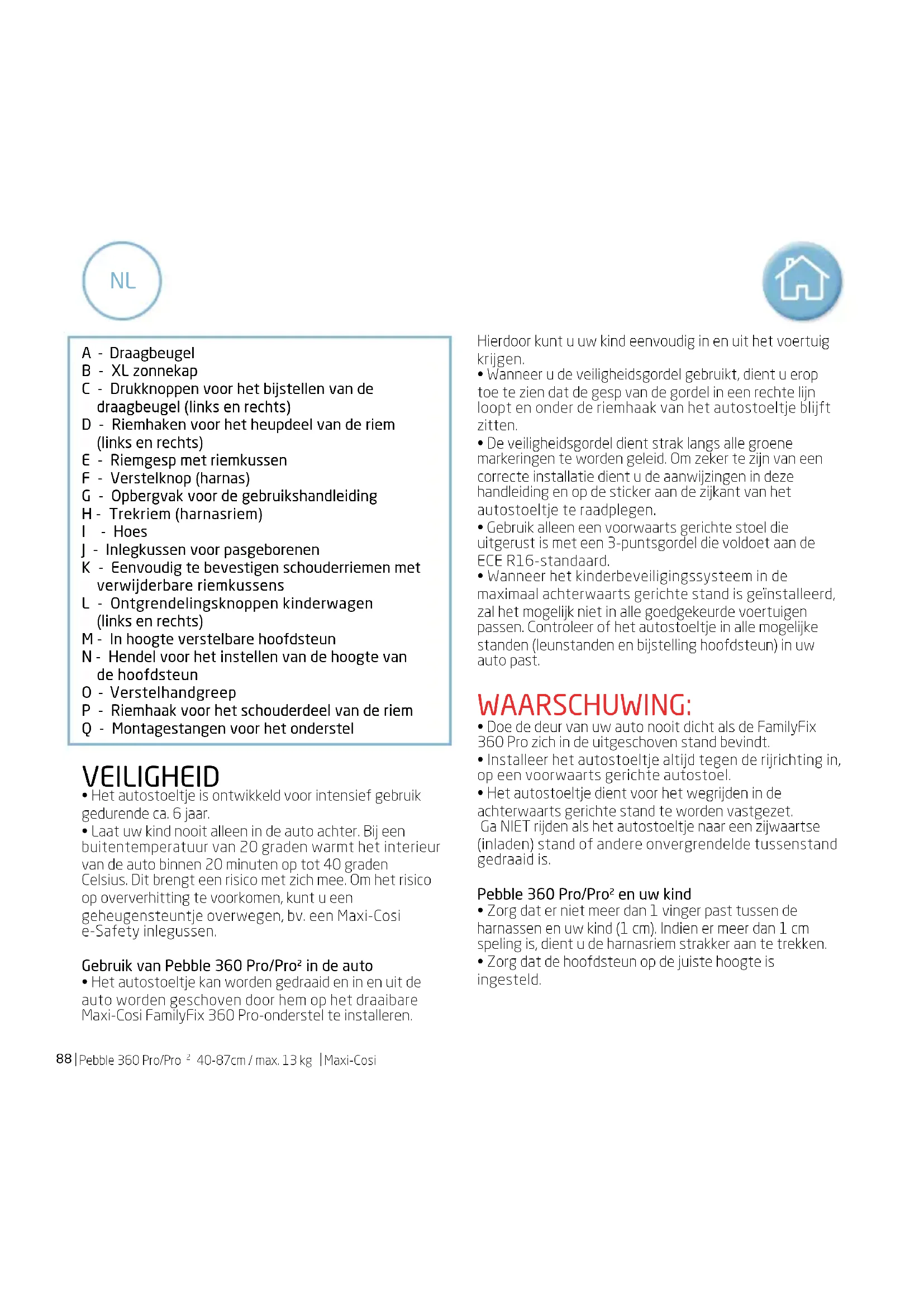 Pebble 360 Pro//Pro² is een verbeterd “Universal” kinderbeveiligingssysteem dat gebruik maakt van de veiligheidsgordel. Het voldoet aan UN Verordening Nr. 129 i-Size, voornamelijk voor gebruik bij “Universal” zitstanden, zoals de autofabrikant in de gebruikshandleiding van het voertuig heeft aangegeven. Raadpleeg bij twijfel de fabrikant van het Betere Kinderbeveiligingssysteem of de detailhandelaar. Dit babyautostoeltje maakt deel uit van de 360 Pro Family en biedt een volledige mobiliteitsoplossing vanaf de geboorte tot ca. 4 jaar. Ga naar de website (www.maxi-cosi.com) om meer te weten te komen over i-Size. Categorie van uw autostoel: i-Size (40-87 cm – tot ca. 18 maanden) Stand van uw autostoel: achterwaarts gericht10