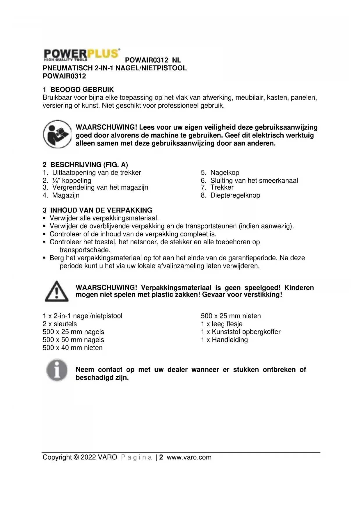 - Berg het verpakkingsmateriaal op tot aan het einde van de garantieperiode. Na deze periode kunt u het via uw lokale afvalinzameling laten verwijderen. WAARSCHUWING! Verpakkingsmateriaal is geen speelgoed! Kinderen mogen niet spelen met plastic zakken! Gevaar voor verstikking! 1 x 2-in-1 nagel/nietpistool 2 x sleutels 500 x 25 mm nagels 500 x 50 mm nagels 500 x 40 mm nieten 500 x 25 mm nieten 1 x leeg flesje 1 x Kunststof opbergkoffer 1 x Handleiding Neem contact op met uw dealer wanneer er stukken ontbreken of beschadigd zijn.POWAIR0312 NL Copyright © 2022 VARO P a g i n a | 3 www.varo.com