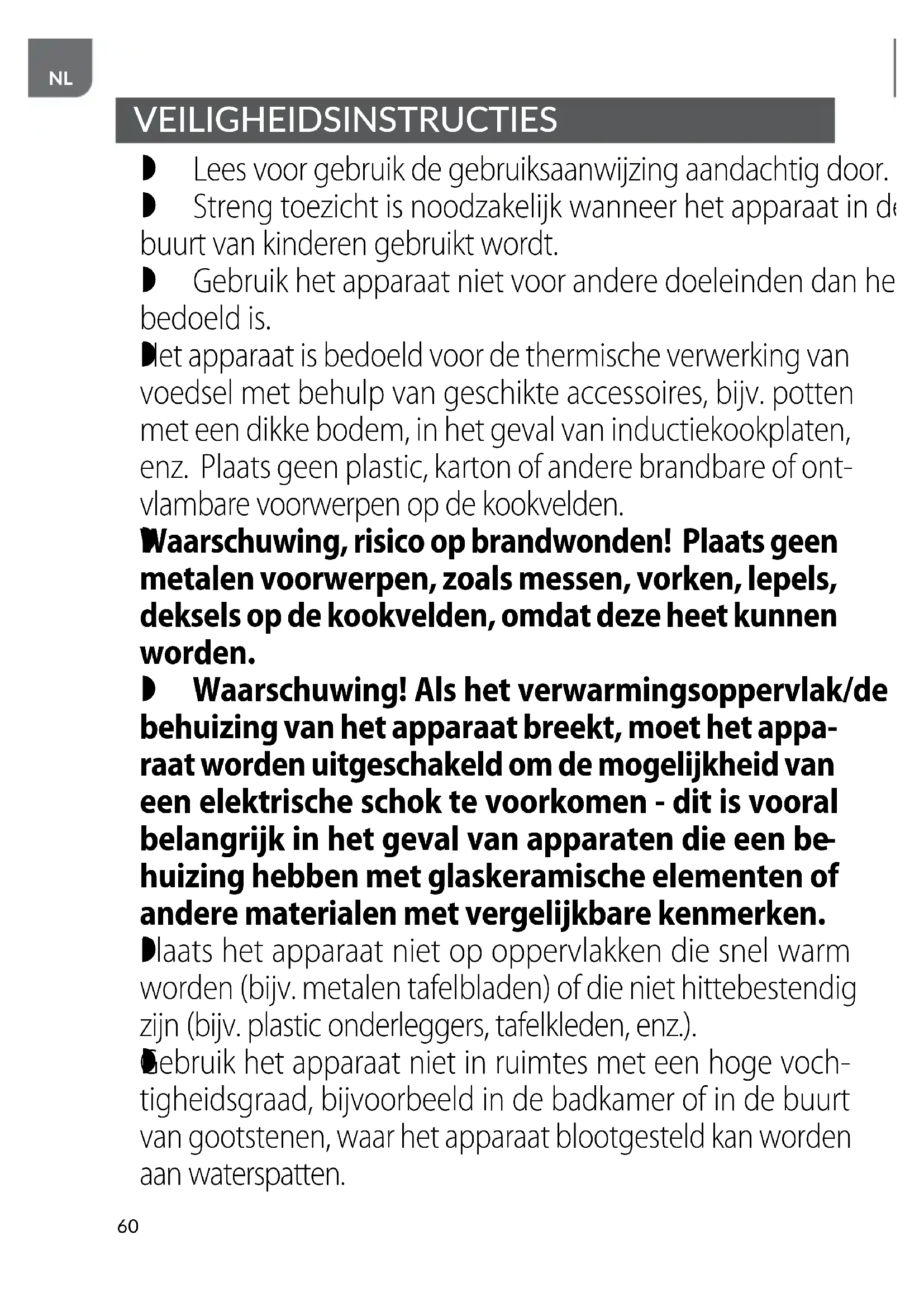 Waarschuwing, risico op brandwonden! Plaats geen metalen voorwerpen, zoals messen, vorken, lepels, deksels op de kookvelden, omdat deze heet kunnen worden. Waarschuwing! Als het verwarmingsoppervlak/de behuizing van het apparaat breekt, moet het appa- raat worden uitgeschakeld om de mogelijkheid van een elektrische schok te voorkomen - dit is vooral belangrijk in het geval van apparaten die een be