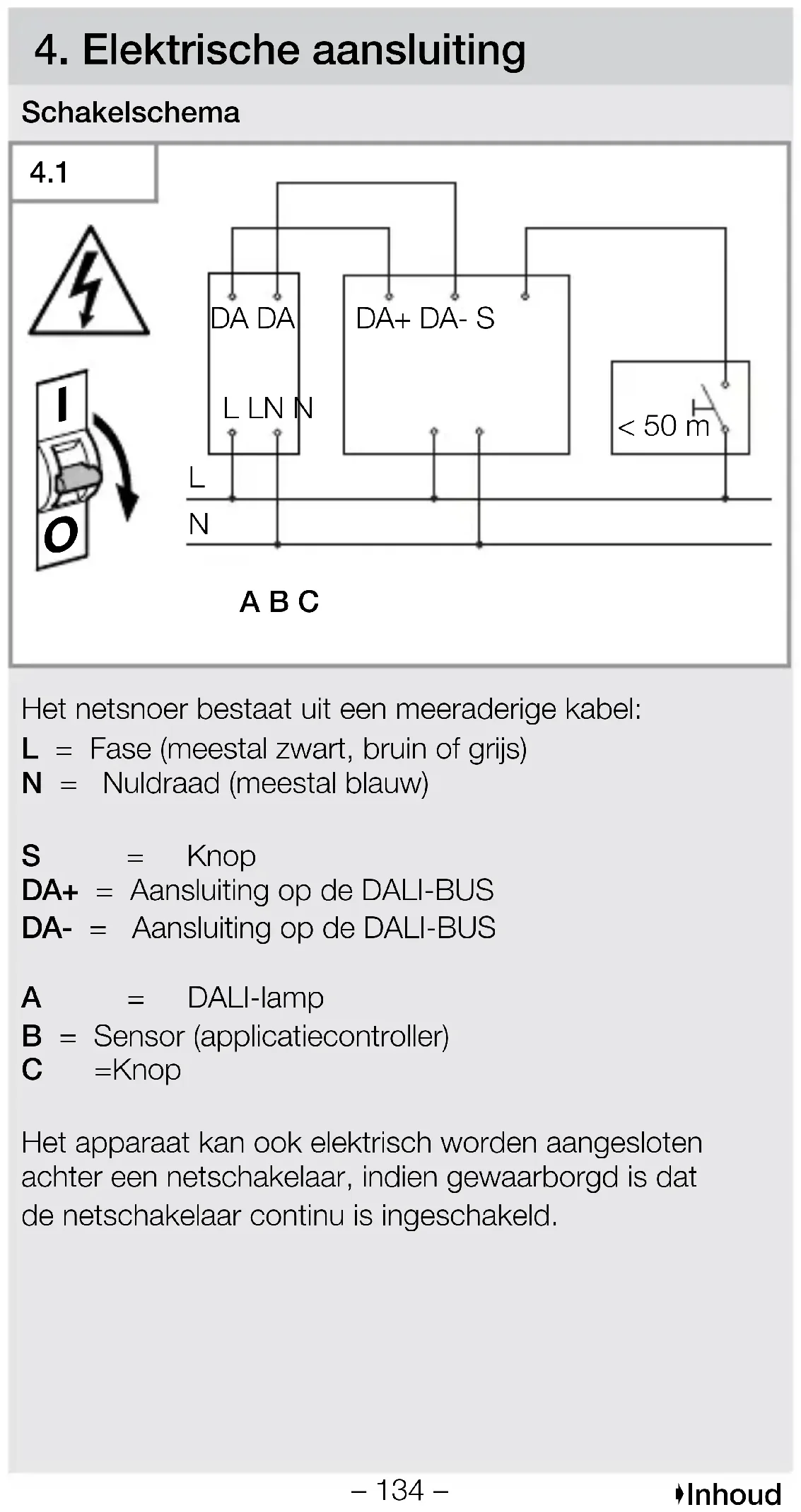 Het netsnoer bestaat uit een meeraderige kabel: L = Fase (meestal zwart, bruin of grs) N = Nuldraad (meestal blauw) S = Knop DA+ = Aansluiting op de DALI-BUS DA- = Aansluiting op de DALI-BUS A = DALI-lamp B = Sensor (applicatiecontroller) C = Knop Het apparaat kan ook elektrisch worden aangesloten achter een netschakelaar, indien gewaarborgd is dat denetschakelaar continu is ingeschakeld.– 135 – Inhoud Voor de bedrading van de sensor geldt het volgende: Volgens VDE 0100 520 sectie 6 mag voor de bedrading tussen het DALI elektronische voorschakelapparaat (“Control Gear”) en de DALI Application Controller moet een meervoudige kabel worden gebruikt die zowel de netspanningskabels als de besturingskabels bevat (bv.NYM 5 × 1,5). De maximale kabellengte tussen de DALI-applicatiecon- troller en de DALI ECG (“Control Gear”) mag niet langer zndan 300 m (met 1,5 mm²). Na installatie en inschakelen brandt de LED van de sensor 10 seconden.– 136 – Inhoud