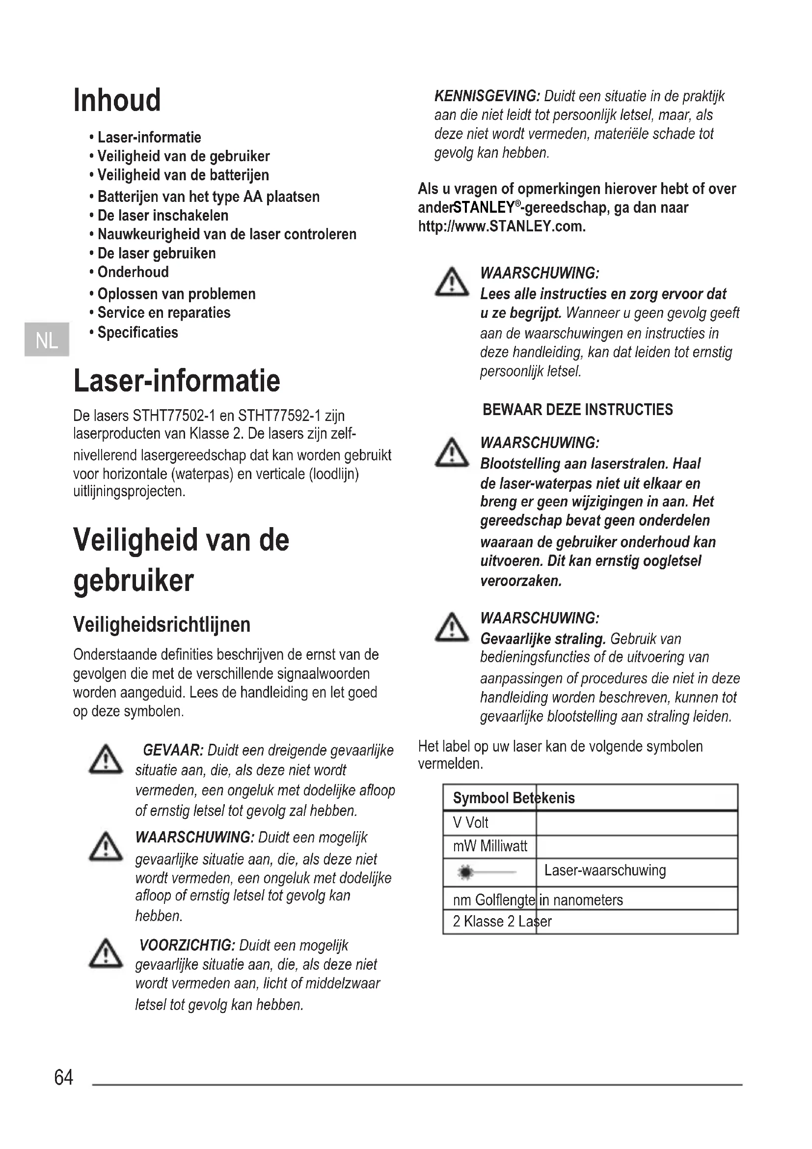 - Specicaties Laser-informatie De lasers STHT77502-1 en STHT77592-1 zijn laserproducten van Klasse 2. De lasers zijn zelf- nivellerend lasergereedschap dat kan worden gebruikt voor horizontale (waterpas) en verticale (loodlijn) uitlijningsprojecten. Veiligheid van de gebruiker Veiligheidsrichtlijnen Onderstaande denities beschrijven de ernst van de gevolgen die met de verschillende signaalwoorden worden aangeduid. Lees de handleiding en let goed op deze symbolen. GEVAAR: Duidt een dreigende gevaarlijke situatie aan, die, als deze niet wordt vermeden, een ongeluk met dodelijke aoop of ernstig letsel tot gevolg zal hebben. WAARSCHUWING: Duidt een mogelijk gevaarlijke situatie aan, die, als deze niet wordt vermeden, een ongeluk met dodelijke aoop of ernstig letsel tot gevolg kan hebben. VOORZICHTIG: Duidt een mogelijk gevaarlijke situatie aan, die, als deze niet wordt vermeden aan, licht of middelzwaar letsel tot gevolg kan hebben. KENNISGEVING: Duidt een situatie in de praktijk aan die niet leidt tot persoonlijk letsel, maar, als deze niet wordt vermeden, materiële schade tot gevolg kan hebben. Als u vragen of opmerkingen hierover hebt of over ander STANLEY