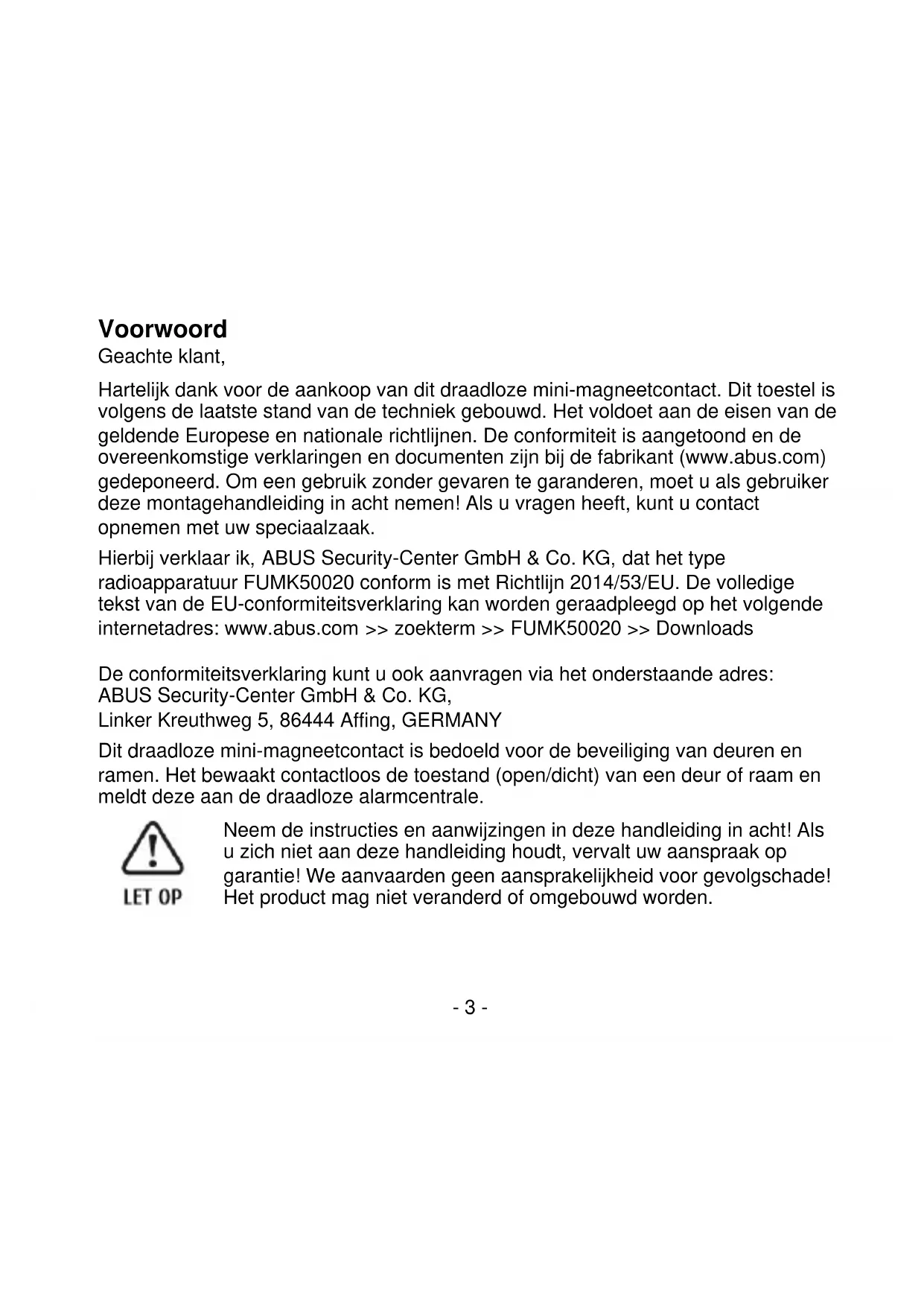 Installationsanleitung [DE] Mini-Funk-Öffnungsmelder Installation instructions [GB] Mini wireless opening detector Instructions d'installation [FR] Mini contact d'ouverture radio Installatiehandleiding [NL] Draadloos mini-magneetcontact Installationsvejledning [DK] trådløs mini-åbningsføler Istruzioni per l'installazione [IT] Mini rivelatore di apertura senza fil- 2 - Inhoud Voorwoord ........................................................................................- 3 - Aanwijzingen over de batterij ..........................................................- 4 - Veiligheidsinstructies ......................................................................- 4 - Leveringsomvang ............................................................................- 5 - Technische gegevens ......................................................................- 5 - Inbedrijfstelling ................................................................................- 6 - Melder in zones inlezen ...................................................................- 6 - Bereik ...............................................................................................- 7 - Montagelocatie .................................................................................- 7 - Montage ............................................................................................- 9 - Batterijen vervangen ...................................................................... - 12 -- 3 - Voorwoord Geachte klant, Hartelijk dank voor de aankoop van dit draadloze mini-magneetcontact. Dit toestel is volgens de laatste stand van de techniek gebouwd. Het voldoet aan de eisen van de geldende Europese en nationale richtlijnen. De conformiteit is aangetoond en de overeenkomstige verklaringen en documenten zijn bij de fabrikant (www.abus.com) gedeponeerd. Om een gebruik zonder gevaren te garanderen, moet u als gebruiker deze montagehandleiding in acht nemen! Als u vragen heeft, kunt u contact opnemen met uw speciaalzaak. Hierbij verklaar ik, ABUS Security-Center GmbH & Co. KG, dat het type radioapparatuur FUMK50020 conform is met Richtlijn 2014/53/EU. De volledige tekst van de EU-conformiteitsverklaring kan worden geraadpleegd op het volgende internetadres: www.abus.com >> zoekterm >> FUMK50020 >> Downloads De conformiteitsverklaring kunt u ook aanvragen via het onderstaande adres: ABUS Security-Center GmbH & Co. KG, Linker Kreuthweg 5, 86444 Affing, GERMANY Dit draadloze mini-magneetcontact is bedoeld voor de beveiliging van deuren en ramen. Het bewaakt contactloos de toestand (open/dicht) van een deur of raam en meldt deze aan de draadloze alarmcentrale. Neem de instructies en aanwijzingen in deze handleiding in acht! Als u zich niet aan deze handleiding houdt, vervalt uw aanspraak op garantie! We aanvaarden geen aansprakelijkheid voor gevolgschade! Het product mag niet veranderd of omgebouwd worden.- 4 - Aanwijzingen over de batterij Het toestel wordt gevoed met gelijkspanning uit een 3,6V-lithiumbatterij. Om een lange levensduur te garanderen en brand en verwondingen te voorkomen, dient u de volgende aanwijzingen in acht te nemen: Gooi de batterij niet bij het huishoudelijke afval. Stel de batterij niet bloot aan een warmtebron of aan direct invallend zonlicht. De batterij mag niet worden verbrand. Laat de batterij niet met water in aanraking komen. Demonteer de batterij niet. Doorboor de batterij niet. Voorkom dat de batterij beschadigd raakt. De batterijcontacten mogen niet kortgesloten worden. De batterij mag niet in de handen van kleine kinderen terechtkomen. De batterij is niet herlaadbaar. Veiligheidsinstructies Het gehele product mag niet veranderd of omgebouwd worden. Bovendien moet worden vermeden om de printplaat met de vingers aan te raken. Voorzichtig bij het omgaan met magneten: gevaar voor inklemmen van de vingers! Product uit de buurt van kinderen houden omdat zij kleine onderdelen van het product kunnen inslikken. Vooral als de magneet wordt ingeslikt, moet meteen een arts worden geraadpleegd. Creditcards of bankpasjes met magneetstrook kunnen worden beschadigd. Voor personen met pacemaker, defibrillator of andere geïmplanteerde apparaten geldt: de magneet kan deze apparaten negatief beïnvloeden, daarom moet vooral- 5 - bij de montage voldoende afstand (ca. 20 cm) tussen magneet en geïmplanteerd apparaat worden aangehouden. Leveringsomvang