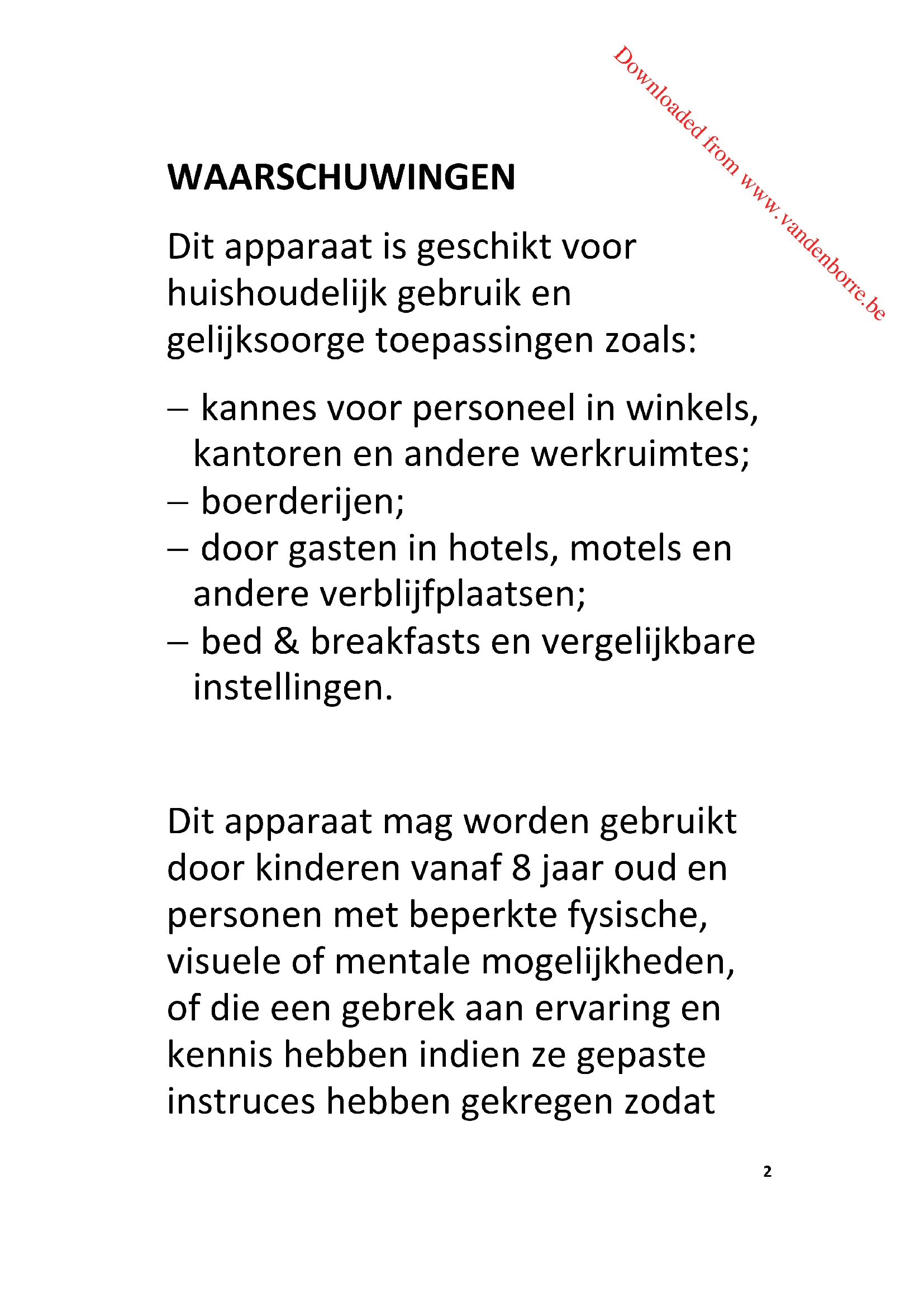Downloaded from www.vandenborre.beVERWIJDERING Als verantwoordelijke handelaar dragen we zorg voor het milieu. We moedigen u aan om de juiste verwijderingsprocedure voor uw apparaat en verpakkingsmateriaal te volgen. Dit draagt bij tot het behoud van de natuurlijke rijkdommen door deze te recyclen zodat zowel de menselijke gezondheid en het milieu worden beschermd. Gooi dit apparaat en de verpakking weg in overeenstemming met de geldende wetgeving en voorschriften. Aangezien dit apparaat elektronische componenten bevat moet het apparaat en toebehoren aan het einde van hun levensduur afzonderlijk van het huisafval worden weggegooid. Neem contact op met uw gemeente voor informatie over afdanking en recycling. Lever het apparaat in bij het inzamelpunt van uw gemeente voor recycling. Bij sommige inzamelpunten kunt u het apparaat gratis inleveren. Hotline Vanden orre De dienst na verkoop is bereikbaar van maandag tot zaterdag op +32 2 334 00 00