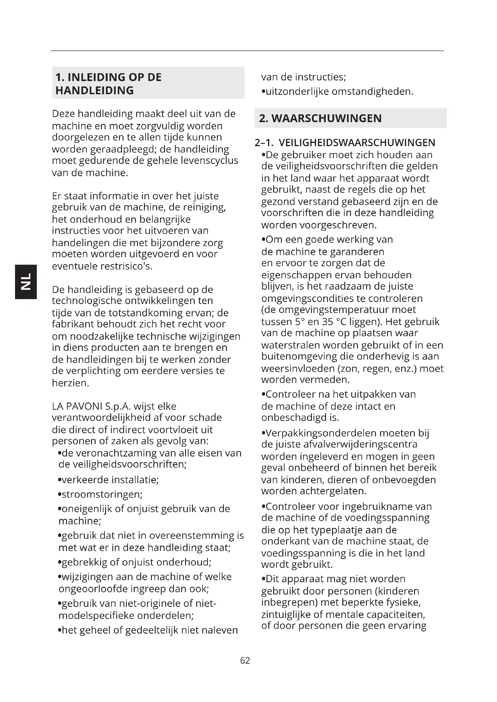 HANDLEIDING Deze handleiding maakt deel uit van de machine en moet zorgvuldig worden doorgelezen en te allen tijde kunnen worden geraadpleegd; de handleiding moet gedurende de gehele levenscyclus van de machine. Er staat informatie in over het juiste gebruik van de machine, de reiniging, het onderhoud en belangrijke instructies voor het uitvoeren van handelingen die met bijzondere zorg moeten worden uitgevoerd en voor eventuele restrisico's. De handleiding is gebaseerd op de technologische ontwikkelingen ten tijde van de totstandkoming ervan; de fabrikant behoudt zich het recht voor om noodzakelijke technische wijzigingen in diens producten aan te brengen en de handleidingen bij te werken zonder de verplichting om eerdere versies te herzien. LA PAVONI S.p.A. wijst elke verantwoordelijkheid af voor schade die direct of indirect voortvloeit uit personen of zaken als gevolg van: