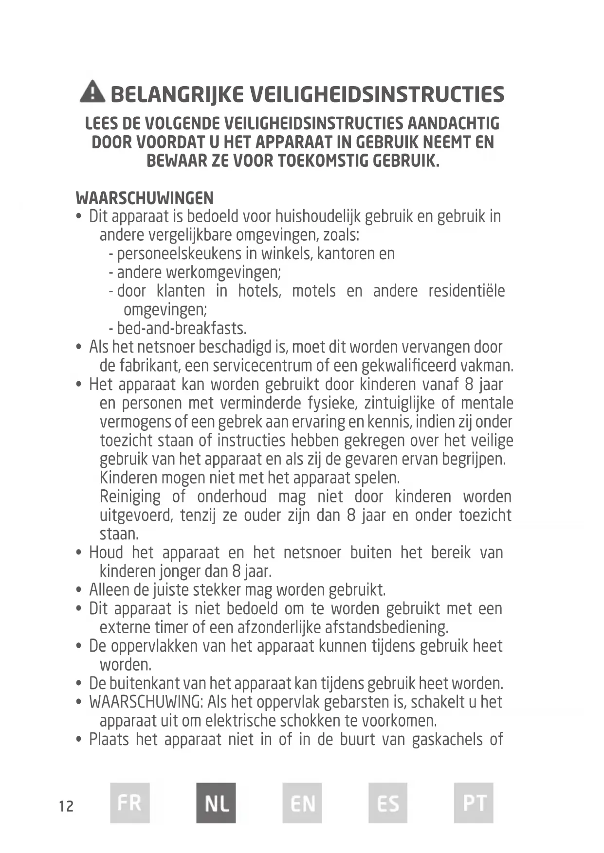 - Het apparaat kan worden gebruikt door kinderen vanaf 8 jaar en personen met verminderde fysieke, zintuiglijke of mentale vermogens of een gebrek aan ervaring en kennis, indien zij onder toezicht staan of instructies hebben gekregen over het veilige gebruik van het apparaat en als zij de gevaren ervan begrijpen. Kinderen mogen niet met het apparaat spelen. Reiniging of onderhoud mag niet door kinderen worden uitgevoerd, tenzij ze ouder zijn dan 8 jaar en onder toezicht staan.