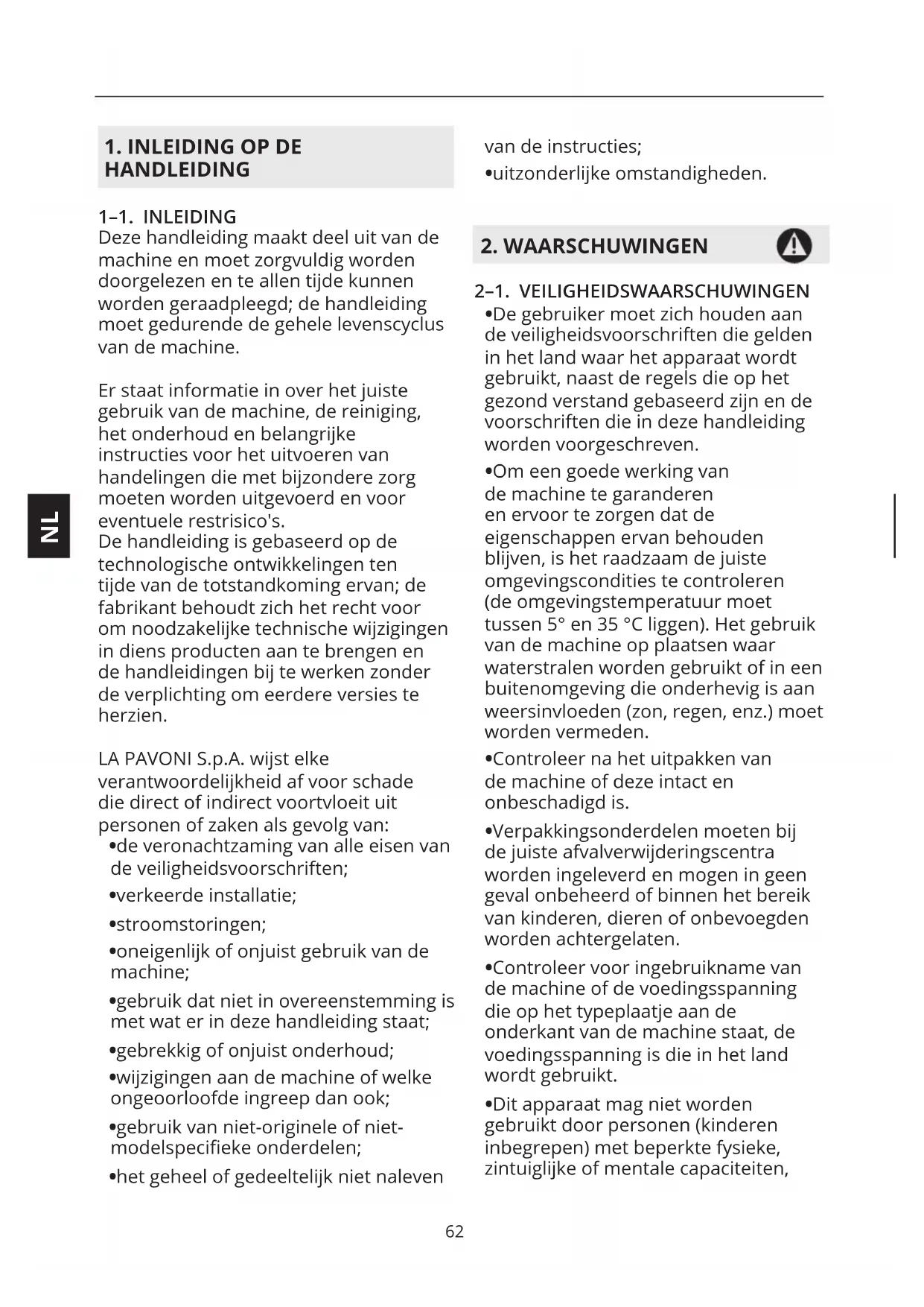 HANDLEIDING 1–1. INLEIDING Deze handleiding maakt deel uit van de machine en moet zorgvuldig worden doorgelezen en te allen tijde kunnen worden geraadpleegd; de handleiding moet gedurende de gehele levenscyclus van de machine. Er staat informatie in over het juiste gebruik van de machine, de reiniging, het onderhoud en belangrijke instructies voor het uitvoeren van handelingen die met bijzondere zorg moeten worden uitgevoerd en voor eventuele restrisico's. De handleiding is gebaseerd op de technologische ontwikkelingen ten tijde van de totstandkoming ervan; de fabrikant behoudt zich het recht voor om noodzakelijke technische wijzigingen in diens producten aan te brengen en de handleidingen bij te werken zonder de verplichting om eerdere versies te herzien. LA PAVONI S.p.A. wijst elke verantwoordelijkheid af voor schade die direct of indirect voortvloeit uit personen of zaken als gevolg van: