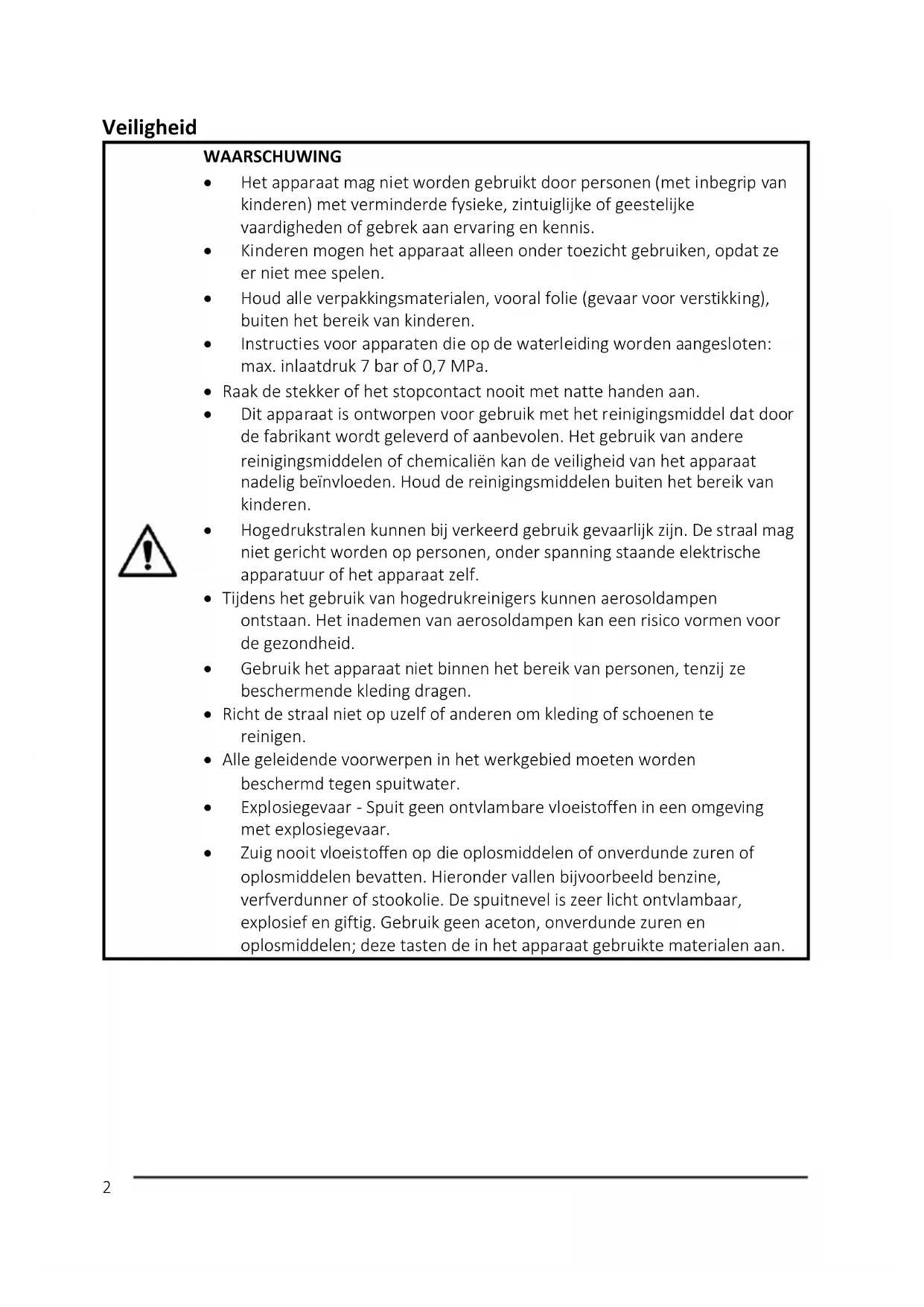 - Hogedrukstralen kunnen bij verkeerd gebruik gevaarlijk zijn. De straal mag niet gericht worden op personen, onder spanning staande elektrische apparatuur of het apparaat zelf.