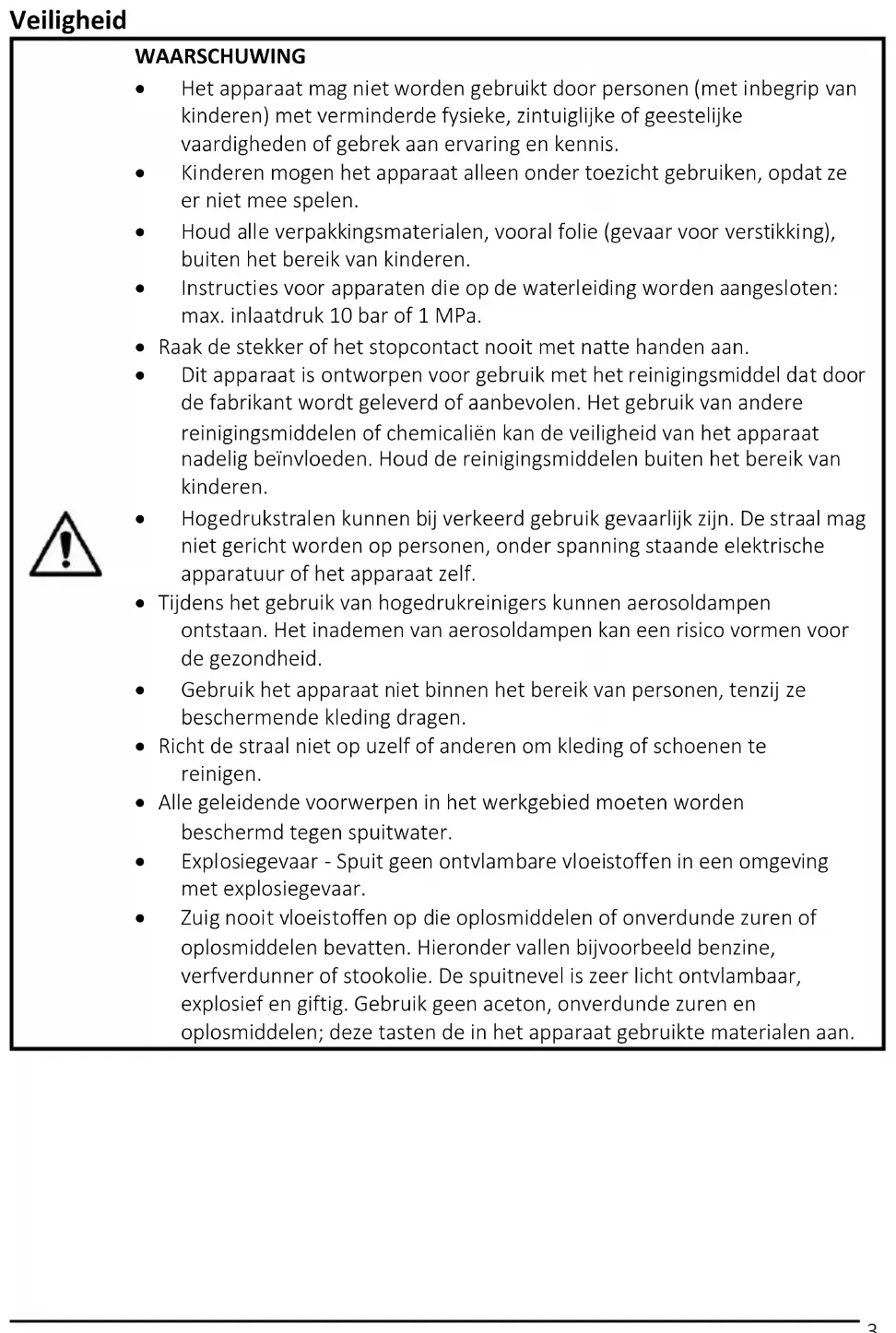 - Hogedrukstralen kunnen bij verkeerd gebruik gevaarlijk zijn. De straal mag niet gericht worden op personen, onder spanning staande elektrische apparatuur of het apparaat zelf.