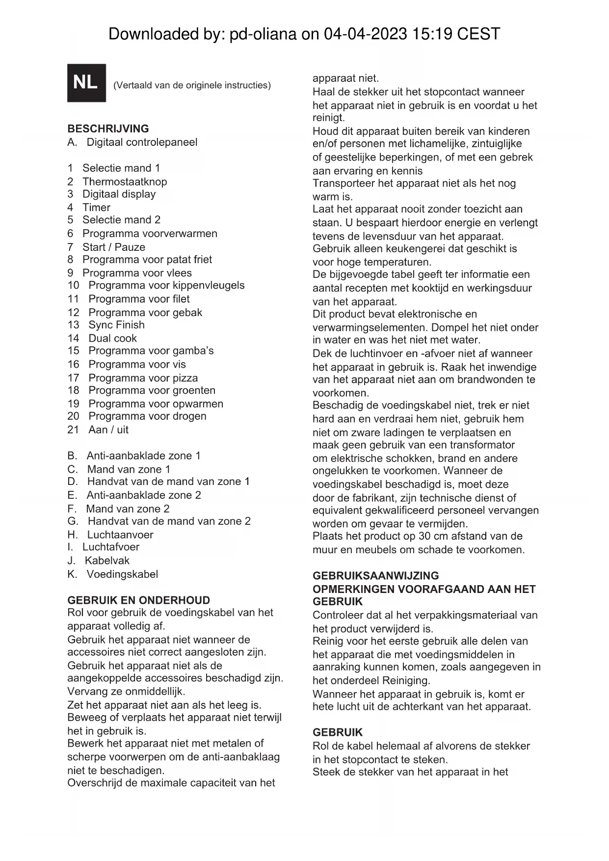 GEBRUIK Controleer dat al het verpakkingsmateriaal van het product verwijderd is. Reinig voor het eerste gebruik alle delen van het apparaat die met voedingsmiddelen in aanraking kunnen komen, zoals aangegeven in het onderdeel Reiniging. Wanneer het apparaat in gebruik is, komt er hete lucht uit de achterkant van het apparaat. GEBRUIK Rol de kabel helemaal af alvorens de stekker in het stopcontact te steken. Steek de stekker van het apparaat in het Downloaded by: pd-oliana on 04-04-2023 15:19 CESTstopcontact. Verwijder de mand (C, F) van de friteuse voorzichtig. Opmerking: manipuleer de mand alleen met de handgreep. Raak de manden niet aan wanneer ze warm zijn. Plaats de producten die u wilt frituren, bakken of koken in de mand (C, F). Plaats de mand weer in het apparaat terug. Zet het apparaat aan met de daarvoor bestemde knop (21). Selecteer de mand met de knoppen voor selectie van de mand (1,5). Selecteer een van de 12 standaardprogramma’s en regel de temperatuur en de tijd bij met de overeenkomstige knoppen, indien nodig (2,4). Wanneer u wilt dat de bereiding van beide manden gelijktijdig eindigt, selecteer “Sync Finish” (13). Deze functie werkt alleen wanneer u beide manden gebruikt. Druk eerst op de genoemde knop (13) en stel beide zones in. Wanneer u beide manden voor eenzelfde type ingrediënten wilt gebruiken, selecteer “Dual Cook” (14), zodat hetzelfde programma wordt gebruikt voor beide zones. Druk om deze functie te activeren op de knop (14) en stel vervolgens het progamma in. Druk op de knop Start / Pauze (7) om te starten met koken. De timer start. Opmerking: denk eraan dat u 3 minuten moet optellen bij de kooktijd wanneer het apparaat koud is. Opmerking: Wanneer u de producten halverwege de kooktijd wilt opschudden, kunt u de mand eenvoudig uit het apparaat halen en de producten opschudden. Dit heeft nauwelijks invloed op het kookproces. WAARSCHUWING: Zowel de mand, de bak, als de ingrediënten zijn ERG heet. Plaats de mand op een oppervlak dat tegen hoge temperaturen kan. Keer de mand om om de ingrediënten te verwijderen zonder risico op brandwonden.