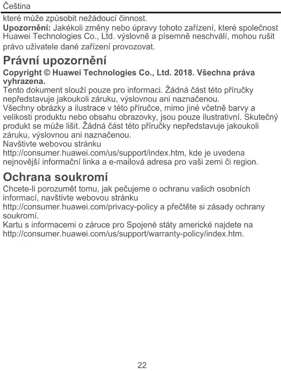 televisieontvangst, hetgeen kan worden vastgesteld door het product uit en in te schakelen, wordt de gebruiker de volgende maatregelen aanbevolen om te proberen de storing te elimineren: --richt de ontvangstantenne opnieuw of verplaats deze; --vergroot de afstand tussen de apparatuur en de ontvanger; --sluit het apparaat aan op een stopcontact van een ander circuit dan dat waarop de ontvanger is aangesloten; --raadpleeg uw dealer of een ervaren radio/tv-monteur. Dit apparaat voldoet aan Deel 15 van de FCC-regels.Het gebruik van dit apparaat is onderworpen aan de volgende twee voorwaarden: (1) dit apparaat dient geen schadelijke interferentie te veroorzaken en (2) dit apparaat dient alle ontvangen interferentie te kunnen weerstaan, inclusief interferentie die een ongewenste werking van het apparaat kan veroorzaken. Let op: Wijzigingen of aanpassingen aan dit apparaat die niet uitdrukkelijk door Huawei Technologies Co., Ltd. zijn goedgekeurd, kunnen de bevoegdheid van de gebruiker voor de bediening van dit apparaat ongeldig maken. Juridische verklaring Copyright © Huawei Technologies Co., Ltd. 2018.Alle rechten voorbehouden. Dit document is alleen bedoeld voor referentiedoeleinden.Niets in deze handleiding vormt een garantie van welke aard dan ook, hetzij expliciet of impliciet. Alle afbeeldingen en illustraties in deze handleiding, inclusief (maar niet uitsluitend) de kleur, afmetingen en scherminhoud van het product, zijn alleen bedoeld ter referentie.Het daadwerkelijke product kan verschillen.Niets in deze handleiding vormt een garantie van welke aard dan ook, hetzij expliciet of impliciet. Ga naar http://consumer.huawei.com/us/support/index.htm voor recent bijgewerkte hotlines en e-mailadressen in uw land of regio. Privacybescherming Kijk op http://consumer.huawei.com/privacy-policy en lees ons privacybeleid om te begrijpen hoe we uw persoonlijke informatie beschermen. Ga voor meer informatie over de garantiekaart in de Verenigde Staten naar http://consumer.huawei.com/us/support/warranty-policy/index.htm.Français