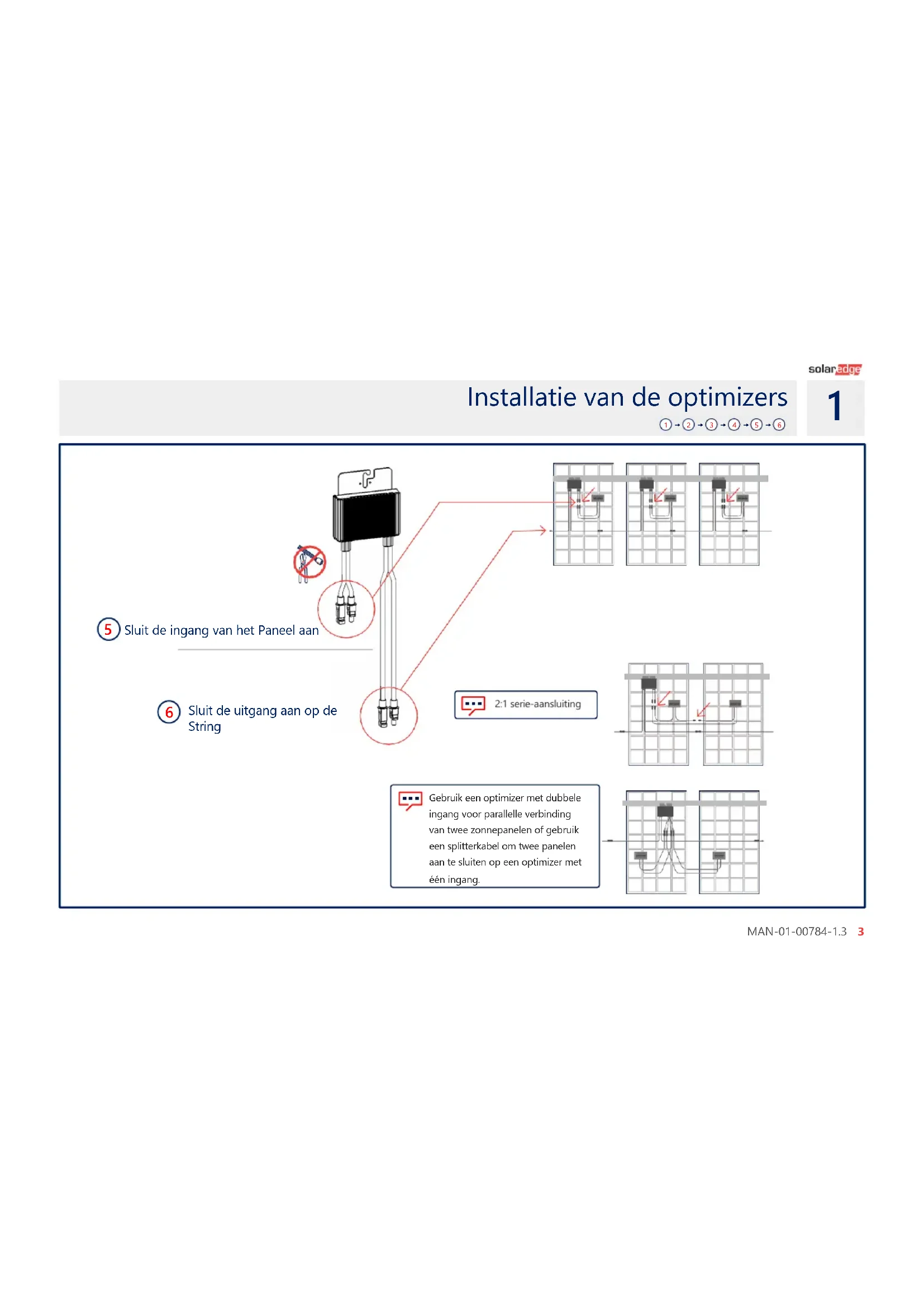 Controleer de polariteit van de opstelling. Controleer 1±0,1V per optimizer Voorbeeld:8 optimizers = ~8V De PV-opstelling aansluiten