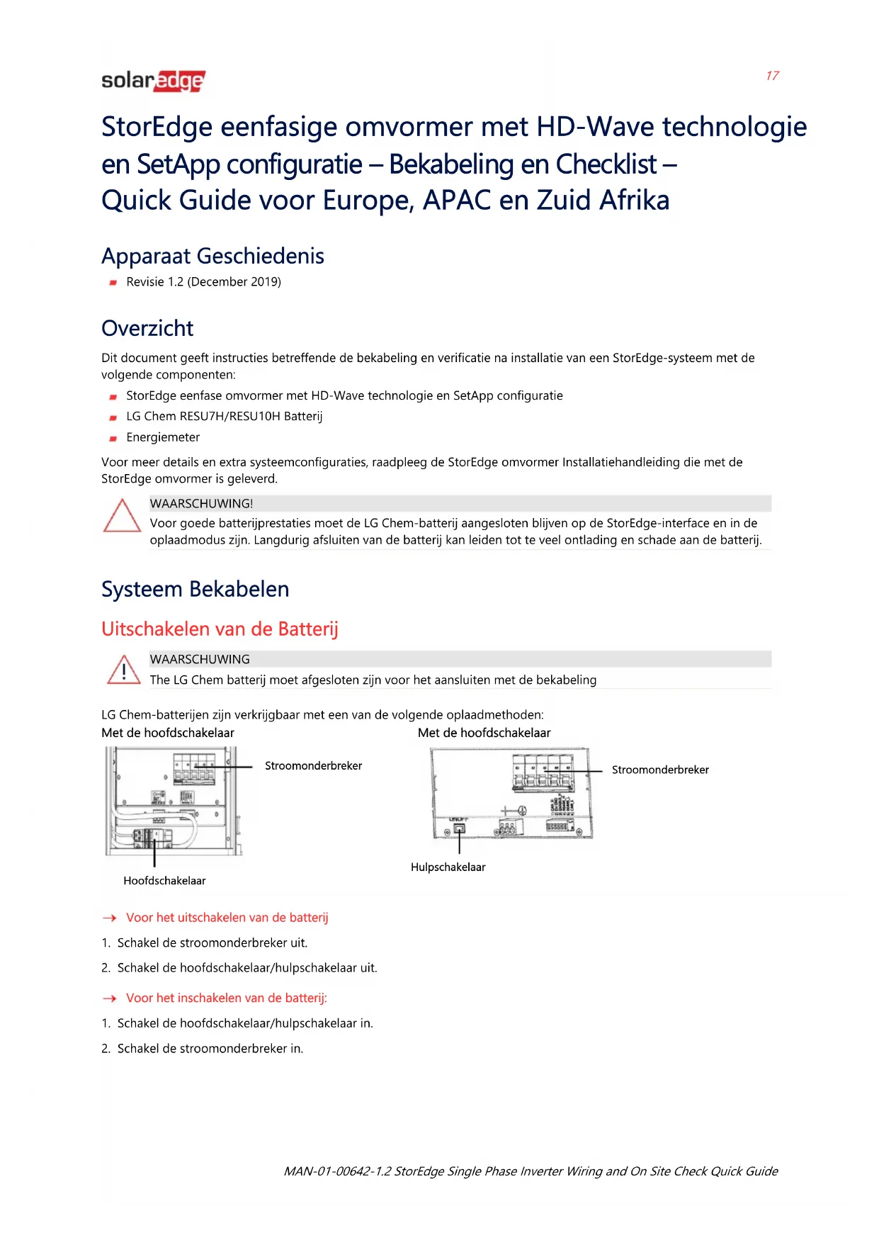 Support en Contactinformatie Als u technische vragen heeft over onze producten, neem dan contact met ons op: http://https://www.solaredge.com/service/support Zorg ervoor dat u de volgende informatie bij de hand hebt voordat u contact opneemt: Model en serienummer van het product in kwestie. De fout die wordt aangegeven op het LCD-scherm van het product of op het monitoringsplatform of door de LED's, indien er een dergelijke indicatie is. Informatie over de systeemconfiguratie, waaronder het type en aantal aangesloten modules en het aantal en de lengte van de strings. De communicatiemethode naar de server, indien de site is aangesloten. De softwareversie van het product zoals deze in het ID-statusscherm verschijnt.Historial de Versiones 21 MAN-01-00642-1.2 StorEdge Single Phase Inverter Wiring and On Site Check Quick Guide Inversor Monofásico StorEdge con Tecnología HD-Wave y Configuración SetApp – Guía Rápida de Cableado y Check List para Europa, APAC y Sudáfrica Historial de Versiones Versión 1.2 (Diciembre 2019) Contenidos Este documento proporciona las instrucciones para cableado y verificaciones después de la instalación de un sistema SolarEdge compuesto por los siguientes equipos: Inversor Monofásico StorEdge Single con Tecnología HD-Wave y Configuración SetApp Batería LG Chem RESU7H/RESU10H Meter Para más detalles e información sobre posibles configuraciones del sistema consultar el Manual de Instalación del Inversor StorEdge suministrado con el equipo.