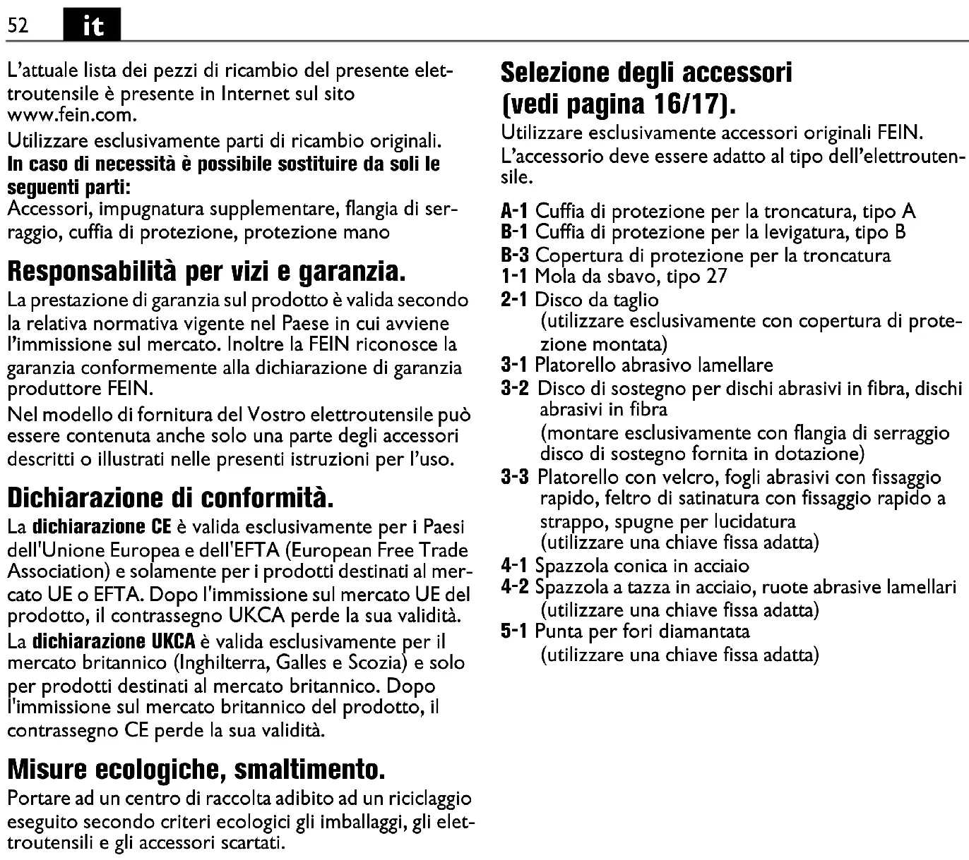 Toebehorenkeuze (zie pagina 16/17). Gebruik uitsluitend origineel FEIN-toebehoren. Het toebehoren moet voor het type elektrisch gereedschap bestemd zijn. A-1 Beschermkap voor doorslijpen, type A B-1 Beschermkap voor doorslijpen, type B B-3 Veiligheidsafscherming voor doorslijpen 1-1 Afbraamschijf, type 27 2-1 Doorslijpschijf (alleen met gemonteerde veiligheidsafscherming gebruiken) 3-1 Lamellenschuurschijf 3-2 Steunschijf voor fiberschuurschijven, fiberschuur- schijven (alleen aanbrengen met meegeleverde steunschijf- spanmiddel) 3-3 Steunschijf met klithechting, hechtende schuurbla- den, hechtend schuurvlies, sponzen (gebruik een passende steeksleutel) 4-1 Staalborstel kegelvorm 4-2 Staalborstel komvorm, lamellenschuurschijven (gebruik een passende steeksleutel) 5-1 Diamantgatsnijder (gebruik een passende steeksleutel)62