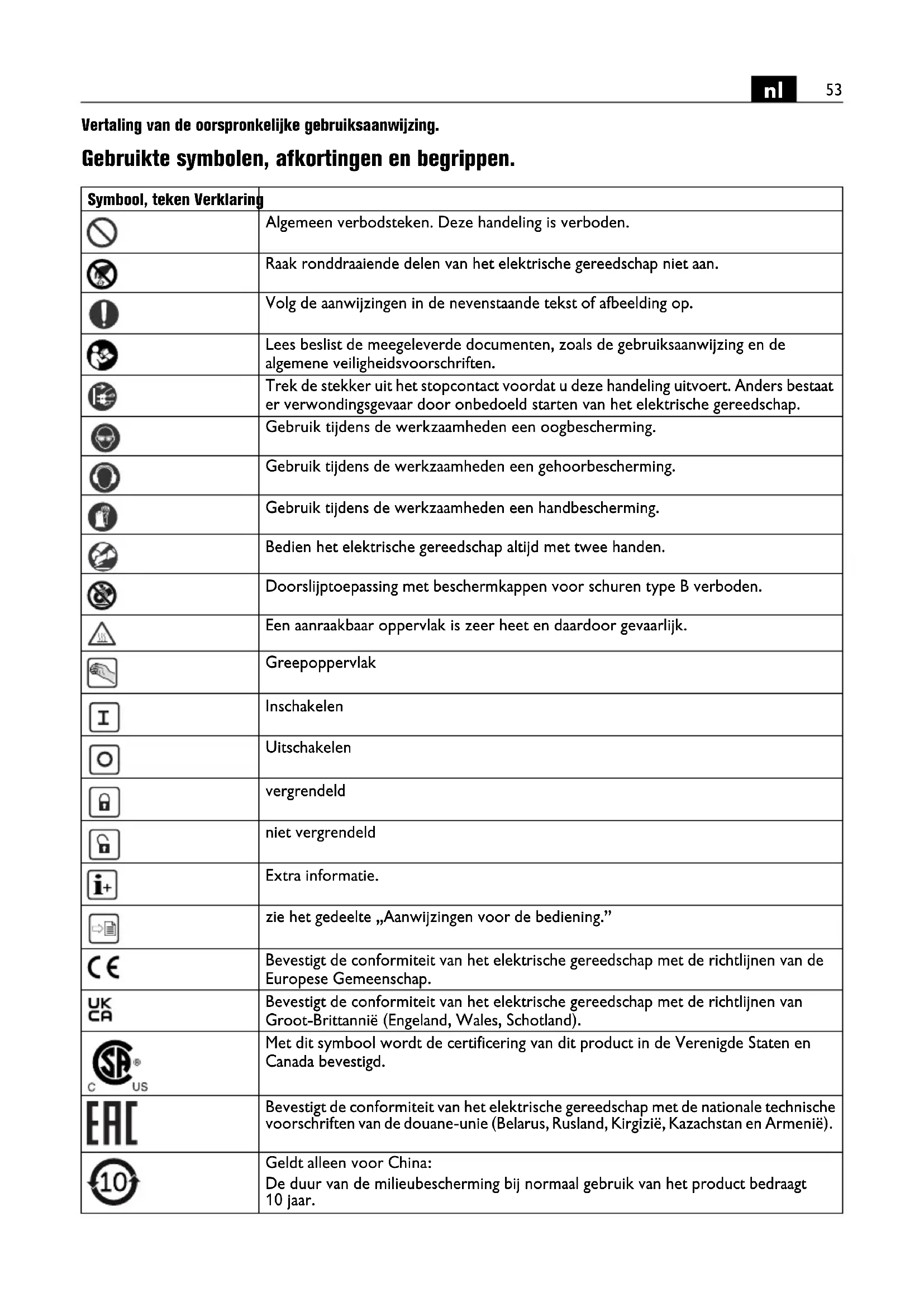 Vertaling van de oorspronkelijke gebruiksaanwijzing. Gebruikte symbolen, afkortingen en begrippen. Symbool, teken Verklaring Algemeen verbodsteken. Deze handeling is verboden. Raak ronddraaiende delen van het elektrische gereedschap niet aan. Volg de aanwijzingen in de nevenstaande tekst of afbeelding op. Lees beslist de meegeleverde documenten, zoals de gebruiksaanwijzing en de algemene veiligheidsvoorschriften. Trek de stekker uit het stopcontact voordat u deze handeling uitvoert. Anders bestaat er verwondingsgevaar door onbedoeld starten van het elektrische gereedschap. Gebruik tijdens de werkzaamheden een oogbescherming. Gebruik tijdens de werkzaamheden een gehoorbescherming. Gebruik tijdens de werkzaamheden een handbescherming. Bedien het elektrische gereedschap altijd met twee handen. Doorslijptoepassing met beschermkappen voor schuren type B verboden. Een aanraakbaar oppervlak is zeer heet en daardoor gevaarlijk. Greepoppervlak Inschakelen Uitschakelen vergrendeld niet vergrendeld Extra informatie. zie het gedeelte „Aanwijzingen voor de bediening.” Bevestigt de conformiteit van het elektrische gereedschap met de richtlijnen van de Europese Gemeenschap. Bevestigt de conformiteit van het elektrische gereedschap met de richtlijnen van Groot-Brittannië (Engeland, Wales, Schotland). Met dit symbool wordt de certificering van dit product in de Verenigde Staten en Canada bevestigd. Bevestigt de conformiteit van het elektrische gereedschap met de nationale technische voorschriften van de douane-unie (Belarus, Rusland, Kirgizië, Kazachstan en Armenië). Geldt alleen voor China: De duur van de milieubescherming bij normaal gebruik van het product bedraagt 10 jaar.54