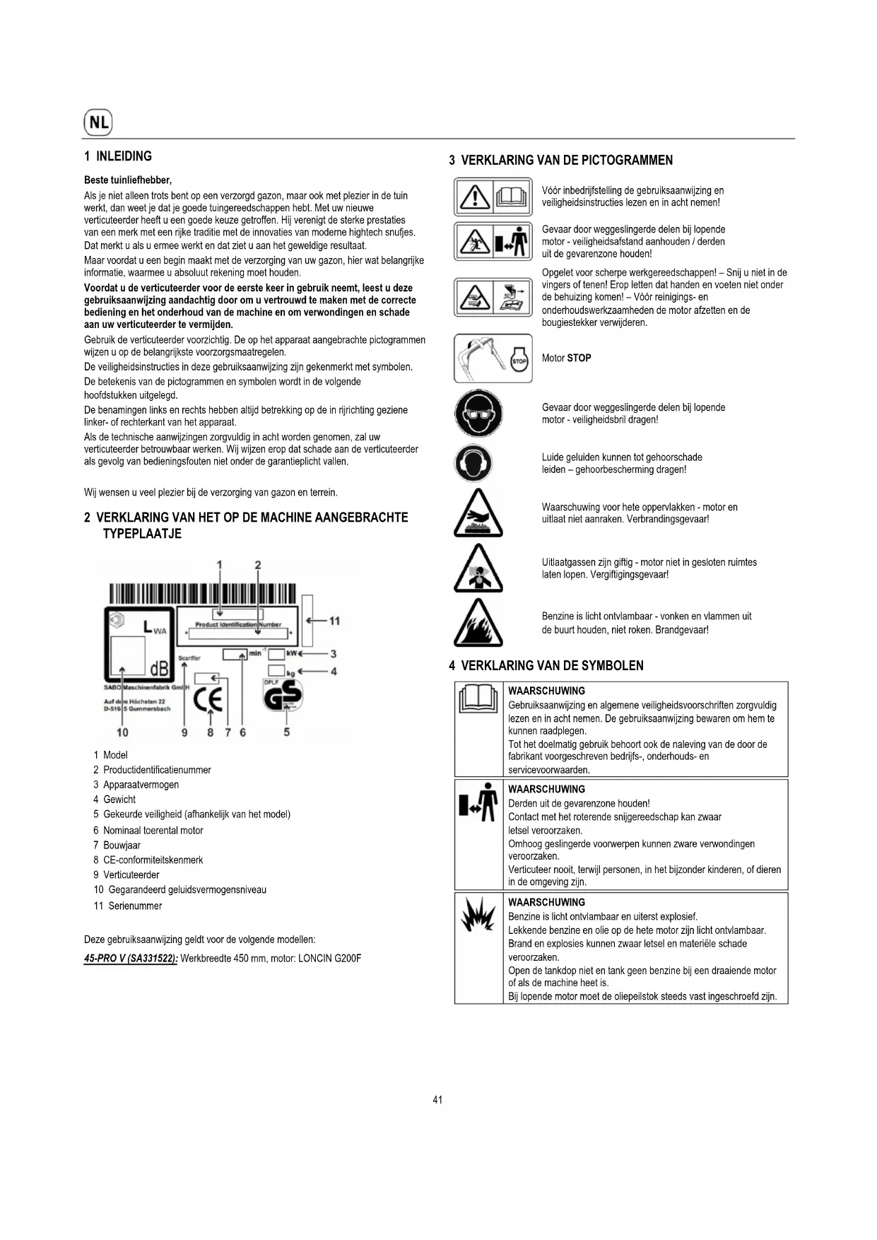 Deze gebruiksaanwijzing geldt voor de volgende modellen: 45-PRO V (SA331522): Werkbreedte 450 mm, motor: LONCIN G200F