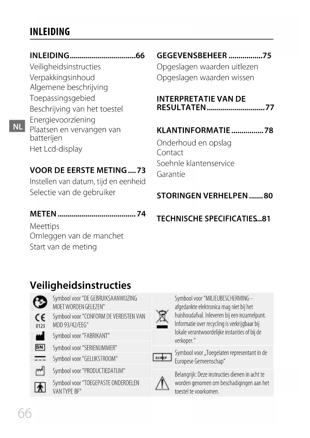 INLEIDING INLEIDING .................................66 Veiligheidsinstructies Verpakkingsinhoud Algemene beschrijving Toepassingsgebied Beschrijving van het toestel Energievoorziening Plaatsen en vervangen van batterijen Het Lcd-display