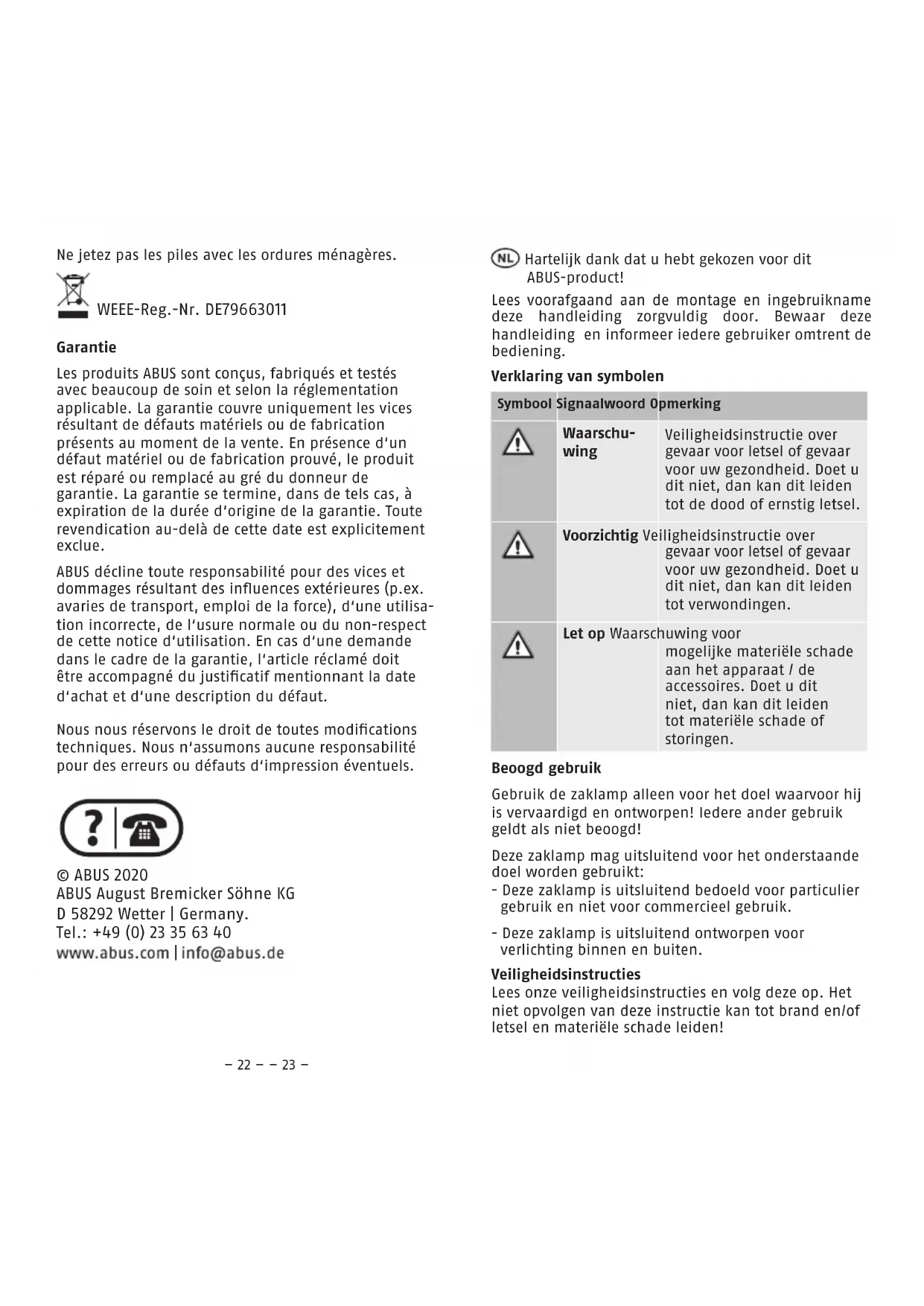WEEE-Reg.-Nr. DE79663011 Hartelijk dank dat u hebt gekozen voor dit ABUS-product! Lees voorafgaand aan de montage en ingebruikname deze handleiding zorgvuldig door. Bewaar deze handleiding en informeer iedere gebruiker omtrent de bediening. Symbool Signaalwoord Opmerking Waarschu- wing Veiligheidsinstructie over gevaar voor letsel of gevaar voor uw gezondheid. Doet u dit niet, dan kan dit leiden tot de dood of ernstig letsel. Voorzichtig Veiligheidsinstructie over gevaar voor letsel of gevaar voor uw gezondheid. Doet u dit niet, dan kan dit leiden tot verwondingen. Let op Waarschuwing voor mogelijke materiële schade aan het apparaat / de accessoires. Doet u dit niet, dan kan dit leiden tot materiële schade of storingen. Verklaring van symbolen Beoogd gebruik Gebruik de zaklamp alleen voor het doel waarvoor hij is vervaardigd en ontworpen! Iedere ander gebruik geldt als niet beoogd! Deze zaklamp mag uitsluitend voor het onderstaande doel worden gebruikt: - Deze zaklamp is uitsluitend bedoeld voor particulier gebruik en niet voor commercieel gebruik. - Deze zaklamp is uitsluitend ontworpen voor verlichting binnen en buiten. Veiligheidsinstructies Lees onze veiligheidsinstructies en volg deze op. Het niet opvolgen van deze instructie kan tot brand en/of letsel en materiële schade leiden!– 24 – – 25 – - Risicogroep 2 volgens EN 62471 WAARSCHUWING! Dit product kan gevaarlijke optische straling uitzenden. Kijk nooit in de lamp als deze is ingeschakeld. Het licht is zeer fel en kan het netvlies van de ogen beschadigen als je er direct naar kijkt. (gevaar voor blindheid!) - Houd de zaklamp zo vast, dat u en andere mensen niet worden verblind! - Verblind nooit andere mensen moedwillig of richt de lichtbundel nooit in de richting van rijdende voertuigen, vliegtuigen of raketten. Als weggebruikers worden verblind, bestaat er een hoge kans op ongevallen! - Waarschuwing voor stroboscooplicht: Flitslicht (stroboscoopeect) kan bij sommige mensen leiden tot epileptische aanvallen of auwvallen. Dit kan ook voorkomen bij mensen die nooit eerder epileptische aanvallen hebben gehad. Richt nooit het stroboscooplicht van de lamp op zulke personen, er bestaat levensgevaar! Richt het stroboscooplicht nooit op rijdende voertuigen, vliegtuigen of raketten. Als bij u of een ander persoon symptomen optreden van epilepsie, neem dan onmiddellijk contact op met een arts. - Deze zaklamp hee een hoog eigen gewicht. Gooi deze zaklamp niet naar mensen of dieren, sla er niet mee tegen mensen of dieren en laat hem niet op dieren of mensen vallen. Houd de zaklamp bij de lus vast en leg de zaklamp alleen op rechte opper- vlakken om te voorkomen dat hij per ongeluk valt. - De reector van de zaklamp wordt erg warm. Leg de zaklamp daarom niet op brandbare voorwerpen (bijv. papier) en raak de reector niet aan. Dek de lamp nooit af! Gevaar voor warmte- accumulatie. - Open de reector niet (gevaar voor verbranding en brand!) Waarschu- wing - Deze zaklamp mag niet onder water worden gebruikt. - Houd de verpakking uit de buurt van kinderen. Er bestaat gevaar voor verstikking! - Batterijen mogen niet in de handen van kleine kinderen terechtkomen. Kinderen kunnen batterijen in hun mond steken en doorslikken. Dit kan ernstige schade aan de gezondheid toebrengen. Neem in dergelijke gevallen direct contact op met een arts! - Risico op brandwonden en oogletsel bij contact met lekkende of beschadigde batterijen! Gebruik in dat geval geschikte veiligheidshandschoenen en reinig het batterijvak met een droge doek. - Batterijen mogen nooit uit elkaar worden gehaald, doorboord, beschadigd, kort- gesloten, verhit of in open vuur worden gegooid (explosiegevaar!). - Gebruik deze zaklamp niet als hij zichtbare schade of storingen vertoont. - Houd deze zaklamp uit de buurt van kinderen en mensen die hem niet goed kunnen bedienen. - Deze zaklamp is geen speelgoed. - Deze zaklamp is niet geschikt voor het verlichten van kamers in een huis. - Alleen de fabrikant (ABUS) mag zaklamp repareren. - Houd deze zaklamp uit de buurt van zout water. Zout water kan zowel de lamp als de batterijen beschadigen en storingen veroorzaken. - Omdat het een elektronisch product is, kiest u als gebruiksomgeving een plaats waar u uw smartphone zou gebruiken. - Bewaar de zaklamp op een droge plaats, uit de buurt van direct zonlicht of overmatige hitte en buiten het bereik van kinderen. Let op Voorzich- tig– 26 – – 27 – - Gebruik voor de reiniging van de zaklamp geen agressieve reinigingsmiddelen! - Dompel de zaklamp nooit onder in water, reinigingsmiddelen of andere vloeistoen. Maak de zaklamp nooit onder stromend water schoon. - Borstels van nylon borstelharen, metalen borstelharen of andere harde oppervlakken en hulpmiddelen zoals ruwe reinigings- sponzen, messen, krabbers en dergelijke kunnen het oppervlak beschadigen en zo de zaklamp beschadigen of storingen veroorzaken. - Wij raden aan om stof en vuil van de zaklamp te verwijderen met een zachte, droge doek, zo nodig met een licht bevochtigde doek. - Als de zaklamp lange tijd niet wordt gebruikt, verwijder dan de batterijen. Eerste inbedrijfstelling