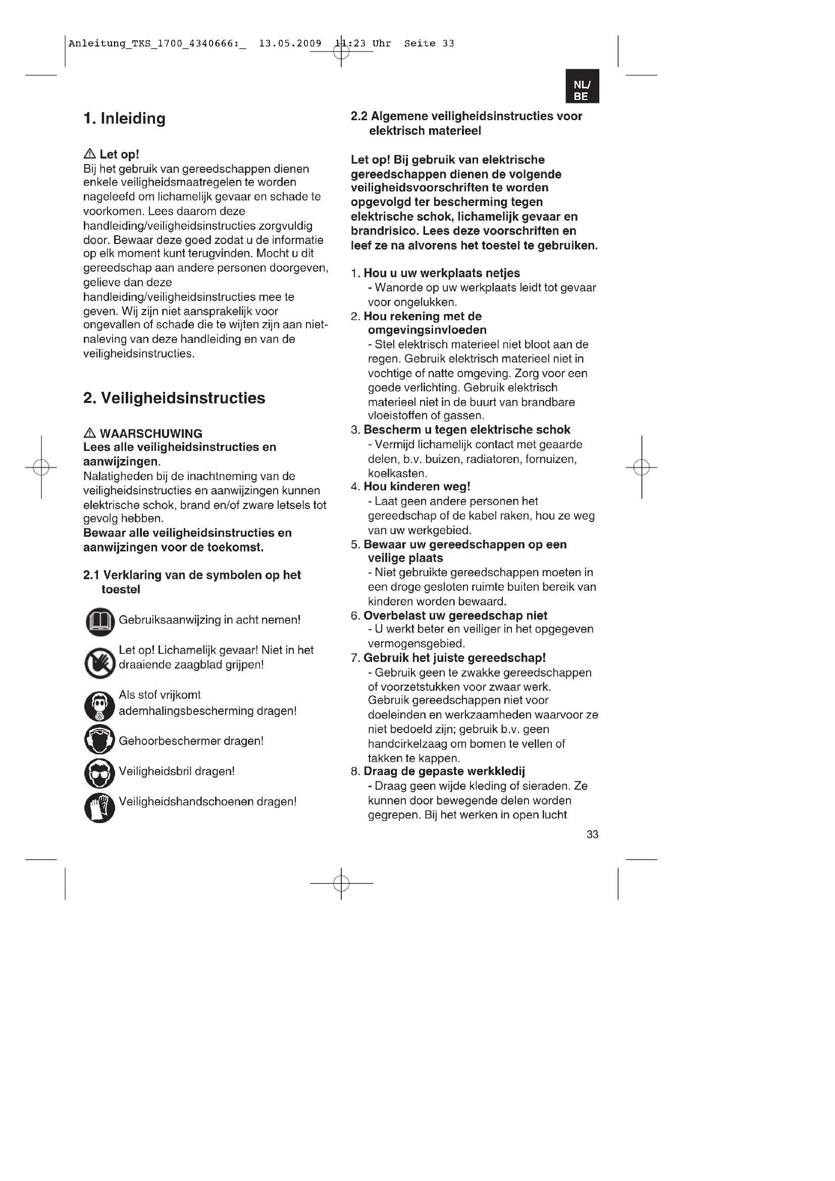 - Gebruik bij stofverwekkende werkzaamheden een stofmasker. 10.Onttrek de kabel niet aan zijn eigenlijke bestemming - Draag het gereedschap niet aan de kabel en gebruik de kabel niet om de stekker uit het stopcontact te trekken. Bescherm de kabel tegen hitte, olie en scherpe kanten. 11.Beveilig het werkstuk - Gebruik spaninrichtingen of een bankschroef teneinde het werkstuk vast te zetten. Het wordt zodoende veiliger vastgehouden dan met uw hand en maakt het mogelijk de machine met de beide handen te bedienen. 12.Rek uw standbereik niet uit - Vermijd elke abnormale lichaamshouding Zorg voor een veilige stand en bewaar steeds uw evenwicht. 13.Onderhoud uw gereedschap zorgvuldig - Hou uw gereedschappen scherp en schoon om goed en veilig te werken. Neem de onderhoudsvoorschriften en de instructies voor het verwisselen van gereedschappen in acht. Controleer regelmatig de stekker en de kabel en laat deze bij beschadiging door een erkende vakman vervangen. Controleer de verlengkabel regelmatig en vervang beschadigde kabels. Hou handgrepen droog en vrij van olie en vet. 14.Trek de netstekker uit het stopcontact - Bij niet-gebruik, vóór onderhoudswerkzaamheden en vóór het verwisselen van gereedschap zoals b.v. zaagblad, boor en alle soorten van machinegereedschappen. 15.Laat geen gereedschapssleutels steken - Controleer of de sleutels en afstelgereedschappen verwijderd zijn alvorens de zaag aan te zetten. 16.Vermijd een onbedoelde aanloop - Draag geen op het stroomnet aangesloten gereedschappen met de vinger op de schakelaar. Vergewis u er zich van dat de schakelaar bij het aansluiten op het stroomnet uitgeschakeld is. 17.Verlengkabel in open lucht - Gebruik in open lucht enkel daarvoor toegelaten en overeenkomstig gekenmerkte verlengkabels. 18.Wees altijd oplettend - Hou uw werk in het oog. Ga verstandig te werk. Gebruik het gereedschap niet als u er niet met uw aandacht bij bent. 19.Controleer uw toestel op beschadigingen - Voordat u het gereedschap verder gebruikt dient u de veiligheidsinrichtingen of licht beschadigde onderdelen zorgvuldig op hun behoorlijke en reglementaire werkwijze te controleren. Controleer of de bewegelijke onderdelen naar behoren functioneren en niet klem zitten alsook of onderdelen beschadigd zijn. Alle onderdelen moeten naar behoren gemonteerd zijn om de veiligheid van de machine te verzekeren. Beschadigde veiligheidsinrichtingen en onderdelen dienen deskundig door een erkende vakwerkplaats te worden hersteld of vervangen tenzij in de handleidingen anders vermeld. Beschadigde schakelaars dienen door een klantendienst-werkplaats te worden vervangen. Gebruik geen gereedschappen waarvan de schakelaar niet kan worden in- of uitgeschakeld. 20.Let op! - Voor uw eigen veiligheid gebruik enkel accessoires en bijkomende toestellen die vermeld staan in de handleiding of door de fabrikant van het gereedschap worden aanbevolen of opgegeven. Het gebruik van andere inzetgereedschappen of accessoires dan vermeld in de handleiding of in de catalogus kan voor u lichamelijk gevaar betekenen. 21.Herstellingen enkel door de elektrovakman Dit elektrisch gereedschap beantwoordt aan de desbetreffende veiligheidsbepalingen. Herstellingen mogen enkel door een elektrovakman worden verricht, anders kunnen zich ongelukken voor de gebruiker voordoen. Anleitung_TKS_1700_4340666:_ 13.05.2009 11:23 Uhr Seite 34NL/