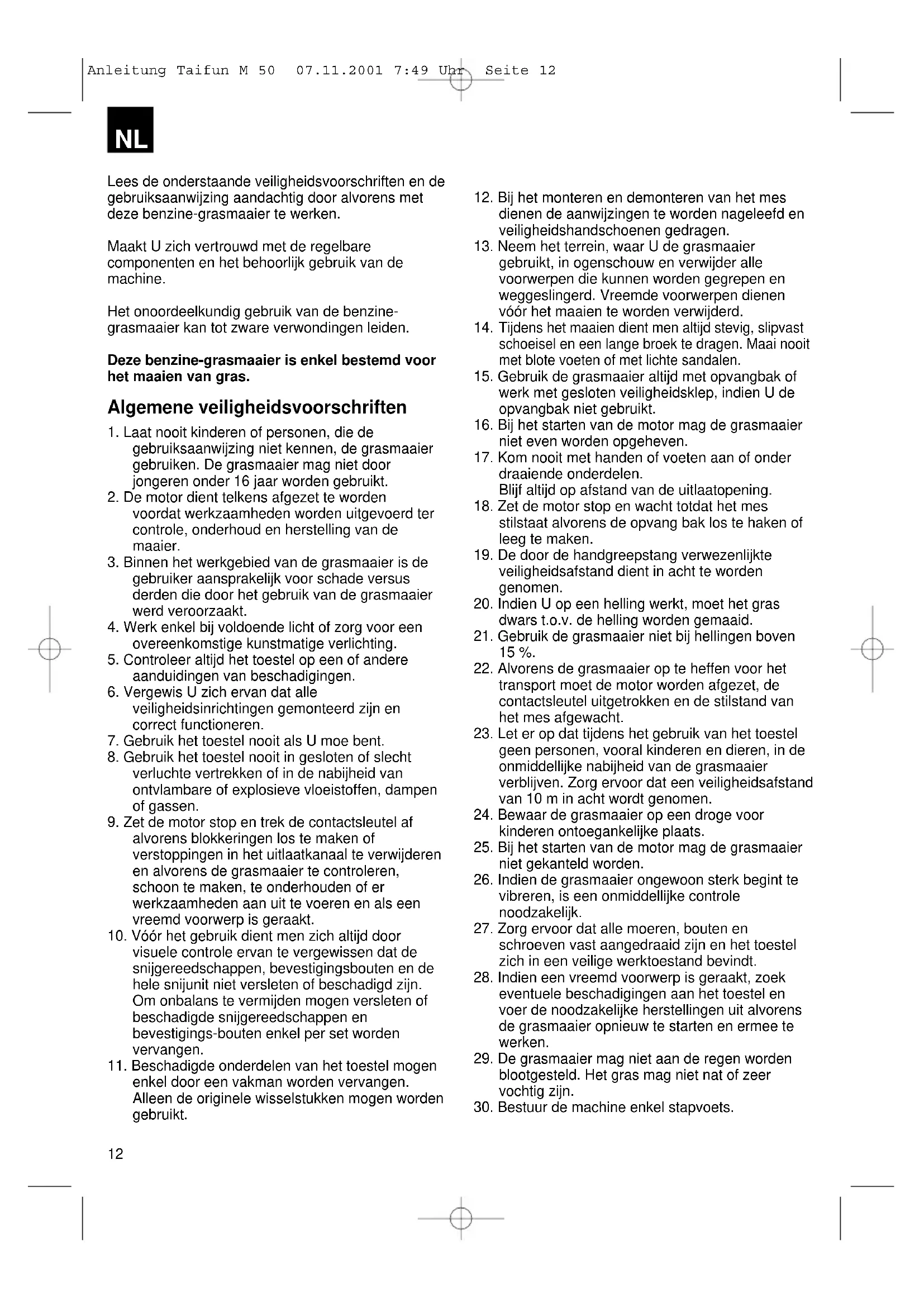 Lees de onderstaande veiligheidsvoorschriften en de gebruiksaanwijzing aandachtig door alvorens met deze benzine-grasmaaier te werken. Maakt U zich vertrouwd met de regelbare componenten en het behoorlijk gebruik van de machine. Het onoordeelkundig gebruik van de benzine- grasmaaier kan tot zware verwondingen leiden. Deze benzine-grasmaaier is enkel bestemd voor het maaien van gras. Algemene veiligheidsvoorschriften