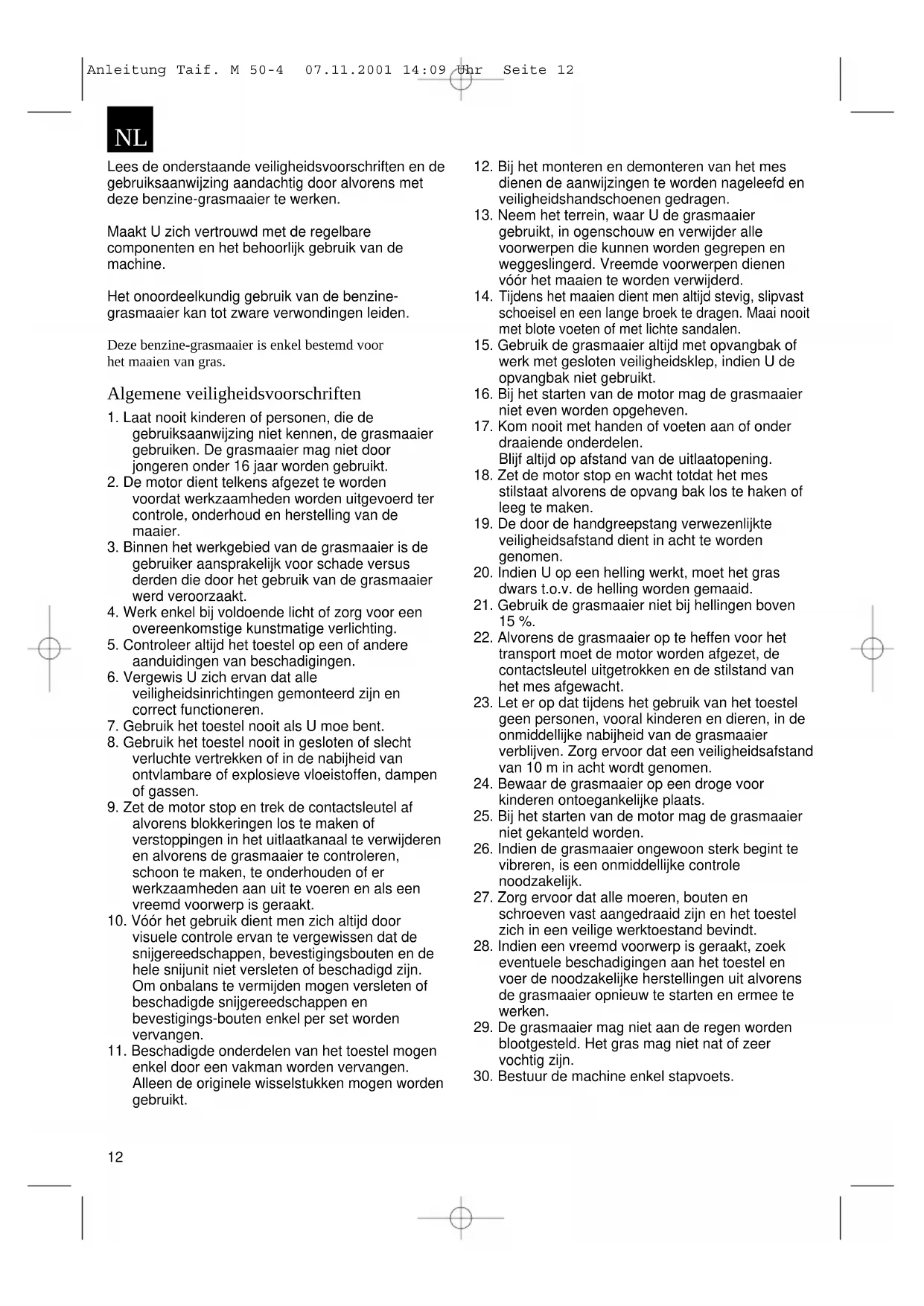Lees de onderstaande veiligheidsvoorschriften en de gebruiksaanwijzing aandachtig door alvorens met deze benzine-grasmaaier te werken. Maakt U zich vertrouwd met de regelbare componenten en het behoorlijk gebruik van de machine. Het onoordeelkundig gebruik van de benzine- grasmaaier kan tot zware verwondingen leiden. Deze benzine-grasmaaier is enkel bestemd voor het maaien van gras. Algemene veiligheidsvoorschriften