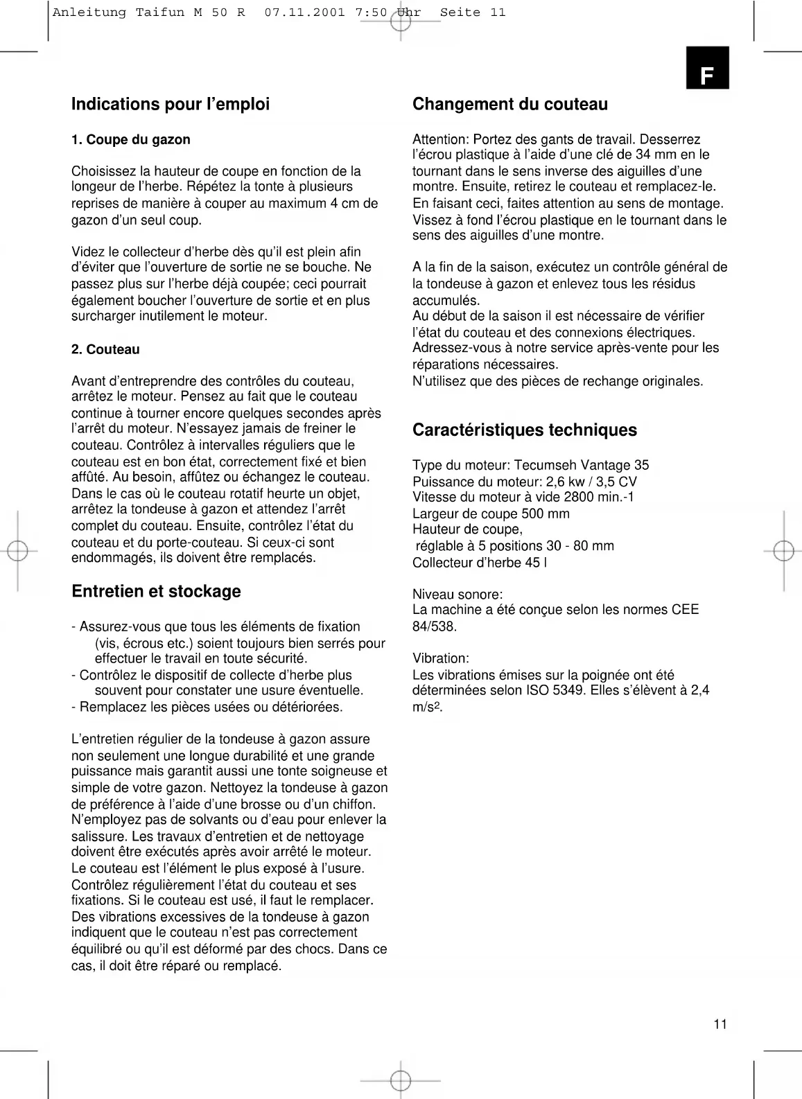 Alvorens een of ander controle van het mes uit te voeren dient U de motor af te zetten. Denk er aan dat het mes na het afzetten van de motor nog enkele seconden blijft draaien. Probeer nooit het mes te stoppen. Controleer regelmatig of het mes behoorlijk bevestigd, in goede staat en goed geslepen is. Als dit niet het geval is, bijslijpen of vervangen. Indien het roterende mes een voorwerp raakt, de grasmaaier stoppen en wachten totdat het mes volledig tot stilstand is gekomen. Controleer dan de toestand van het mes en de meshouder. Indien deze beschadigd zijn, moeten ze worden vervangen. Onderhoud en berging - Zorg er voor dat alle bevestigingselementen (schroeven, moeren etc.) steeds vastgedraaid zijn om met de maaier veilig te kunnen werken. - Controleer de grasvanginrichting dikwijls op slijtageverschijnselen. - Vervang versleten of beschadigde onderdelen. Het regelmatig onderhoud van de grasmaaier verzekert niet alleen voor lange tijd zijn duurzaamheid en functionaliteit maar draagt ook bij tot een zorgvuldig en gemakkelijk maaien van Uw gazon. Maak de grasmaaier indien mogelijk met een borstel of doek schoon. Gebruik geen oplosmiddelen of water om het toestel van vuil te ontdoen. Alle onderhouds- en schoonmaakingrepen dienen te worden uitgevoerd bij afgezette motor en stilstaand mes. Het element dat het meest blootgesteld is aan slijtage is het mes. Controleer regelmatig de toestand van het mes alsook zijn bevestiging. Als het mes versleten is, dient U het te vervangen of bij te slijpen. Indien zich bovenmatige trillingen van de grasmaaier voordoen, betekent dit dat het mes niet behoorlijk uitgebalanceerd is of door schokken vervormd werd. In dit geval moet het mes worden hersteld of vervangen. Vervangen van het mes Let op: Werkhandschoenen dragen. De plastiekmoer met behulp van een sleutel van 34 mm tegen de wijzers van de klok in losmaken, het mes uit trekken en door een nieuw mes vervangen. Daarbij de inbouwrichting nauwkeurig in acht nemen. De plastiekmoer met de wijzers van de klok mee vastdraaien. Aan het eind van het seizoen voert U een algemene inspectie van de grasmaaier uit en verwijdert U alle opgehoopte achterblijfsels. Telkens aan het begin van het seizoen de toestand van het mes controleren. Voor herstellingen wend U zich tot onze klantenservice. Voor het onderhoud alleen originele wisselstukken gebruiken. Technische gegevens Motortype Tecumseh Vantage 35 Motorvermogen 2,6 kW / 3,5 PK Stationair toerental van de motor 2800 t/min Dekbreedte 500 mm Snijhoogte vijfvoudig instelbaar 30 - 80 mm Grasopvangbak 45 l Geluid: De machine is geconstrueerd volgens CEE 84/538. Vibratie: De aan de handgreepstang gemeten trillingen zijn bepaald volgens ISO 5349 en bedragen 2,4 m/s