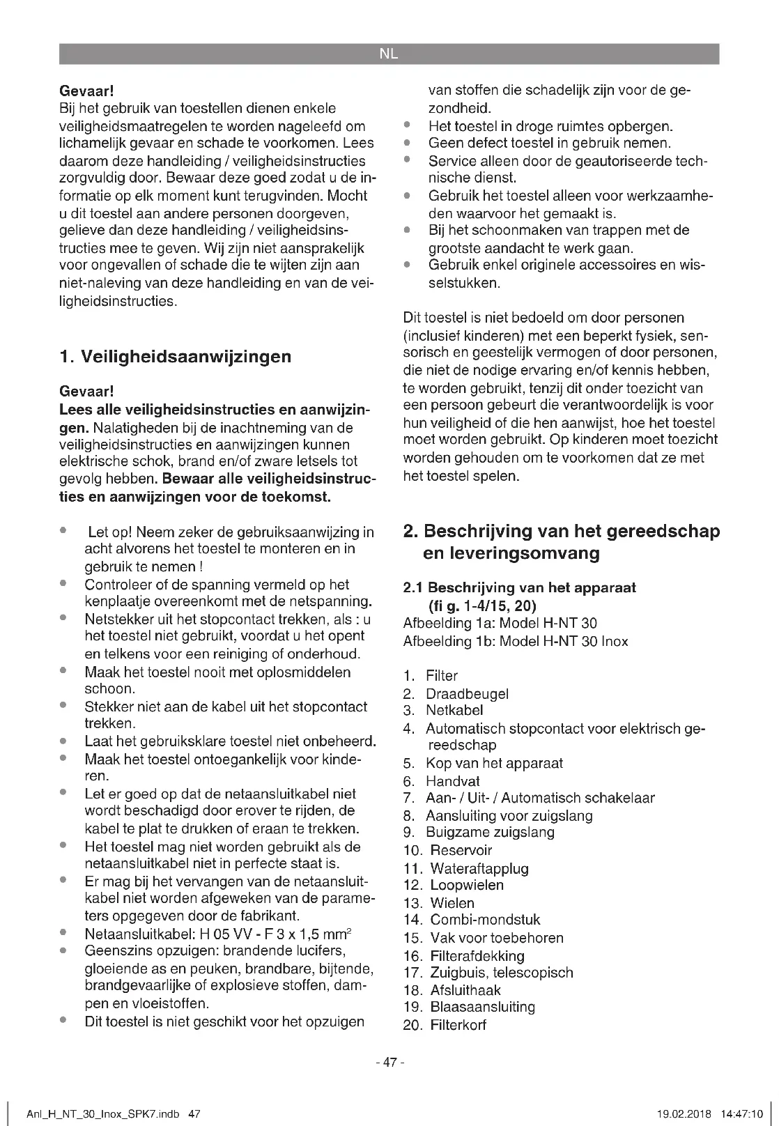 Combi-mondstuk (fi g. 3) Het combi-mondstuk (14) is geschikt voor het afzuigen van vaste stoff en en vloeistoff en op mid- delgrote tot grote oppervlakken. Voegmondstuk (fi g. 3) Het mondstuk voor voegen (23) is geschikt voor het afzuigen van vast stof en vloeistoff en in hoeken, randen en op andere moeilijk toeganke- lijke plaatsen. Kussenmondstuk (fi g. 3) Het kussenmondstuk (26) is met name geschikt voor het afzuigen van vast stof op bekledingen en tapijten. Anl_H_NT_30_Inox_SPK7.indb 49Anl_H_NT_30_Inox_SPK7.indb 49 19.02.2018 14:47:1019.02.2018 14:47:10NL