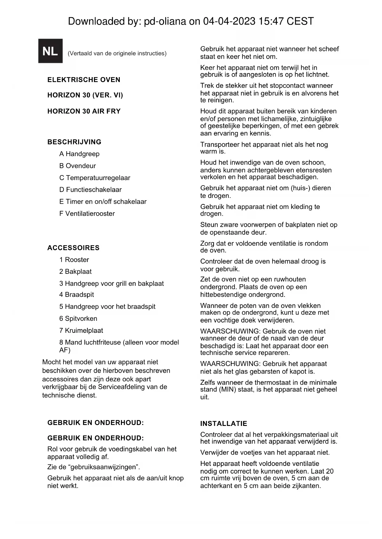 BESCHRIJVING A Handgreep B Ovendeur C Temperatuurregelaar D Functieschakelaar E Timer en on/o schakelaar F Ventilatierooster ACCESSOIRES 1 Rooster 2 Bakplaat 3 Handgreep voor grill en bakplaat 4 Braadspit 5 Handgreep voor het braadspit 6 Spitvorken 7 Kruimelplaat 8 Mand luchtfriteuse (alleen voor model AF) Mocht het model van uw apparaat niet beschikken over de hierboven beschreven accessoires dan zijn deze ook apart verkrijgbaar bij de Serviceafdeling van de technische dienst. GEBRUIK EN ONDERHOUD: GEBRUIK EN ONDERHOUD: Rol voor gebruik de voedingskabel van het apparaat volledig af. Zie de “gebruiksaanwijzingen”. Gebruik het apparaat niet als de aan/uit knop niet werkt. Gebruik het apparaat niet wanneer het scheef staat en keer het niet om. Keer het apparaat niet om terwijl het in gebruik is of aangesloten is op het lichtnet. Trek de stekker uit het stopcontact wanneer het apparaat niet in gebruik is en alvorens het te reinigen. Houd dit apparaat buiten bereik van kinderen en/of personen met lichamelijke, zintuiglijke of geestelijke beperkingen, of met een gebrek aan ervaring en kennis. Transporteer het apparaat niet als het nog warm is. Houd het inwendige van de oven schoon, anders kunnen achtergebleven etensresten verkolen en het apparaat beschadigen. Gebruik het apparaat niet om (huis-) dieren te drogen. Gebruik het apparaat niet om kleding te drogen. Steun zware voorwerpen of bakplaten niet op de openstaande deur. Zorg dat er voldoende ventilatie is rondom de oven. Controleer dat de oven helemaal droog is voor gebruik. Zet de oven niet op een ruwhouten ondergrond. Plaats de oven op een hittebestendige ondergrond. Wanneer de poten van de oven vlekken maken op de ondergrond, kunt u deze met een vochtige doek verwijderen. WAARSCHUWING: Gebruik de oven niet wanneer de deur of de naad van de deur beschadigd is: Laat het apparaat door een technische service repareren. WAARSCHUWING: Gebruik het apparaat niet als het glas gebarsten of kapot is. Zelfs wanneer de thermostaat in de minimale stand (MIN) staat, is het apparaat niet geheel uit. INSTALLATIE Controleer dat al het verpakkingsmateriaal uit het inwendige van het apparaat verwijderd is. Verwijder de voetjes van het apparaat niet. Het apparaat heeft voldoende ventilatie nodig om correct te kunnen werken. Laat 20 cm ruimte vrij boven de oven, 5 cm aan de achterkant en 5 cm aan beide zijkanten. Downloaded by: pd-oliana on 04-04-2023 15:47 CESTGEBRUIKSAANWIJZING