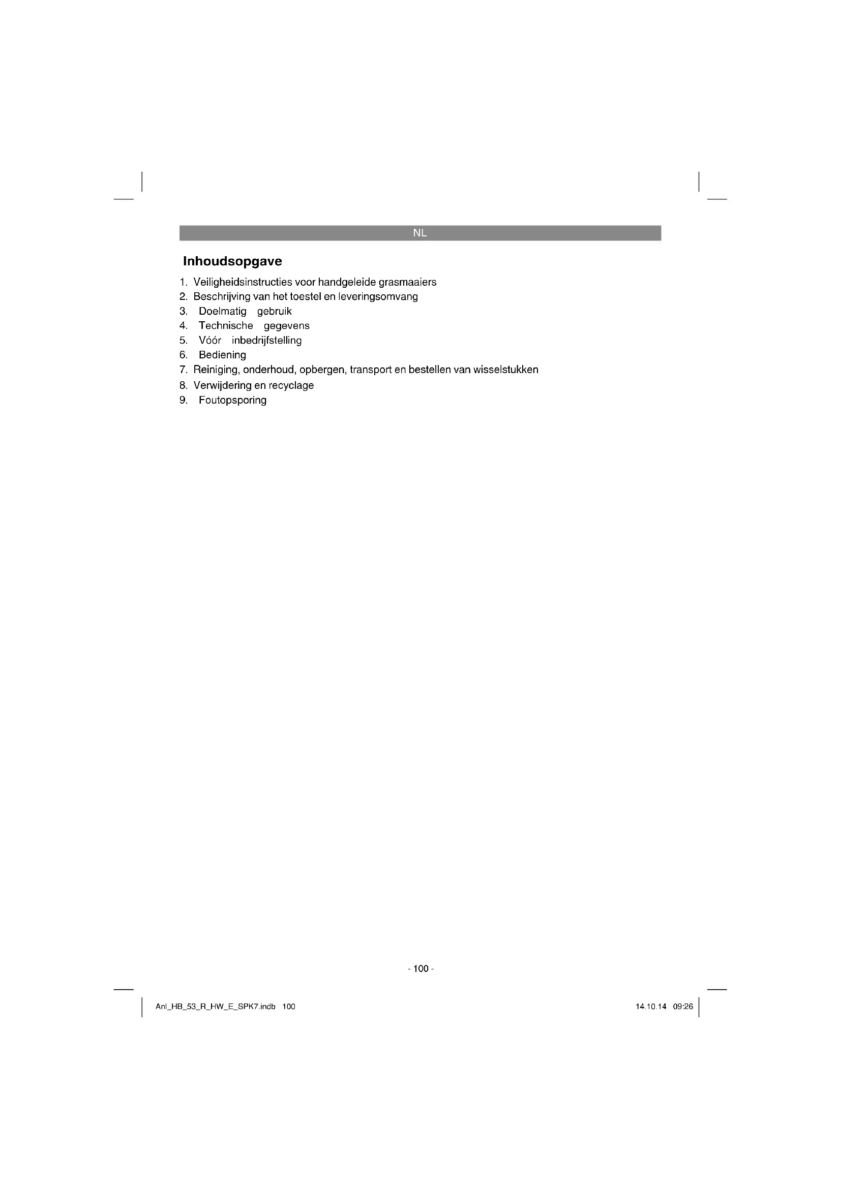 zetten laat u de motor motorstart-/mo- torstophendel los (fi g. 5a, pos. 1a). Trek de bougiestekker af van de bougie om te voorkomen dat de motor start. Controleer vóór het herstarten de trekkabel van de mo- torrem. Controleer of de trekkabel correct gemonteerd is. Een geknikte of beschadigde afzetkabel moet worden vervangen. Anl_HB_53_R_HW_E_SPK7.indb 110Anl_HB_53_R_HW_E_SPK7.indb 110 14.10.14 09:2614.10.14 09:26NL