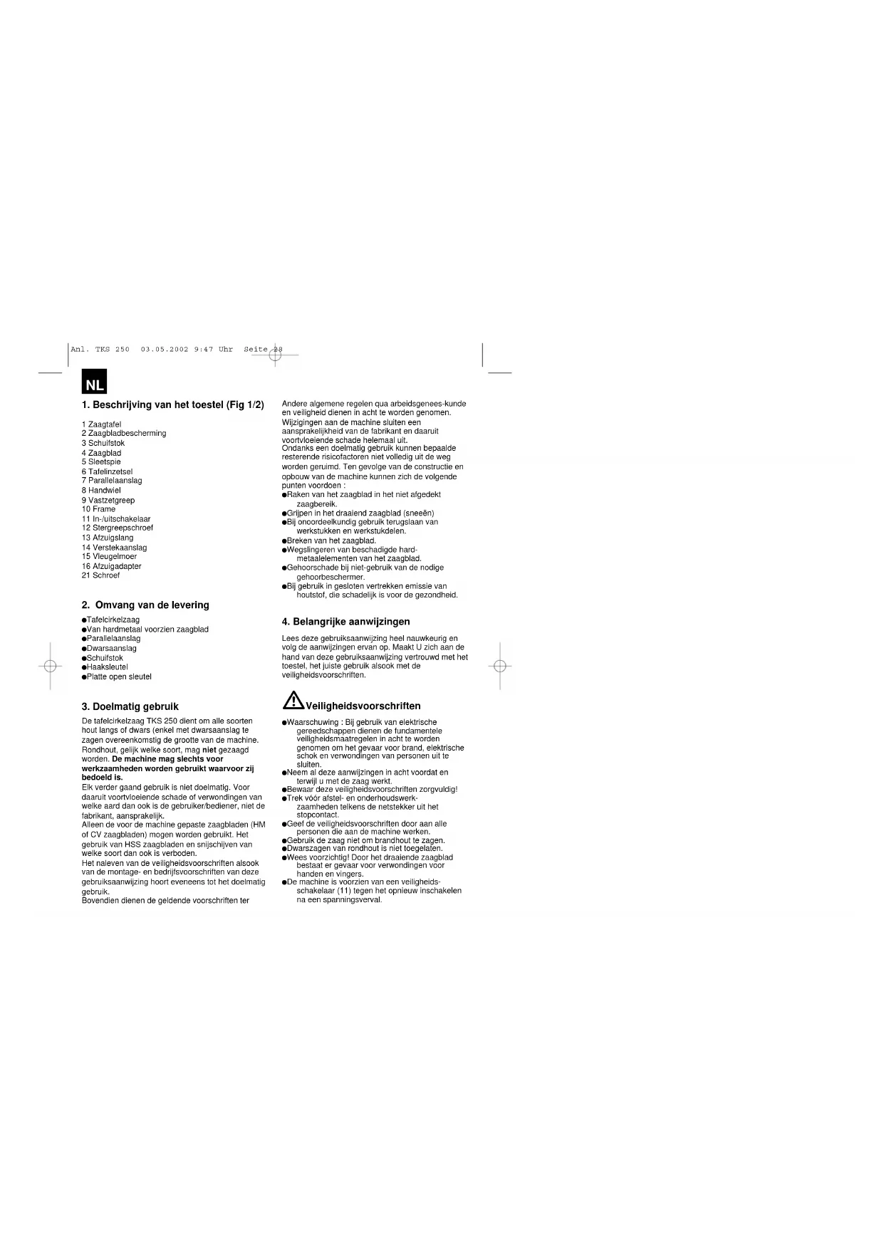 Lees deze gebruiksaanwijzing heel nauwkeurig en volg de aanwijzingen ervan op. Maakt U zich aan de hand van deze gebruiksaanwijzing vertrouwd met het toestel, het juiste gebruik alsook met de veiligheidsvoorschriften. Veiligheidsvoorschriften Waarschuwing : Bij gebruik van elektrische gereedschappen dienen de fundamentele veiligheidsmaatregelen in acht te worden genomen om het gevaar voor brand, elektrische schok en verwondingen van personen uit te sluiten. Neem al deze aanwijzingen in acht voordat en terwijl u met de zaag werkt. Bewaar deze veiligheidsvoorschriften zorgvuldig! Trek vóór afstel- en onderhoudswerk- zaamheden telkens de netstekker uit het stopcontact. Geef de veiligheidsvoorschriften door aan alle personen die aan de machine werken. Gebruik de zaag niet om brandhout te zagen. Dwarszagen van rondhout is niet toegelaten. Wees voorzichtig! Door het draaiende zaagblad bestaat er gevaar voor verwondingen voor handen en vingers. De machine is voorzien van een veiligheids- schakelaar (11) tegen het opnieuw inschakelen na een spanningsverval. Anl. TKS 250 03.05.2002 9:47 Uhr Seite 28NL Indien U een verlengkabel nodig heeft vergewis U zich ervan dat zijn doorsnede voldoende is voor het opgenomen vermogen van de zaag. Minimumdoorsnede 1 mm
