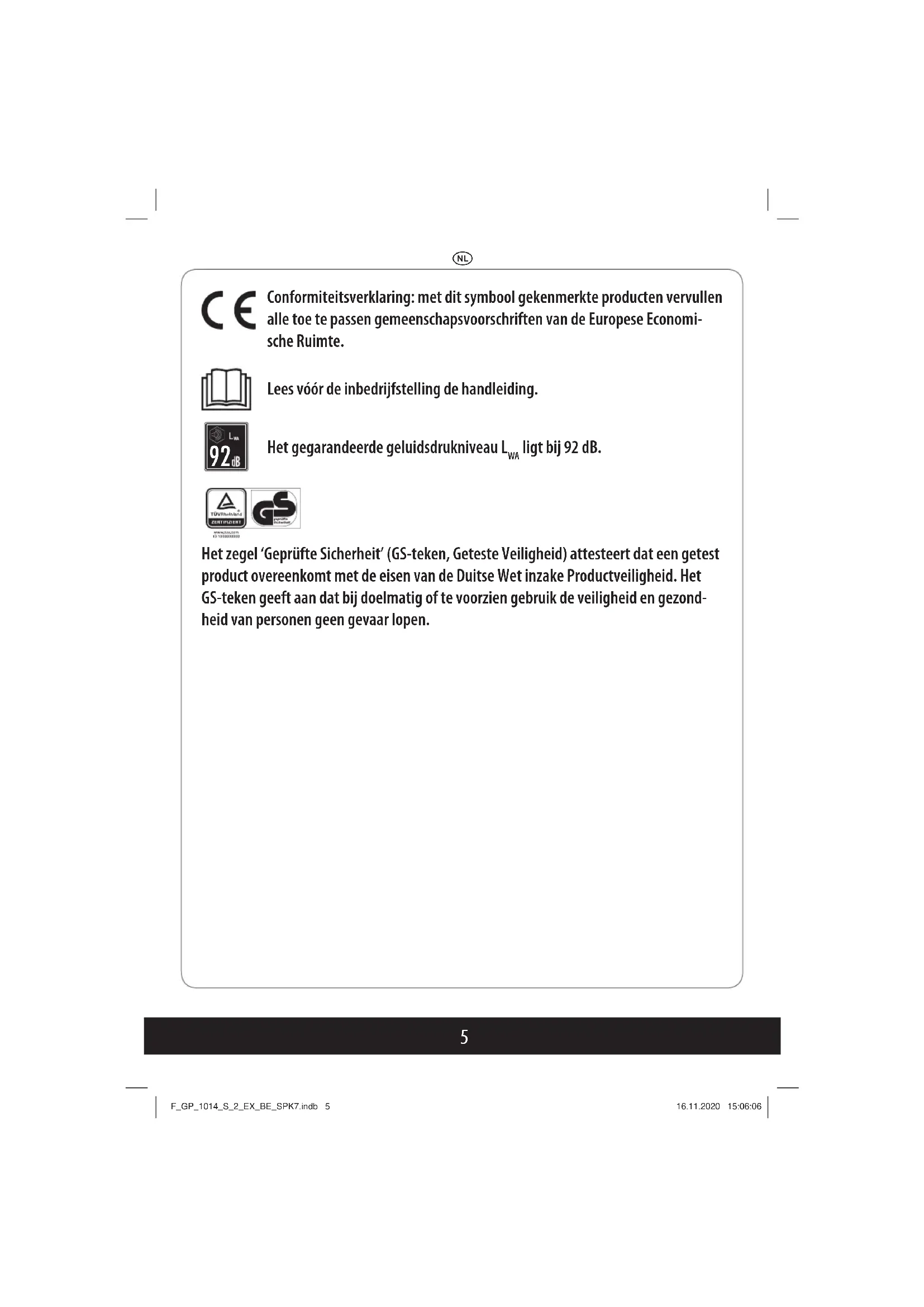 ligt bij 92 dB. Het zegel ‘Geprüfte Sicherheit’ (GS-teken, Geteste Veiligheid) attesteert dat een getest product overeenkomt met de eisen van de Duitse Wet inzake Productveiligheid. Het GS-teken geeft aan dat bij doelmatig of te voorzien gebruik de veiligheid en gezond- heid van personen geen gevaar lopen. F_GP_1014_S_2_EX_BE_SPK7.indb 5F_GP_1014_S_2_EX_BE_SPK7.indb 5 16.11.2020 15:06:0616.11.2020 15:06:06N