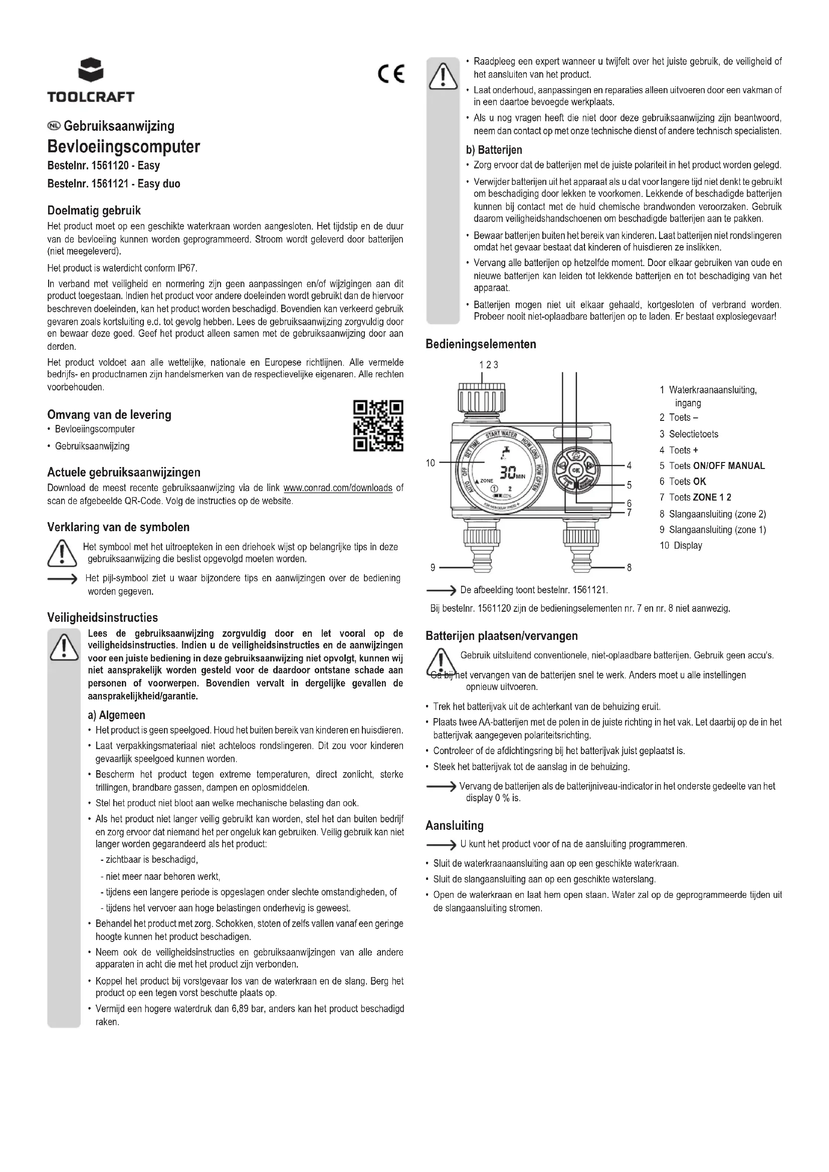 - Open de waterkraan en laat hem open staan. Water zal op de geprogrammeerde tijden uit de slangaansluiting stromen. Gebruiksaanwijzing Bevloeiingscomputer Bestelnr. 1561120 - Easy Bestelnr. 1561121 - Easy duo Doelmatig gebruik Het product moet op een geschikte waterkraan worden aangesloten. Het tijdstip en de duur van de bevloeiing kunnen worden geprogrammeerd. Stroom wordt geleverd door batterijen (niet meegeleverd). Het product is waterdicht conform IP67. In verband met veiligheid en normering zijn geen aanpassingen en/of wijzigingen aan dit product toegestaan. Indien het product voor andere doeleinden wordt gebruikt dan de hiervoor beschreven doeleinden, kan het product worden beschadigd. Bovendien kan verkeerd gebruik gevaren zoals kortsluiting e.d. tot gevolg hebben. Lees de gebruiksaanwijzing zorgvuldig door en bewaar deze goed. Geef het product alleen samen met de gebruiksaanwijzing door aan derden. Het product voldoet aan alle wettelijke, nationale en Europese richtlijnen. Alle vermelde bedrijfs- en productnamen zijn handelsmerken van de respectievelijke eigenaren. Alle rechten voorbehouden. Omvang van de levering