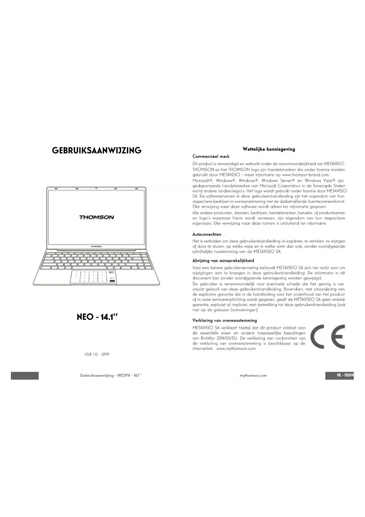 Si consiglia di eseguire il backup dell’intera cartella su un supporto di archiviazione esterno (disco rigido esterno, chiavette USB, CD-R) per conservare una copia di questi driver.NL - 115114 - NL Gebruiksaanwijzing - NEOPX - 14.1’’ mythomson.com GEBRUIKSAANWIJZING NEO - 14.1’’ VSIE 1.0 - 0919 Wettelijke kennisgeving Commercieel merk Dit product is vervaardigd en verkocht onder de verantwoordelijkheid van METAVISIO. THOMSON en het THOMSON logo zijn handelsmerken die onder licentie worden gebruikt door METAVISIO - meer informatie op www.thomson-brand.com. Microsoft®, Windows®, Windows®, Windows Server® en Windows Vista® zijn gedeponeerde handelsmerken van Microsoft Corporation in de Verenigde Staten en/of andere landen/regio’s. Het logo wordt gebruikt onder licentie door METAVISIO SA. De softwarenamen in deze gebruikershandleiding zijn het eigendom van hun respectieve bedrijven in overeenstemming met de desbetreffende licentieovereenkomst. Elke verwijzing naar deze software wordt alleen ter informatie gegeven. Alle andere producten, diensten, bedrijven, handelsmerken, handels- of productnamen en logo’s waarnaar hierin wordt verwezen, zijn eigendom van hun respectieve eigenaars. Elke verwijzing naar deze namen is uitsluitend ter informatie. Auteursrechten Het is verboden om deze gebruikershandleiding te kopiëren, te vertalen, te wijzigen of door te sturen, op welke wijze en in welke vorm dan ook, zonder voorafgaande schriftelijke toestemming van de METAVISIO SA. Afwijzing van aansprakelijkheid Voor een betere gebruikerservaring behoudt METAVISIO SA zich het recht voor om wijzigingen aan te brengen in deze gebruikershandleiding. De informatie in dit document kan zonder voorafgaande kennisgeving worden gewijzigd. De gebruiker is verantwoordelijk voor eventuele schade die het gevolg is van onjuist gebruik van deze gebruikershandleiding. Bovendien, met uitzondering van de expliciete garantie die in de handleiding voor het onderhoud van het product of in onze serviceverplichting wordt gegeven, geeft de METAVISIO SA geen enkele garantie, expliciet of impliciet, met betrekking tot deze gebruikershandleiding (ook niet op de gekozen formuleringen). Verklaring van overeenstemming METAVISIO SA verklaart hierbij dat dit product voldoet aan de essentiële eisen en andere toepasselijke bepalingen van Richtlijn 2014/53/EU. De verklaring van conformiteit van de verklaring van overeenstemming is beschikbaar op de internetlink: www.mythomson.comNL - 117116 - NL Gebruiksaanwijzing - NEOPX - 14.1’’ mythomson.com - Belangrijke veiligheidsinstructies - Dit apparaat moet worden gebruikt in een omgeving met een omgevingstemperatuur tussen 5°C (41°F) en 35°C (95°F). Stel het apparaat niet bloot aan regen of vocht en houd het uit de buurt van vloeistoffen. In geval van spattend water of andere vloeistoffen op het apparaat, schakel het apparaat onmiddellijk uit en wacht tot het volledig droog is voordat u het weer inschakelt. Stel het apparaat niet rechtstreeks bloot aan zonnestraling. Gebruik geen sterke oplosmiddelen, vloeibare reinigingsmiddelen of andere chemicaliën op of in de buurt van het oppervlak van het apparaat om corrosie of beschadiging van het oppervlak van het apparaat te voorkomen. Stel de camera niet bloot aan een stofge omgeving. Gebruik het toestel niet tijdens een gaslek. Stel het toestel niet bloot aan sterke magnetische of elektrische velden. U kunt het apparaat door röntgendetectoren op luchthavens laten lopen. Het is echter aan te raden uw apparaat niet door de magnetische detectiepoorten te leiden of het niet bloot te stellen aan draagbare detectoren. Plaats geen voorwerpen op het apparaat. Plaats het apparaat niet op een oneffen of onstabiel oppervlak. Zorg ervoor dat u het toestel beschermt tegen vallen of andere schokken die het toestel kunnen beschadigen. Laat het apparaat niet op uw schoot of een ander lichaamsdeel liggen of op uw schoot liggen om elk risico op verwondingen door hitte te voorkomen. Schakel het apparaat uit voordat u het vervoert of afdekt met een materiaal dat geen optimale luchtcirculatie mogelijk maakt. Gebruik geen beschadigde netsnoeren, accessoires of andere apparaten met uw apparaat. Wij adviseren het exclusieve gebruik van de bij het apparaat geleverde accessoires (voeding, kabels, enz.). Gebruik alleen originele batterijen. Het vervangen van de batterij door een verkeerde batterij kan een explosiegevaar opleveren. Demonteer, wijzig of repareer het apparaat niet zelf, omdat dit de garantie kan doen vervallen. Maak regelmatig een back-up van uw belangrijke inhoud om gegevensverlies te voorkomen. Ons bedrijf aanvaardt geen enkele verantwoordelijkheid voor het verlies of de verwijdering van items in het apparaat als gevolg van onjuist gebruik van de hardware of software, gebrek aan onderhoud of een andere toevallige gebeurtenis. Maak regelmatig een back-up van uw belangrijke inhoud om gegevensverlies te voorkomen. Ons bedrijf aanvaardt geen enkele verantwoordelijkheid voor het verlies of de verwijdering van items in het apparaat als gevolg van onjuist gebruik van de hardware of software, gebrek aan onderhoud of andere toevallige gebeurtenissen. Dit product is ontworpen om een goede recycling van onderdelen en componenten mogelijk te maken. Het symbool van een doorgestreepte vuilnisbak op wielen geeft aan dat het apparaat niet met het huishoudelijk afval mag worden weggegooid. Raadpleeg de plaatselijke voorschriften voor het afvoeren van elektronische apparaten. Het symbool van een doorgestreepte vuilnisbak op wielen geeft aan dat de batterij niet met het huishoudelijk afval mag worden weggegooid. Raadpleeg de plaatselijke voorschriften voor het afvoeren van de batterij. Luister niet langdurig naar hoge geluidsniveaus om mogelijke gehoorschade te voorkomen.NL - 119118 - NL Gebruiksaanwijzing - NEOPX - 14.1’’ mythomson.com - Presentatie van het apparaat - Vooraanzicht Opmerking : De presentatie van het apparaat en sommige functies k
