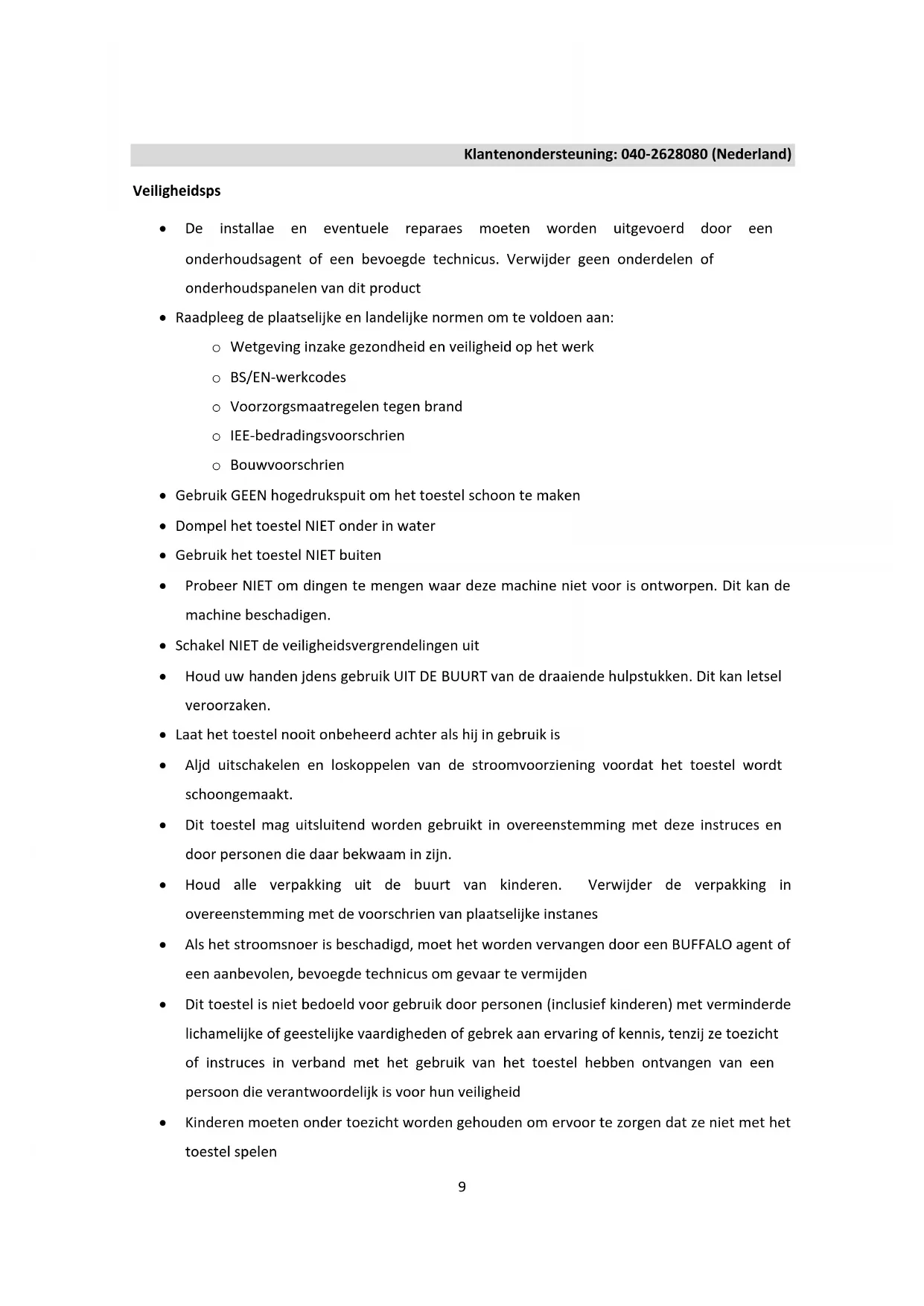 - Earth wire (coloured green/yellow) to terminal marked E This appliance must be earthed, using a dedicated earthing circuit. If in doubt consult a qualified electrician. Electrical isolation points must be kept clear of any obstructions. In the event of any emergency disconnection being required they must be readily accessible. Compliance The WEEE logo on this product or its documentation indicates that the product must not be disposed of as household waste. To help prevent possible harm to human health and/or the environment, the product must be disposed of in an approved and environmentally safe recycling process. For further information on how to dispose of this product correctly, contact the product supplier, or the local authority responsible for waste disposal in your area. BUFFALO parts have undergone strict product testing in order to comply with regulatory standards and specifications set by international, independent, and federal authorities. BUFFALO products have been approved to carry the following symbol: All rights reserved. No part of these instructions may be produced or transmitted in any form or by any means, electronic, mechanical, photocopying, recording or otherwise, without the prior written permission of BUFFALO. Every effort is made to ensure all details are correct at the time of going to press, however, BUFFALO reserve the right to change specifications without notice.9 Klantenondersteuning: 040-2628080 (Nederland) Veiligheidstips De installatie en eventuele reparaties moeten worden uitgevoerd door een onderhoudsagent of een bevoegde technicus. Verwijder geen onderdelen of onderhoudspanelen van dit product Raadpleeg de plaatselijke en landelijke normen om te voldoen aan: o Wetgeving inzake gezondheid en veiligheid op het werk o BS/EN-werkcodes o Voorzorgsmaatregelen tegen brand o IEE-bedradingsvoorschriften o Bouwvoorschriften Gebruik GEEN hogedrukspuit om het toestel schoon te maken Dompel het toestel NIET onder in water Gebruik het toestel NIET buiten Probeer NIET om dingen te mengen waar deze machine niet voor is ontworpen. Dit kan de machine beschadigen. Schakel NIET de veiligheidsvergrendelingen uit Houd uw handen tijdens gebruik UIT DE BUURT van de draaiende hulpstukken. Dit kan letsel veroorzaken. Laat het toestel nooit onbeheerd achter als hij in gebruik is Altijd uitschakelen en loskoppelen van de stroomvoorziening voordat het toestel wordt schoongemaakt. Dit toestel mag uitsluitend worden gebruikt in overeenstemming met deze instructies en door personen die daar bekwaam in zijn. Houd alle verpakking uit de buurt van kinderen. Verwijder de verpakking in overeenstemming met de voorschriften van plaatselijke instanties Als het stroomsnoer is beschadigd, moet het worden vervangen door een BUFFALO agent of een aanbevolen, bevoegde technicus om gevaar te vermijden Dit toestel is niet bedoeld voor gebruik door personen (inclusief kinderen) met verminderde lichamelijke of geestelijke vaardigheden of gebrek aan ervaring of kennis, tenzij ze toezicht of instructies in verband met het gebruik van het toestel hebben ontvangen van een persoon die verantwoordelijk is voor hun veiligheid Kinderen moeten onder toezicht worden gehouden om ervoor te zorgen dat ze niet met het toestel spelen10