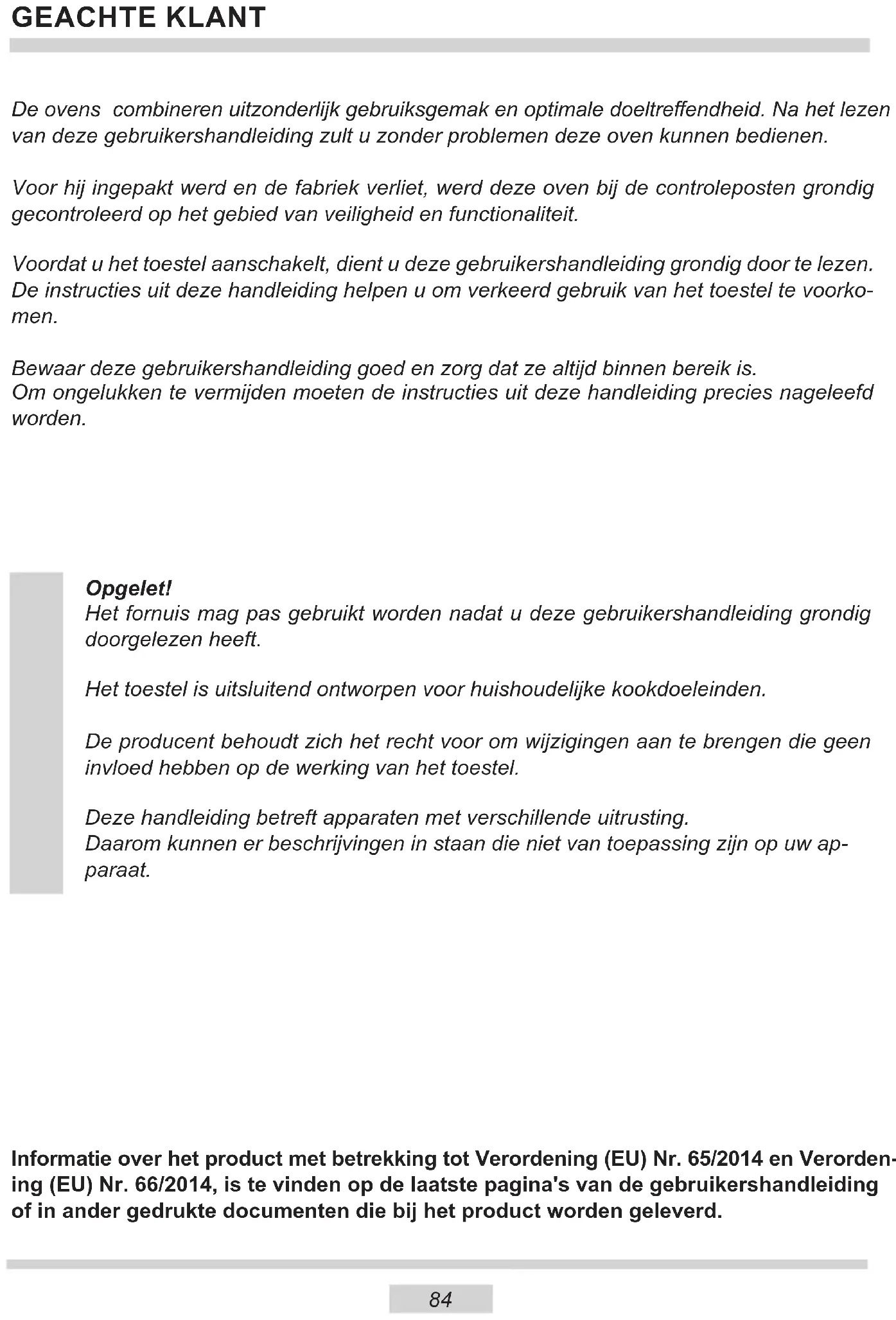 work. The bulb is loose or damaged. Tighten up or replace the blown bulb (see ‘Cleaning and Maintenance’).83 TECHNICAL DATA Certicate of compliance CE The Manufacturer hereby declares that this product complies with the general requirements pursuant to the following European Directives: l The Low Voltage Directive 2014/35/EC, l Electromagnetic Compatibility Directive 2014/30/EC, lErP Directive 2009/125/EC, and therefore the product has been marked with the symbol and the Declaration of Conformity has been issued to the manufacturer and is available to the competent authorities regulating the market. The product meets the requirements of European standards EN 60335- 1; EN60335-2-6. The data on the energy labels of electric ovens is given according to standard EN 60350-1 / IEC 60350-1. These values are dened with a standard workload a with the functions active: bottom and top heaters (conventional heating) and fan assisted heating (forced air heating), if these functions are available. The energy eciency class was assigned depending on the function available in the product in accordance with the priority below: During energy consumption test, remove the telescopic runners (if the product is tted with any). Forced air circulation ECO (ring heater + fan) Forced air circulation ECO (bottom heater + top + roaster + fan) Conventional mode ECO (bottom heater + top) Voltage rating 230V ~ 50 Hz Power rating 3,6 kW Cooker dimensions H/W/D 59,5 x 59,5 x 57,5 cmGEACHTE KLANT De ovens combineren uitzonderlijk gebruiksgemak en optimale doeltreendheid. Na het lezen van deze gebruikershandleiding zult u zonder problemen deze oven kunnen bedienen. Voor hij ingepakt werd en de fabriek verliet, werd deze oven bij de controleposten grondig gecontroleerd op het gebied van veiligheid en functionaliteit. Voordat u het toestel aanschakelt, dient u deze gebruikershandleiding grondig door te lezen. De instructies uit deze handleiding helpen u om verkeerd gebruik van het toestel te voorko- men. Bewaar deze gebruikershandleiding goed en zorg dat ze altijd binnen bereik is. Om ongelukken te vermijden moeten de instructies uit deze handleiding precies nageleefd worden. Opgelet! Het fornuis mag pas gebruikt worden nadat u deze gebruikershandleiding grondig doorgelezen heeft. Het toestel is uitsluitend ontworpen voor huishoudelijke kookdoeleinden. De producent behoudt zich het recht voor om wijzigingen aan te brengen die geen invloed hebben op de werking van het toestel. Deze handleiding betreft apparaten met verschillende uitrusting. Daarom kunnen er beschrijvingen in staan die niet van toepassing zijn op uw ap- paraat.