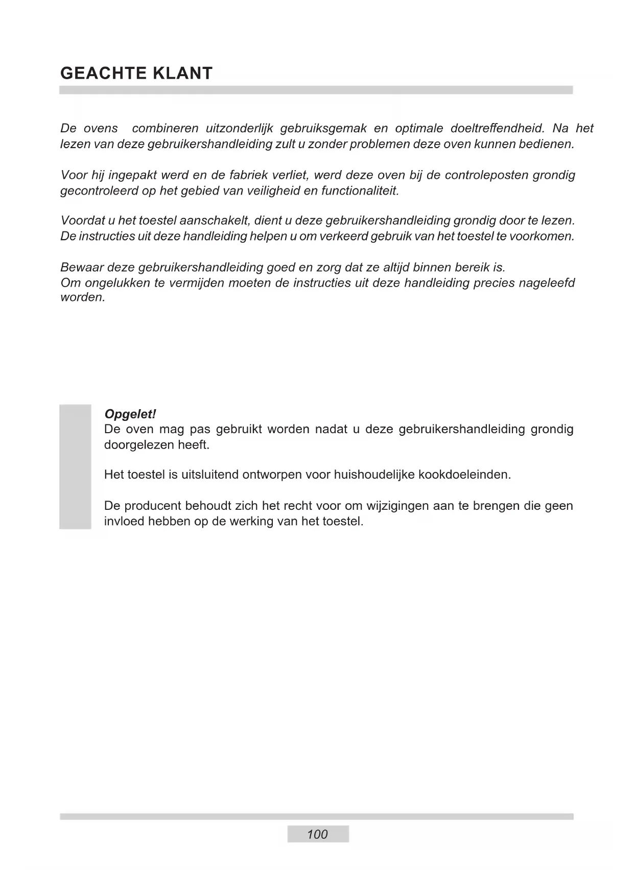 ● Sluit de deur van de oven zorg- vuldig. Er ontsnapt warmte via het vuil dat zich op de afdichtingen de deur van de oven bevindt. Verwijder dit vuil best onmiddellijk. ● Bouw de oven niet in in de onmiddellijke nabijheid van koelkasten of diepvriezers. Het energiegebruik van deze toestellen stijgt hierdoor onnodig.104 Het toestel wordt door zijn verpakking beveiligd tegen beschadigingen tijdens het transport. Na het uitpakken van het toestel dient u de verpakkingselementen te recycleren op milieuvriende- lijke wijze. Alle materialen die gebruikt worden voor de verpakking zijn onschadelijk voor het milieu. Ze zijn 100% geschikt voor recyclage en zijn aangeduid met het gepaste symbool. Opgelet! De verpakkingsmaterialen (zakjes uit polyethyleen, stukken piepschuim, enz.) moeten tijdens het uitpakken buiten het be- reik van kinderen gehouden worden. UITPAKKEN Op het einde van de gebruiks- periode mag dit product niet bij het gewone huisvuil geplaatst worden, maar moet afgegeven worden bij een verzamelpunt voor recyclage van elektrische en elektronische toestellen. Dit wordt aangegeven door het gepaste symbool op het product, in de gebruikershandleiding of op de verpakking. De materialen die gebruikt zijn bij de pro- ductie van het toestel, zijn geschikt voor hergebruik volgens hun aanduiding. Dankzij dit hergebruik, de verwerking van materia- len of andere vormen van hergebruik van afgedankte toestellen draagt u bij tot de bescherming van het milieu. Informatie over het verzamelpunt voor gebruikte toestellen kunt u krijgen bij de gemeentediensten.