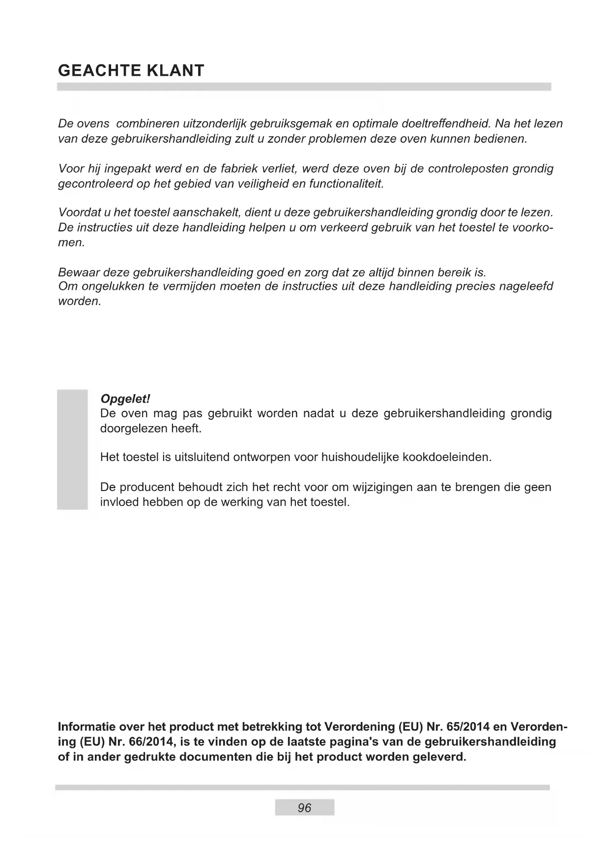work. The bulb is loose or damaged. Tighten up or replace the blown bulb (see ‘Cleaning and Maintenance’).95 TECHNICAL DATA Certicate of compliance CE The Manufacturer hereby declares that this product complies with the general requirements pursuant to the following European Directives: l The Low Voltage Directive 2014/35/EC, l Electromagnetic Compatibility Directive 2014/30/EC, lErP Directive 2009/125/EC, and therefore the product has been marked with the symbol and the Declaration of Conformity has been issued to the manufacturer and is available to the competent authorities regulating the market. The product meets the requirements of European standards EN 60335- 1; EN60335-2-6. The data on the energy labels of electric ovens is given according to standard EN 60350-1 / IEC 60350-1. These values are dened with a standard workload a with the functions active: bottom and top heaters (conventional heating) and fan assisted heating (forced air heating), if these functions are available. The energy eciency class was assigned depending on the function available in the product in accordance with the priority below: During energy consumption test, remove the telescopic runners (if the product is tted with any). Forced air circulation ECO (ring heater + fan) Forced air circulation ECO (bottom heater + top + roaster + fan) Conventional mode ECO (bottom heater + top) Model identier EBX 943 700 E EBX 944 710 E Voltage rating 230V ~ 50 Hz Power rating 3,5 kW 3,6 kW Cooker dimensions H/W/D 59,5 x 59,5 x 57,5 cmGEACHTE KLANT De ovens combineren uitzonderlijk gebruiksgemak en optimale doeltreendheid. Na het lezen van deze gebruikershandleiding zult u zonder problemen deze oven kunnen bedienen. Voor hij ingepakt werd en de fabriek verliet, werd deze oven bij de controleposten grondig gecontroleerd op het gebied van veiligheid en functionaliteit. Voordat u het toestel aanschakelt, dient u deze gebruikershandleiding grondig door te lezen. De instructies uit deze handleiding helpen u om verkeerd gebruik van het toestel te voorko- men. Bewaar deze gebruikershandleiding goed en zorg dat ze altijd binnen bereik is. Om ongelukken te vermijden moeten de instructies uit deze handleiding precies nageleefd worden. Opgelet! De oven mag pas gebruikt worden nadat u deze gebruikershandleiding grondig doorgelezen heeft. Het toestel is uitsluitend ontworpen voor huishoudelijke kookdoeleinden. De producent behoudt zich het recht voor om wijzigingen aan te brengen die geen invloed hebben op de werking van het toestel. Informatie over het product met betrekking tot Verordening (EU) Nr. 65/2014 en Verorden- ing (EU) Nr. 66/2014, is te vinden op de laatste pagina's van de gebruikershandleiding of in ander gedrukte documenten die bij het product worden geleverd.
