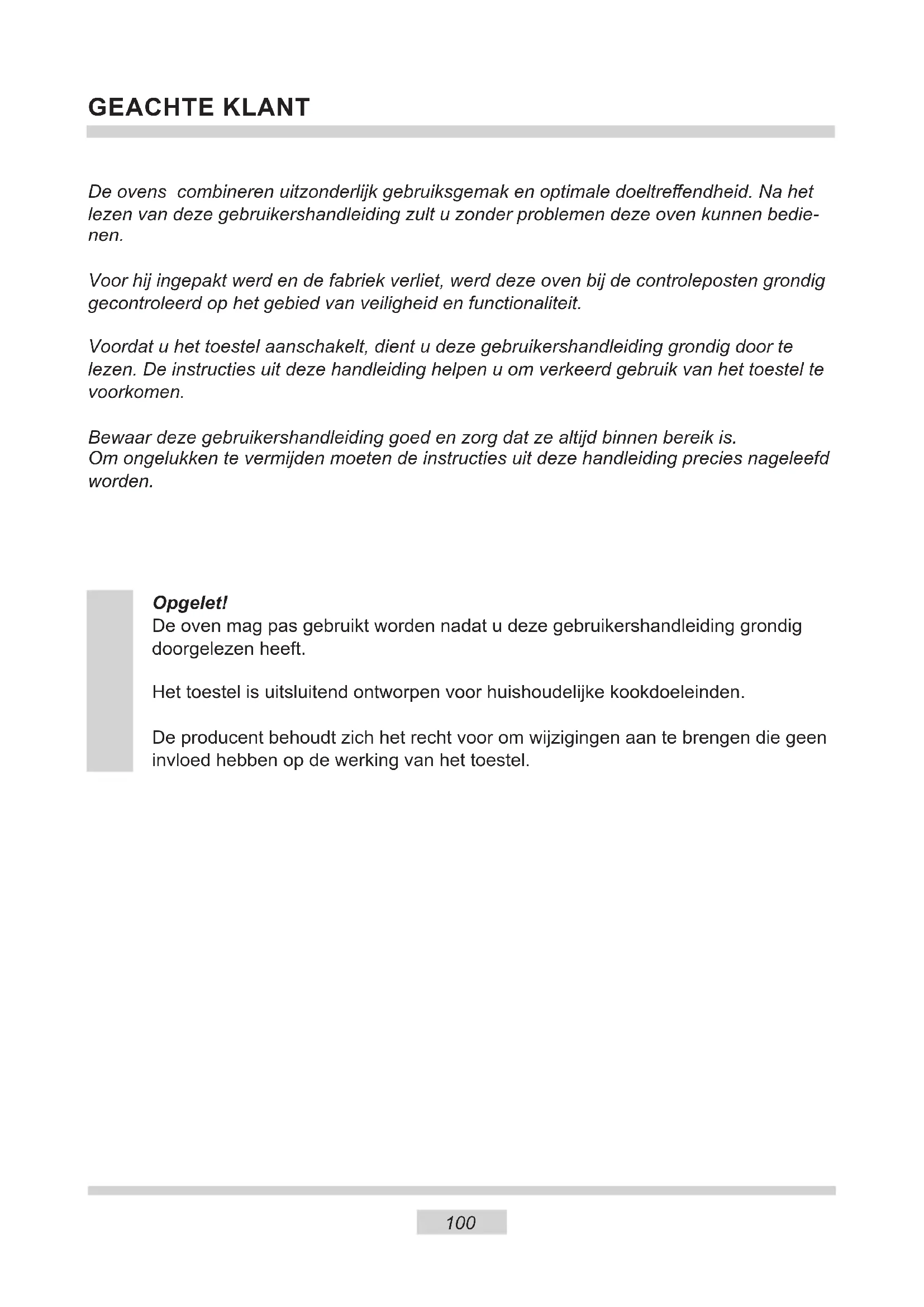 voor u de oven voor de eerste maal aanschakelt BEDIENING verwijder alle verpakkingsonderdelen, verwijder de onderhoudsmiddelen die in de fabriek aangebracht zijn, uit de ka- mer van de oven en van de kookplaat, neem de uitrusting uit de oven en reinig die in warm water met afwasmiddel, schakel de ventilatie in de ruimte aan of open een raam, warm de oven op (op een temp. van 250ºC, ong. 30 min.), verwijder vuil en reinig hem grondig. Warm de kookvel- den van de plaat ong. 4 minuten op zonder potten of pannen. Belangrijk! Was de binnenkant van de oven en- kel met warm water met een kleine hoeveelheid afwasmiddel. Attentie! In ovens die zijn uitgerust met de elektronische programmeerfunctie, verschijnt na aansluiting op het lichtnet op het display de pulserende tijdsaanduiding „0:00”. Stel de actuele tijd van de program- meerfunctie in. (Zie bediening van de programmeerfunctie) De oven werkt niet als u de actuele tijd niet instelt. Belangrijk! De elektronische programmeerfunctie is uitgerust met sensors die worden geactiveerd door met de vinger een gemerkt oppervlak aan te raken (tip- toetsen). Elke aanraking van een sensor gaat gepaard met een geluidssignaal. Houd de oppervlakte van de sensors schoon.110 Functiedraaiknop oven De oven kan worden verwarmd met behulp van het verwarmingselement onder, het verwarmingselement boven, het hetelucht- verwarmingselement of het verwarmings- element van de grill. U kiest de gewenste functie met behulp van de functiedraaiknop. Onderstaande afbeelding toont de functies (in de betreende volgorde) die op de draai- knop staan: Draaiknop instellingen +/- De draaiknop instellingen draait u niet, maar kantelt u naar beide kanten. Hij dient voor het instellen van de werkparameters zoals temperatuur en tijd. Een slag van de draaiknop naar rechts verhoogt de waarde van de parameter. Een slag naar de andere kant verlaagt de waarde van de parameter. De parameters die u met deze knop kunt wijzigen zijn temperatuur, tijd en instelling van de actuele tijd op de display. Als u de draaiknop in gekantelde positie vasthoudt, gaat de snelheid waarmee de waarde wijzigt omhoog. BEDIENING De programmafunctie is uitgerust met een led-display en 3 knoppen (tiptoetsen). Knop (Tiptoets) Beschrijving Instelling temperatuur Instelling klok Kookwekker Opgelet: Elk gebruik van een knop (tiptoets) gaat gepaard met een geluidssignaal. Het is niet mogelijk om de geluidsignalen uit te schakelen. Betekenis van de symbolen op de display. Symbool Beschrijving Thermostaat Kookwekker Werkingsduur Eindtijd werking Pyrolyse Kinderslot Elektronisch bedieningspaneel Uitschakelpositie111 BEDIENING De voeding inschakelen Na aansluiting op de stroomvoorziening (of terugkeer van de stroomvoorziening na een eerdere stroomonderbreking) komt de oven in de modus 'instellen actuele tijd' en knippert 0:00 op de display. Druk op de knop (tiptoets) . Met de draaiknop instellingen +/- veran- dert u de tijd. U kunt het apparaat niet ge- bruiken zonder instelling van de actuele tijd. Om de instelling van de tijd te bevestigen moet de functiedraaiknop op de positie 0 staan. Als de functiedraaiknop op een andere positie staat knippert het symbool en wacht de programmafunctie totdat de functiedraaik- nop op de positie 0 wordt gezet. Een druk op de knop (tiptoets) bevestigt de tijd en de programmafunctie schakelt over naar de stand-bymodus. Opgelet: Bij een stroomonderbreking worden alle ingevoerde parameters als werkingsduur, temperatuur en functie gewist. Om door te gaan moet u de instellingen opnieuw invo- eren. Indien het onderbroken programma pyrolytische reiniging was (of wanneer de deur om een andere reden is vergrendeld - het symbool brandt), dan wordt voor het instellen van de klok eerst de oven afgekoeld en de deur geopend. Als in de oven een temperatuur wordt gedetecteerd van meer dan 80°C schakelt de koeling van de oven in. Dit heeft geen invloed op het verloop van de instelling van de klok. De koeling schakelt uit zodra de temperatuur daalt onder 75°C. Stand-bystand Bij overgaan naar de stand-bymodus wor- den alle instellingen van tijden, tempera- turen en kookwekker gewist. De verwar- mingselementen worden uitgeschakeld. De display toont de actuele tijd en is minder helder. Actief zijn de knoppen (tiptoets) , waarmee u overgaat op het instellen van de tijd, geluidssignaal en helderheid, en de knop (tiptoets) waarmee u de kookwek- ker in kunt stellen. Als de temperatuur in de ovenruimte hoger is dan 80°C, dan wordt in plaats van de tijd de temperatuur van de ovenruimte getoond (als aanduiding van de restwarmte) en is de koelventilator ingeschakeld. Zodra de tem- peratuur daalt beneden 75°C schakelt de ventilator uit en de temperatuuraanduiding van de ovenruimte verandert in de actuele tijd. Overgang naar de stand-bymodus: - op ieder moment door de functieknop op positie 0 te zetten; als u op deze manier overgaat naar de standby-modus hoort u een geluidssignaal; - na onderbreking van de stroomvoorziening en instelling van de actuele tijd; - na aoop van tijdgestuurde programma's (automatisch en halfautomatisch, kookwek- ker); - na activering van de bescherming tegen doorlopende verwarming; - bij een lopende pyrolysecyclus gaat de oven na het plaatsen van de knop op de positie 0 pas over naar de stand-bymodus als de oven is afgekoeld en de deur is ont- grendeld. Verlaten van de stand-bymodus: Als u de functiedraaiknop van de positie 0 op een andere positie zet, schakelt de oven van de stand-bymodus naar de actieve mo- dus. Opmerking - als de programmafunctie au to- matisch naar de stand-bymodus is gegaan, moet u eerst de draaiknop op de positie 0 zetten. Pas daarna kan de oven de stand- bymodus verlaten. Als de functiedraaiknop in de stand-bymo- dus op een andere positie dan 0 staat, knip- pert het symbool .112 BEDIENING Diepe stand-by: Als de oven 10 minuten in de stand-by- modus heeft gestaan, schakelt hij naar de diepe stand-bymodus - de tiptoetsen en de +/- instelknop werken niet. U kunt de