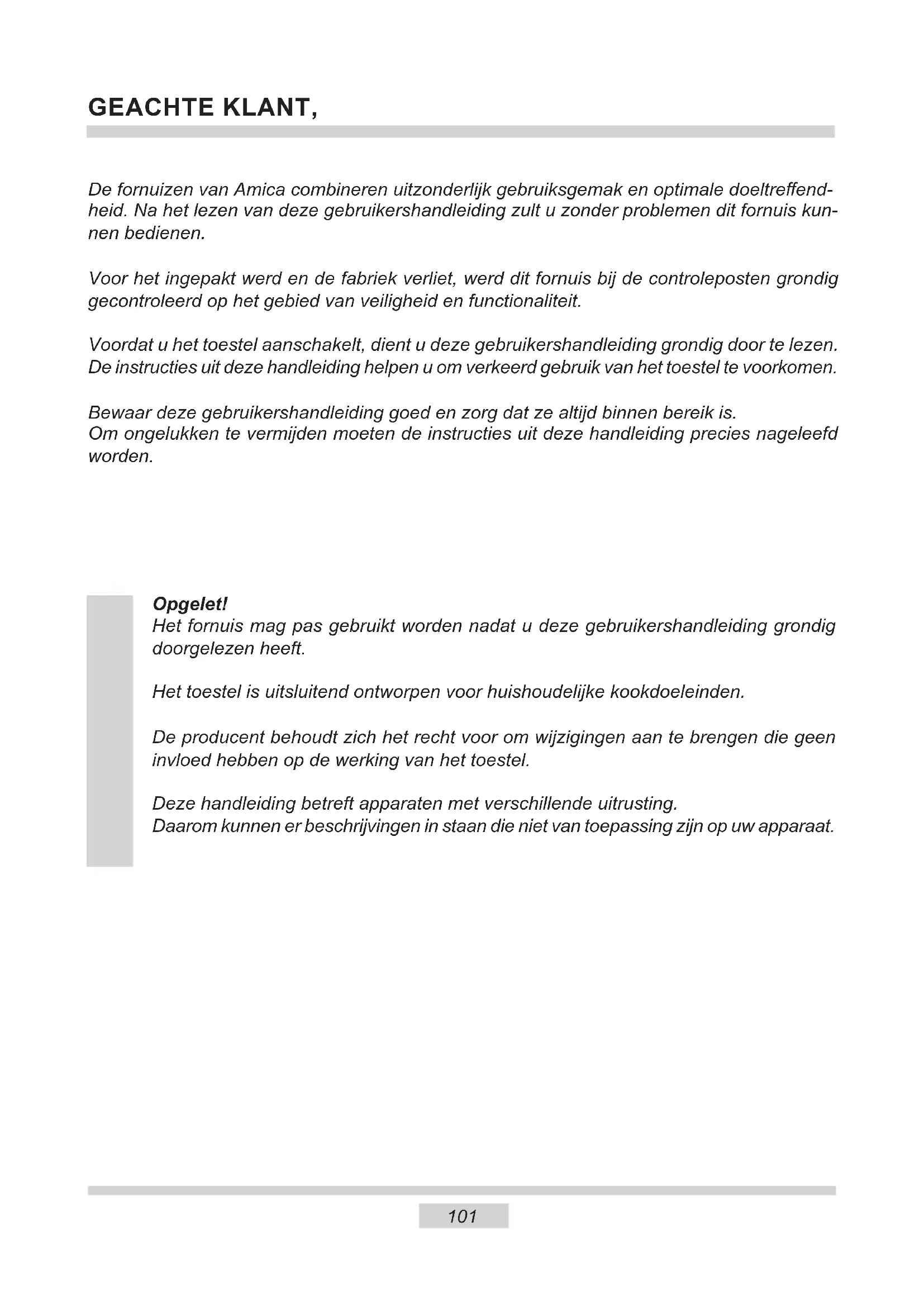 work. The bulb is loose or damaged. Tighten up or replace the blown bulb (see ‘Cleaning and Maintenance’).100 TECHNICAL DATA Certicate of compliance CE The Manufacturer hereby declares that this product complies with the general requirements pursuant to the following European Directives: The Low Voltage Directive 2014/35/EC, Electromagnetic Compatibility Directive 2014/30/EC, ErP Directive 2009/125/EC, and therefore the product has been marked with the symbol and the Declaration of Conformity has been issued to the manufacturer and is available to the competent authorities regulating the market. The product meets the requirements of European standards EN 60335- 1; EN60335-2-6. The data on the energy labels of electric ovens is given according to standard EN 60350-1 / IEC 603501. These values are dened with a standard workload a with the functions active: bottom and top heaters (conventional heating) and fan assisted heating (forced air heating), if these functions are available. The energy eciency class was assigned depending on the function available in the product in accordance with the priority below: During energy consumption test, remove the telescopic runners (if the product is tted with any). Forced air circulation ECO (ring heater + fan) Forced air circulation ECO (bottom heater + top + roaster + fan) Forced air circulation ECO (bottom heater + top + fan) Conventional mode ECO (bottom heater + top) Model identier EH 923 630 E EH 923 640 E EH 923 630 SM EH 927 600 E EH 921 600 E Voltage rating 230/400V ~ 50 Hz Power rating 3,5 kW 2,0 kW Cooker dimensions H/W/D 59,5 x 59,5 x 57,5 cm101 GEACHTE KLANT, De fornuizen van Amica combineren uitzonderlijk gebruiksgemak en optimale doeltreend- heid. Na het lezen van deze gebruikershandleiding zult u zonder problemen dit fornuis kun- nen bedienen. Voor het ingepakt werd en de fabriek verliet, werd dit fornuis bij de controleposten grondig gecontroleerd op het gebied van veiligheid en functionaliteit. Voordat u het toestel aanschakelt, dient u deze gebruikershandleiding grondig door te lezen. De instructies uit deze handleiding helpen u om verkeerd gebruik van het toestel te voorkomen. Bewaar deze gebruikershandleiding goed en zorg dat ze altijd binnen bereik is. Om ongelukken te vermijden moeten de instructies uit deze handleiding precies nageleefd worden. Opgelet! Het fornuis mag pas gebruikt worden nadat u deze gebruikershandleiding grondig doorgelezen heeft. Het toestel is uitsluitend ontworpen voor huishoudelijke kookdoeleinden. De producent behoudt zich het recht voor om wijzigingen aan te brengen die geen invloed hebben op de werking van het toestel. Deze handleiding betreft apparaten met verschillende uitrusting. Daarom kunnen er beschrijvingen in staan die niet van toepassing zijn op uw apparaat. NL102 VEILIGHEIDSINSTRUCTIES Attentie. Dit apparaat en de bereikbare onderdelen ervan worden tijdens het gebruik heet. Wees bijzonder voorzich- tig bij het aanraken van de verwarmingselementen. Zorg dat kinderen die jonger zijn dan 8 jaar niet bij het apparaat kunnen komen, tenzij ze onder permanent toezicht staan. Dit apparaat mag gebruikt worden door kinderen van 8 jaar en ouder en personen met lichamelijke of geestelijke beperkingen of personen zonder ervaring met of kennis van het apparaat, als dit gebruik plaatsvindt onder toezicht of in overeenstemming met de gebruiksaanwijzing van het apparaat, door personen die verantwoordelijk zijn voor hun veiligheid. Zorg ervoor dat kinderen niet met het apparaat kunnen spelen. Kinderen mogen de kookplaat niet zonder toezicht schoonmaken of onderhoudswerkzaamheden ver- richten. Tijdens het gebruik wordt het toestel heet. Wees voorzichtig en raak de hete onderdelen in de oven niet aan. Als dit apparaat gebruikt wordt, kunnen de bereikbare onder- delen heet worden. Laat geen kinderen bij de oven komen. Attentie. Gebruik geen schurende schoonmaakmiddelen of scherpe metalen voorwerpen voor het schoonmaken van het glas van de deur, omdat deze krassen kunnen veroorzaken op het oppervlak. Dit kan leiden tot barsten van het glas. Attentie. Om elektrocutie te vermijden dient u het toestel uit te schakelen vooraleer u het lampje vervangt.103 VEILIGHEIDSINSTRUCTIES ● Zorg ervoor dat er geen kleine keukentoestellen of hun kabels in direct contact komen met de hete oven, want de isolatie van deze toestellen is niet bestand tegen hoge temperaturen. ● Laat de oven niet achter zonder toezicht terwijl u kookt. Oliën en vetten kunnen ontvlammen als gevolg van oververhitting. ● Plaats geen schotels met een gewicht van meer dan 15 kg op de open deur van de oven. ● Gebruik geen schurende reinigingsmiddelen of scherpe metalen voorwerpen om de glazen deur te reinigen. Hierdoor kan het oppervlak gekrast raken, wat kan leiden tot barsten in het glas. ● Het is verboden om een oven met technische defecten te gebruiken. Defecten mogen enkel hersteld worden door een erkend technicus met gepaste kwali- caties. ● Bij problemen veroorzaakt door technische defecten, moet de oven van het stroomnet ontkoppeld worden. ● U moet steeds de regels en richtlijnen uit deze handleiding naleven. Het toestel mag niet bediend worden door personen die deze handleiding niet kennen. ● Het toestel is uitsluitend ontworpen voor kookdoeleinden. Elke andere toepassing (bv. voor het verwarmen van ruimtes) stemt niet overeen met de bestemming van het toestel en kan gevaar veroorzaken. Gebruik geen stoomreinigers voor het schoonmaken van het fornuis. Gevaar voor verbranding! Bij het openen van de ovendeur kan hete stoom ontsnappen. Wees voorzichtig met het ope- nen van de deur tijdens of na aoop van het koken. Buig u bij het openen niet over de deur. Vergeet niet dat stoom bij bepaalde temperaturen onzichtbaar kan zijn.104 ENERGIEBESPARING Door op verantwoorde wijze energie te gebruiken be- spaart u niet alleen op de kosten van het huishouden, maar werkt u ook bewust mee aan de bescherming van het milieu. Laten we daarom ons steent