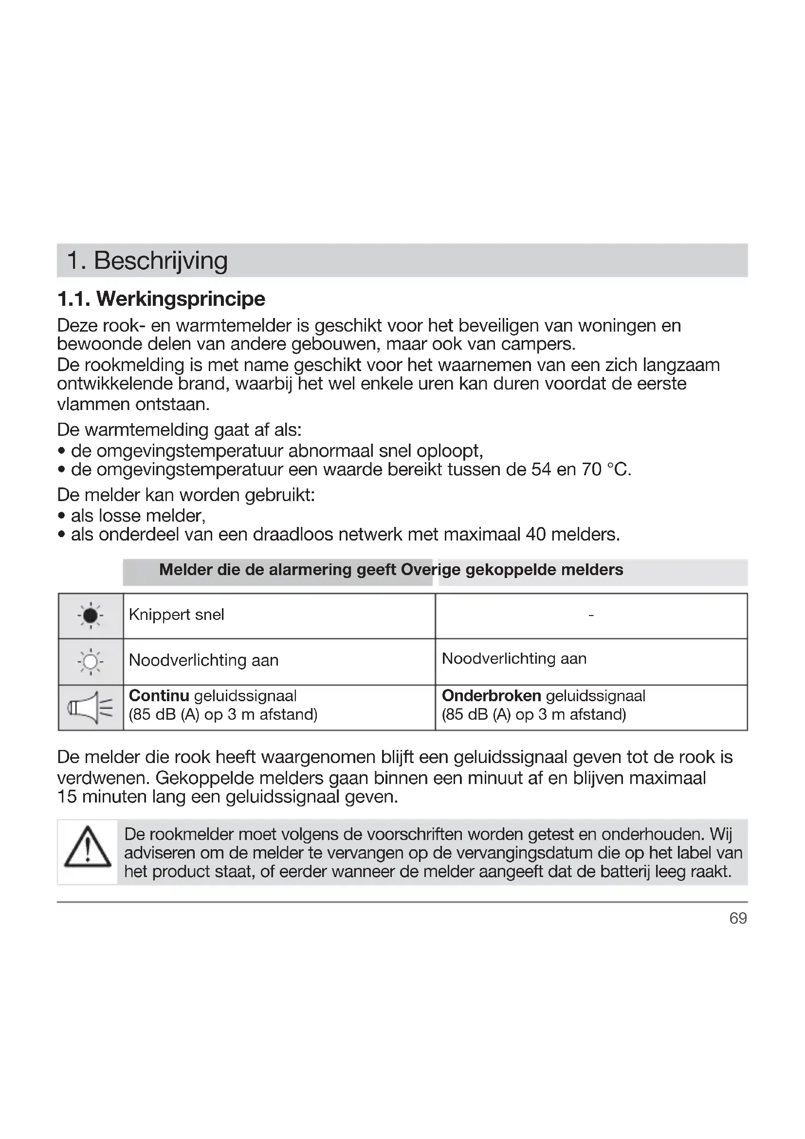 1.1. Werkingsprincipe Deze rook- en warmtemelder is geschikt voor het beveiligen van woningen en bewoonde delen van andere gebouwen, maar ook van campers. De rookmelding is met name geschikt voor het waarnemen van een zich langzaam ontwikkelende brand, waarbij het wel enkele uren kan duren voordat de eerste vlammen ontstaan. De warmtemelding gaat af als: