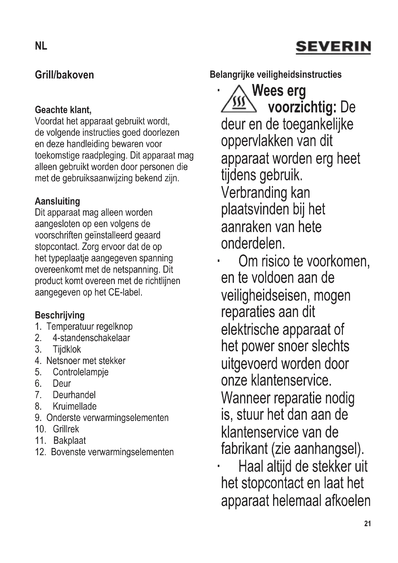 Grill/bakoven Geachte klant, Voordat het apparaat gebruikt wordt, de volgende instructies goed doorlezen en deze handleiding bewaren voor toekomstige raadpleging. Dit apparaat mag alleen gebruikt worden door personen die met de gebruiksaanwijzing bekend zijn. Aansluiting Dit apparaat mag alleen worden aangesloten op een volgens de voorschriften geïnstalleerd geaard stopcontact. Zorg ervoor dat de op het typeplaatje aangegeven spanning overeenkomt met de netspanning. Dit product komt overeen met de richtlijnen aangegeven op het CE-label. Beschrijving