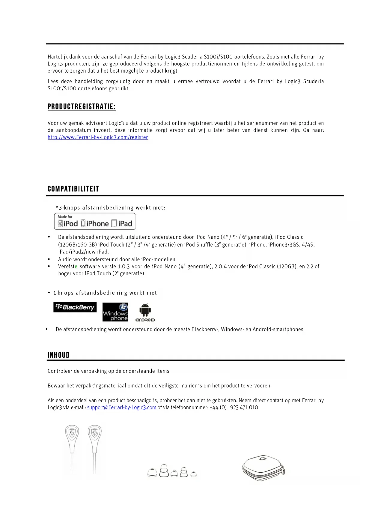 NL - Introductie! Hartelijk dank voor de aanschaf van de Ferrari by Logic3 Scuderia S100i/S100 oortelefoons. Zoals met alle Ferrari by Logic3 producten, zijn ze geproduceerd volgens de hoogste productienormen en tijdens de ontwikkeling getest, om ervoor te zorgen dat u het best mogelijke product krijgt. Lees deze handleiding zorgvuldig door en maakt u ermee vertrouwd voordat u de Ferrari by Logic3 Scuderia S100i/S100 oortelefoons gebruikt. Productregistratie: Voor uw gemak adviseert Logic3 u dat u uw product online registreert waarbij u het serienummer van het product en de aankoopdatum invoert, deze informatie zorgt ervoor dat wij u later beter van dienst kunnen zijn. Ga naar: http://www.Ferrari-by-Logic3.com/register