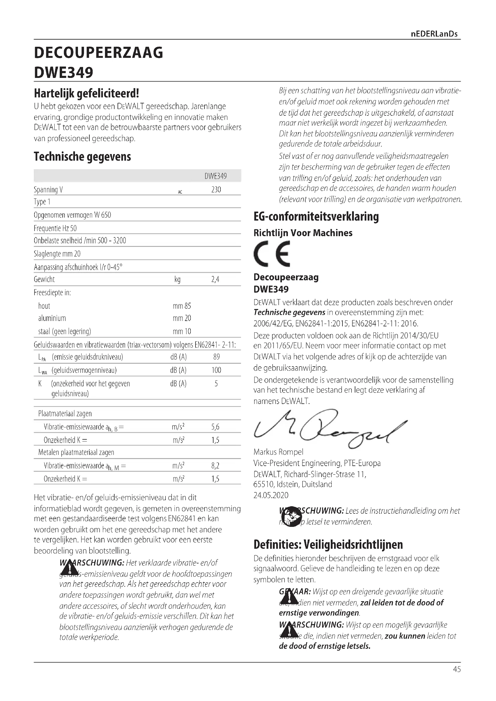 AVVERTENZA: per ridurre il rischio di gravi lesioni personali, spegnere l’apparato e scollegarlo dall’alimentazione prima di eseguire qualsiasi regolazione o rimozione/installazione di dotazioni o accessori. Un avvio accidentale può causarelesioni. lama o tagliare verso l'interno dal bordo del materiale). Quando il seghetto è posizionato correttamente inserire un chiodino attraverso il foro del braccio della guida. Utilizzando la guida per taglio secondo la fibra come perno, iniziare a tagliare il cerchio. Durante l'esecuzione di tagli circolari la barra trasversale deve esseresollevata.45 nEDERLanDs WAARSCHUWING: Lees de instructiehandleiding om het risico op letsel teverminderen. Definities: Veiligheidsrichtlijnen De definities hieronder beschrijven de ernstgraad voor elk signaalwoord. Gelieve de handleiding te lezen en op deze symbolen teletten. GEVAAR: Wijst op een dreigende gevaarlijke situatie die, indien niet vermeden, zal leiden tot de dood of ernstigeverwondingen. WAARSCHUWING: Wijst op een mogelijk gevaarlijke situatie die, indien niet vermeden, zou kunnen leiden tot de dood of ernstigeletsels. EG‑conformiteitsverklaring Richtlijn Voor Machines Decoupeerzaag DWE349 DeWALT verklaart dat deze producten zoals beschreven onder Technische gegevens in overeenstemming zijn met: 2006/42/EG, EN62841‑1:2015, EN62841‑2‑11:2016.Deze producten voldoen ook aan de Richtlijn 2014/30/EU en 2011/65/EU. Neem voor meer informatie contact op met DeWALT via het volgende adres of kijk op de achterzijde van degebruiksaanwijzing.De ondergetekende is verantwoordelijk voor de samenstelling van het technische bestand en legt deze verklaring af namensDeWALT.Markus Rompel Vice‑President Engineering, PTE‑Europa DeWALT, Richard‑Slinger‑Strase 11, 65510, Idstein, Duitsland 24.05.2020Bij een schatting van het blootstellingsniveau aan vibratie- en/of geluid moet ook rekening worden gehouden met de tijd dat het gereedschap is uitgeschakeld, of aanstaat maar niet werkelijk wordt ingezet bij werkzaamheden. Dit kan het blootstellingsniveau aanzienlijk verminderen gedurende de totalearbeidsduur.Stel vast of er nog aanvullende veiligheidsmaatregelen zijn ter bescherming van de gebruiker tegen de effecten van trilling en/of geluid, zoals: het onderhouden van gereedschap en de accessoires, de handen warm houden (relevant voor trilling) en de organisatie vanwerkpatronen.Het vibratie‑ en/of geluids‑emissieniveau dat in dit informatieblad wordt gegeven, is gemeten in overeenstemming met een gestandaardiseerde test volgens EN62841en kan worden gebruikt om het ene gereedschap met het andere te vergelijken. Het kan worden gebruikt voor een eerste beoordeling vanblootstelling. WAARSCHUWING: Het verklaarde vibratie- en/of geluids-emissieniveau geldt voor de hoofdtoepassingen van het gereedschap. Als het gereedschap echter voor andere toepassingen wordt gebruikt, dan wel met andere accessoires, of slecht wordt onderhouden, kan de vibratie- en/of geluids-emissie verschillen. Dit kan het blootstellingsniveau aanzienlijk verhogen gedurende de totalewerkperiode.DWE349Spanning V