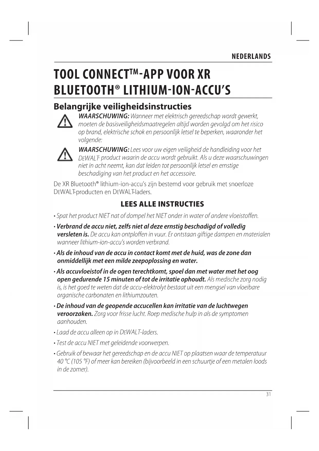 -aPP VOOR XR BLUETOOTH® LITHIUM-IOn-aCCU’s Belangrijke veiligheidsinstructies WAARSCHUWING: Wanneer met elektrisch gereedschap wordt gewerkt, moeten de basisveiligheidsmaatregelen altijd worden gevolgd om het risico op brand, elektrische schok en persoonlijk letsel te beperken, waaronder het volgende: WAARSCHUWING: Lees voor uw eigen veiligheid de handleiding voor het DEWALT - product waarin de accu wordt gebruikt. Als u deze waarschuwingen niet in acht neemt, kan dat leiden tot persoonlijk letsel en ernstige beschadiging van het product en het accessoire. De XR Bluetooth® lithium-ion-accu’s zijn bestemd voor gebruik met snoerloze DeWALT -producten en DeWALT -laders.