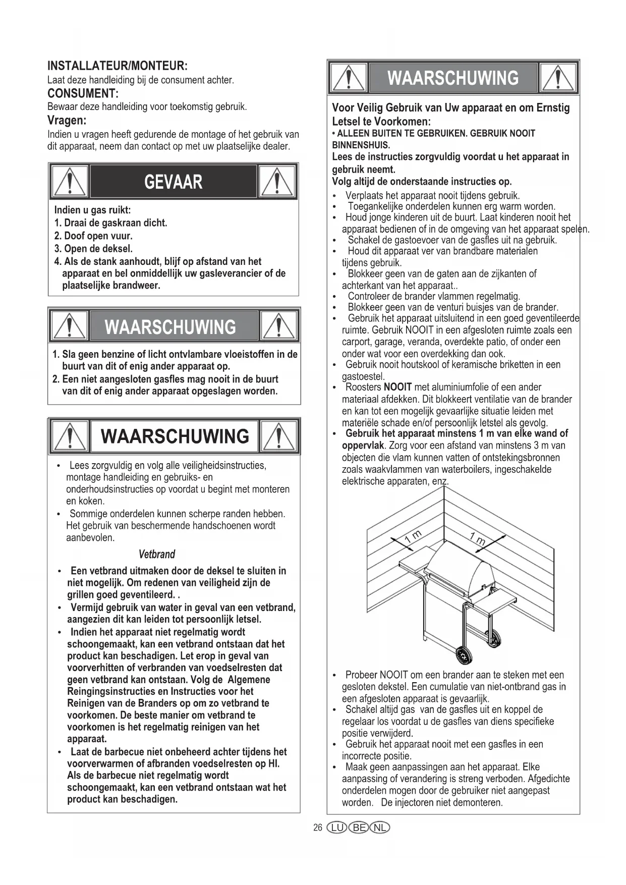 - ALLEEN BUITEN TE GEBRUIKEN. GEBRUIK NOOITBINNENSHUIS.Lees de instructies zorgvuldig voordat u het apparaat ingebruik neemt.Volg altijd de onderstaande instructies op.Ÿ Verplaats het apparaat nooit tijdens gebruik.Ÿ Toegankelijke onderdelen kunnen erg warm worden.Ÿ Houd jonge kinderen uit de buurt. Laat kinderen nooit hetapparaat bedienen of in de omgeving van het apparaat spelen.Ÿ Schakel de gastoevoer van de gasfles uit na gebruik.Ÿ Houd dit apparaat ver van brandbare materialentijdens gebruik.Ÿ Blokkeer geen van de gaten aan de zijkanten ofachterkant van het apparaat..Ÿ Controleer de brander vlammen regelmatig.Ÿ Blokkeer geen van de venturi buisjes van de brander.Ÿ Gebruik het apparaat uitsluitend in een goed geventileerderuimte. Gebruik NOOIT in een afgesloten ruimte zoals eencarport, garage, veranda, overdekte patio, of onder eenonder wat voor een overdekking dan ook.Ÿ Gebruik nooit houtskool of keramische briketten in eengastoestel.Ÿ Roosters NOOIT met aluminiumfolie of een andermateriaal afdekken. Dit blokkeert ventilatie van de branderen kan tot een mogelijk gevaarlijke situatie leiden metmateriële schade en/of persoonlijk letstel als gevolg.Ÿ Gebruik het apparaat minstens 1 m van elke wand ofoppervlak. Zorg voor een afstand van minstens 3 m vanobjecten die vlam kunnen vatten of ontstekingsbronnenzoals waakvlammen van waterboilers, ingeschakeldeelektrische apparaten, enz.Ÿ Probeer NOOIT om een brander aan te steken met eengesloten dekstel. Een cumulatie van niet-ontbrand gas ineen afgesloten apparaat is gevaarlijk.Ÿ Schakel altijd gas van de gasfles uit en koppel deregelaar los voordat u de gasfles van diens specifiekepositie verwijderd.Ÿ Gebruik het apparaat nooit met een gasfles in eenincorrecte positie.Ÿ Maak geen aanpassingen aan het apparaat. Elkeaanpassing of verandering is streng verboden. Afgedichteonderdelen mogen door de gebruiker niet aangepastworden. De injectoren niet demonteren. 1 m 1 m INSTALLATEUR/MONTEUR: Laat deze handleiding bij de consument achter. CONSUMENT: Bewaar deze handleiding voor toekomstig gebruik. Vragen: Indien u vragen heeft gedurende de montage of het gebruik van dit apparaat, neem dan contact op met uw plaatselijke dealer.