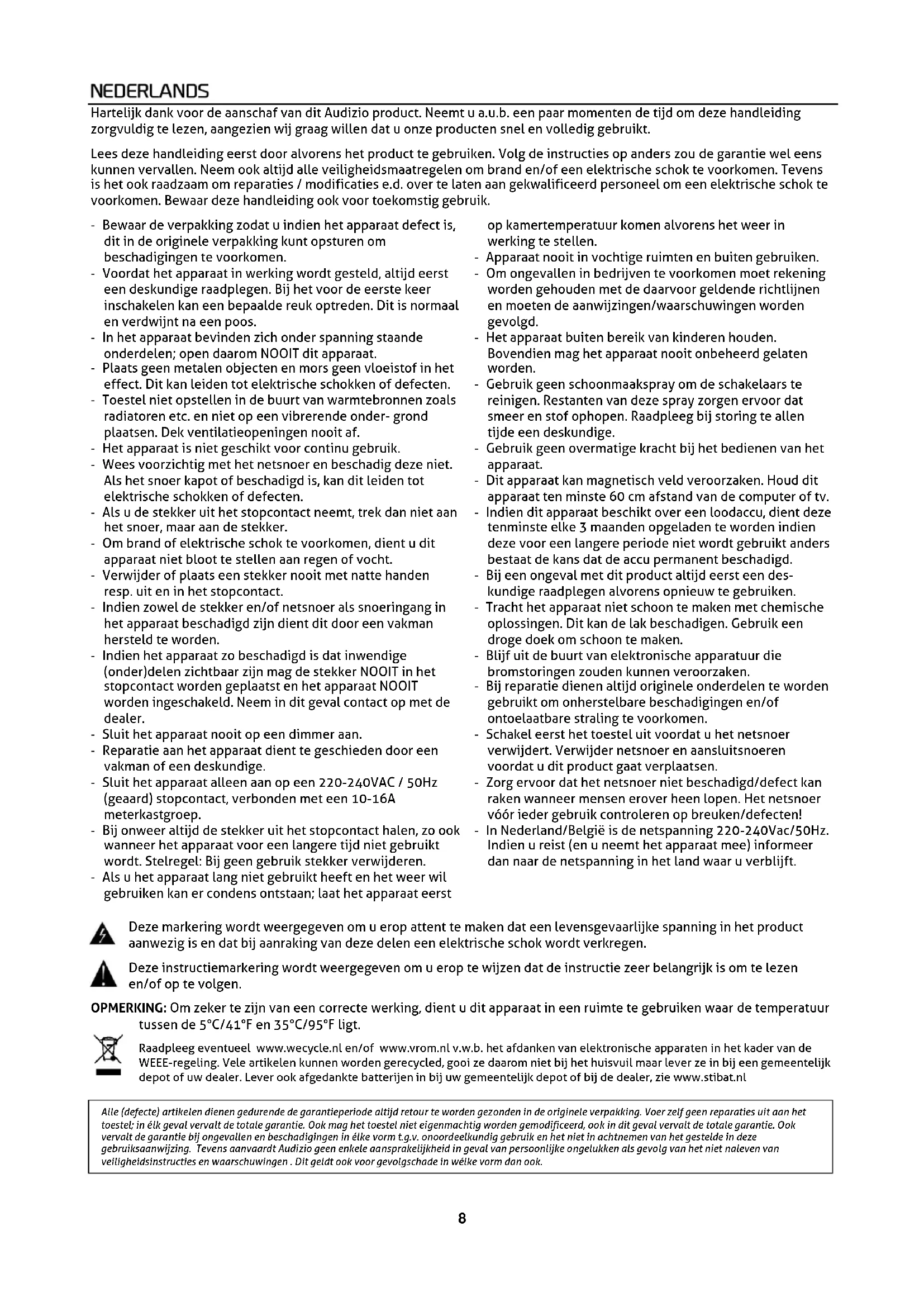 Alle (defecte) artikelen dienen gedurende de garantieperiode altijd retour te worden gezonden in de originele verpakking. Voer zelf geen reparaties uit aan het toestel; in élk geval vervalt de totale garantie. Ook mag het toestel niet eigenmachtig worden gemodificeerd, ook in dit geval vervalt de totale garantie. Ook vervalt de garantie bij ongevallen en beschadigingen in élke vorm t.g.v. onoordeelkundig gebruik en het niet in achtnemen van het gestelde in deze gebruiksaanwijzing. Tevens aanvaardt Audizio geen enkele aansprakelijkheid in geval van persoonlijke ongelukken als gevolg van het niet naleven van veiligheidsinstructies en waarschuwingen . Dit geldt ook voor gevolgschade in wélke vorm dan ook.9 LET OP! Pak na ontvangst de doos zorgvuldig uit. Controleer of alle onderdelen aanwezig- en in goede staat ontvangen zijn. Bij transportschade of bij het ontbreken van onderdelen onmiddellijk de verkopende partij inlichten. Bewaar de verpakking en het verpakkingsmateriaal. Indien het product moet worden teruggestuurd, is het belangrijk dat het product in originele verpakking wordt geretourneerd. Schakel het apparaat niet onmiddellijk in als het apparaat is blootgesteld aan drastische temperatuurverschillen (bv. na het transport). De ontstane condensatie kan het apparaat beschadigen. Zorg ervoor dat het apparaat eerst op kamertemperatuur komt alvorens het aan te sluiten. Op het label aan de achterzijde van het product staat aangegeven op welke netspanning deze moet worden aangesloten. Controleer of de netspanning hiermee overeenkomt, bij alle andere netspanningen dan aangegeven kan het apparaat onherstelbaar worden beschadigd. Tevens moet het apparaat direct op de netspanning worden aangesloten en mag géén dimmer of regelbare voeding worden gebruikt. Sluit het apparaat altijd aan op een beschermd circuit (aardlekschakelaar of zekering). Zorg ervoor dat het apparaat voldoende elektrisch is geaard om het risico op elektrocutie of brand te vermijden.