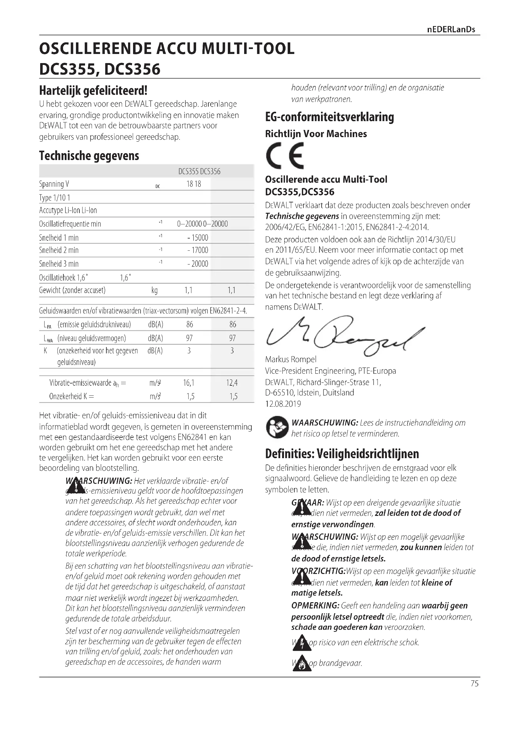 WAARSCHUWING: Het verklaarde vibratie- en/of geluids-emissieniveau geldt voor de hoofdtoepassingen van het gereedschap. Als het gereedschap echter voor andere toepassingen wordt gebruikt, dan wel met andere accessoires, of slecht wordt onderhouden, kan de vibratie- en/of geluids-emissie verschillen. Dit kan het blootstellingsniveau aanzienlijk verhogen gedurende de totalewerkperiode. Bij een schatting van het blootstellingsniveau aan vibratie- en/of geluid moet ook rekening worden gehouden met de tijd dat het gereedschap is uitgeschakeld, of aanstaat maar niet werkelijk wordt ingezet bij werkzaamheden. Dit kan het blootstellingsniveau aanzienlijk verminderen gedurende de totalearbeidsduur. Stel vast of er nog aanvullende veiligheidsmaatregelen zijn ter bescherming van de gebruiker tegen de effecten van trilling en/of geluid, zoals: het onderhouden van gereedschap en de accessoires, de handen warm houden (relevant voor trilling) en de organisatie vanwerkpatronen. EG-conformiteitsverklaring Richtlijn Voor Machines Oscillerende accu Multi-Tool DCS355, DCS356 DeWALT verklaart dat deze producten zoals beschreven onder Technische gegevens in overeenstemming zijn met: 2006/42/EG, EN62841-1:2015, EN62841-2-4:2014. Deze producten voldoen ook aan de Richtlijn 2014/30/EU en 2011/65/EU. Neem voor meer informatie contact op met DeWALT via het volgende adres of kijk op de achterzijde van degebruiksaanwijzing. De ondergetekende is verantwoordelijk voor de samenstelling van het technische bestand en legt deze verklaring af namensDeWALT. Markus Rompel Vice-President Engineering, PTE-Europa DeWALT, Richard-Slinger-Strase 11, D-65510, Idstein, Duitsland