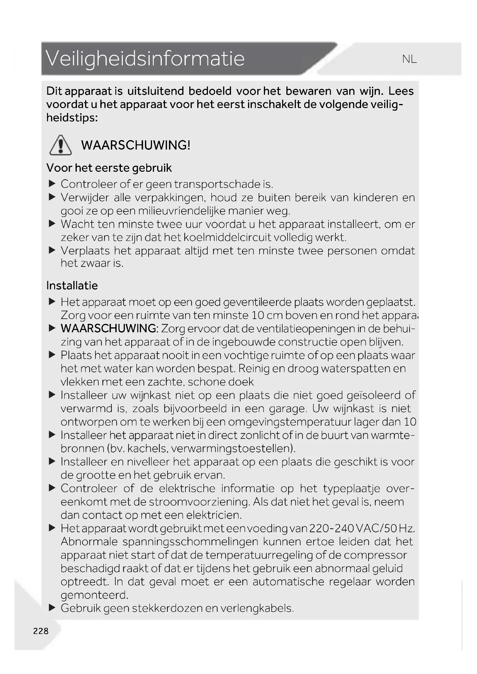 WAARSCHUWING! Voor het eerste gebruik Controleer of er geen transportschade is. Verwijder alle verpakkingen, houd ze buiten bereik van kinderen en gooi ze op een milieuvriendelijke manier weg. Wacht ten minste twee uur voordat u het apparaat installeert, om er zeker van te zijn dat het koelmiddelcircuit volledig werkt. Verplaats het apparaat altijd met ten minste twee personen omdat het zwaar is. Installatie Het apparaat moet op een goed geventileerde plaats worden geplaatst. Zorg voor een ruimte van ten minste 10 cm boven en rond het apparaat. WAARSCHUWING: Zorg ervoor dat de ventilatieopeningen in de behui- zing van het apparaat of in de ingebouwde constructie open blijven. Plaats het apparaat nooit in een vochtige ruimte of op een plaats waar het met water kan worden bespat. Reinig en droog waterspatten en vlekken met een zachte, schone doek Installeer uw wijnkast niet op een plaats die niet goed geïsoleerd of verwarmd is, zoals bijvoorbeeld in een garage. Uw wijnkast is niet ontworpen om te werken bij een omgevingstemperatuur lager dan 10 °C. Installeer het apparaat niet in direct zonlicht of in de buurt van warmte- bronnen (bv. kachels, verwarmingstoestellen). Installeer en nivelleer het apparaat op een plaats die geschikt is voor de grootte en het gebruik ervan. Controleer of de elektrische informatie op het typeplaatje over- eenkomt met de stroomvoorziening. Als dat niet het geval is, neem dan contact op met een elektricien. Het apparaat wordt gebruikt met een voeding van 220-240 VAC/50 Hz. Abnormale spanningsschommelingen kunnen ertoe leiden dat het apparaat niet start of dat de temperatuurregeling of de compressor beschadigd raakt of dat er tijdens het gebruik een abnormaal geluid optreedt. In dat geval moet er een automatische regelaar worden gemonteerd. Gebruik geen stekkerdozen en verlengkabels.NL Veiligheidsinformatie