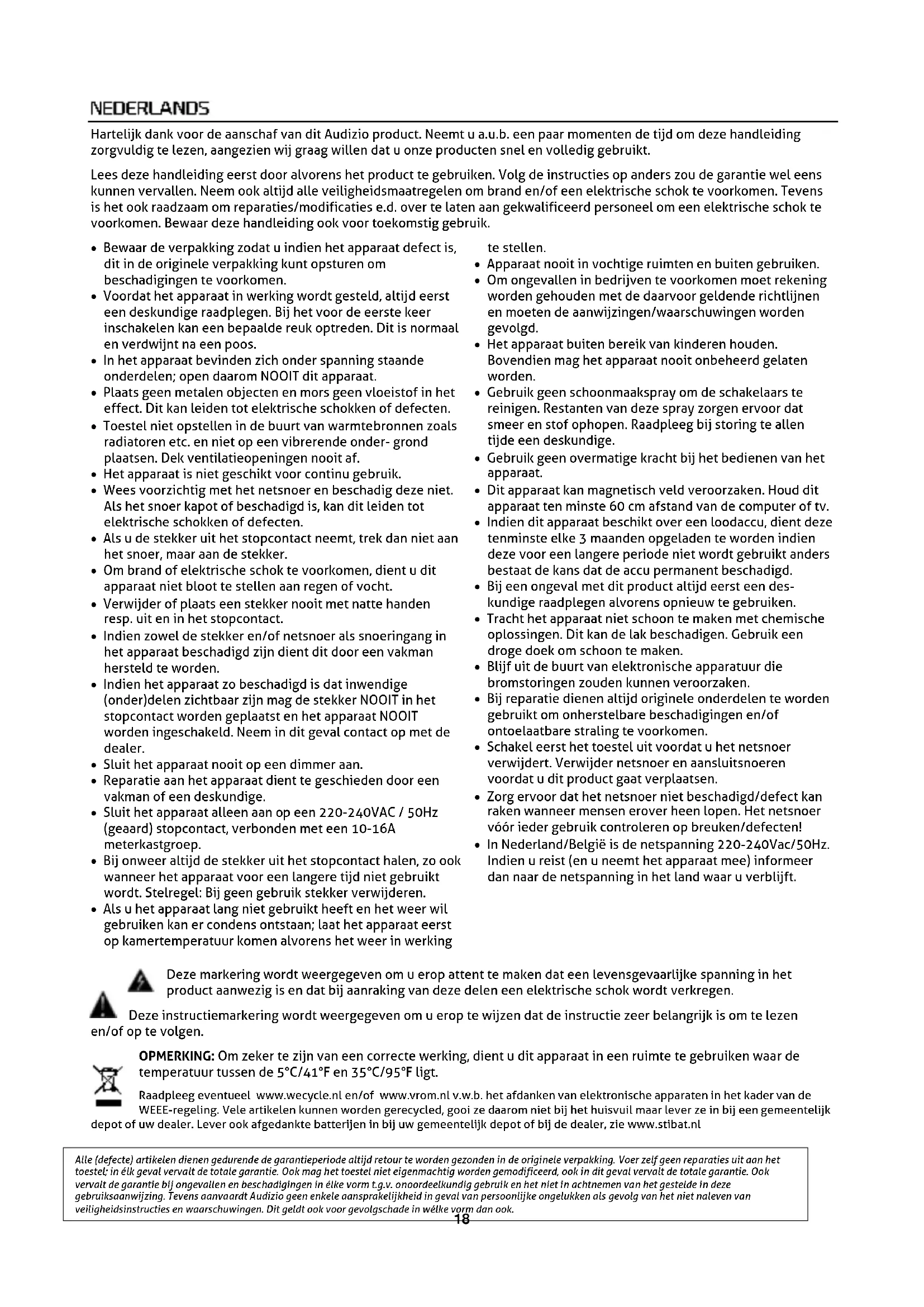 Alle (defecte) artikelen dienen gedurende de garantieperiode altijd retour te worden gezonden in de originele verpakking. Voer zelf geen reparaties uit aan het toestel; in élk geval vervalt de totale garantie. Ook mag het toestel niet eigenmachtig worden gemodificeerd, ook in dit geval vervalt de totale garantie. Ook vervalt de garantie bij ongevallen en beschadigingen in élke vorm t.g.v. onoordeelkundig gebruik en het niet in achtnemen van het gestelde in deze gebruiksaanwijzing. Tevens aanvaardt Audizio geen enkele aansprakelijkheid in geval van persoonlijke ongelukken als gevolg van het niet naleven van veiligheidsinstructies en waarschuwingen. Dit geldt ook voor gevolgschade in wélke vorm dan ook.19 LET OP! Pak na ontvangst de doos zorgvuldig uit. Controleer of alle onderdelen aanwezig- en in goede staat ontvangen zijn. Bij transportschade of bij het ontbreken van onderdelen onmiddellijk de verkopende partij inlichten. Bewaar de verpakking en het verpakkingsmateriaal. Indien het product moet worden teruggestuurd, is het belangrijk dat het product in originele verpakking wordt geretourneerd. Schakel het apparaat niet onmiddellijk in als het apparaat is blootgesteld aan drastische temperatuurverschillen (bv. na het transport). De ontstane condensatie kan het apparaat beschadigen. Zorg ervoor dat het apparaat eerst op kamertemperatuur komt alvorens het aan te sluiten. Op het label aan de achterzijde van het product staat aangegeven op welke netspanning deze moet worden aangesloten. Controleer of de netspanning hiermee overeenkomt, bij alle andere netspanningen dan aangegeven kan het apparaat onherstelbaar worden beschadigd. Tevens moet het apparaat direct op de netspanning worden aangesloten en mag géén dimmer of regelbare voeding worden gebruikt. Sluit het apparaat altijd aan op een beschermd circuit (aardlekschakelaar of zekering). Zorg ervoor dat het apparaat voldoende elektrisch is geaard om het risico op elektrocutie of brand te vermijden.