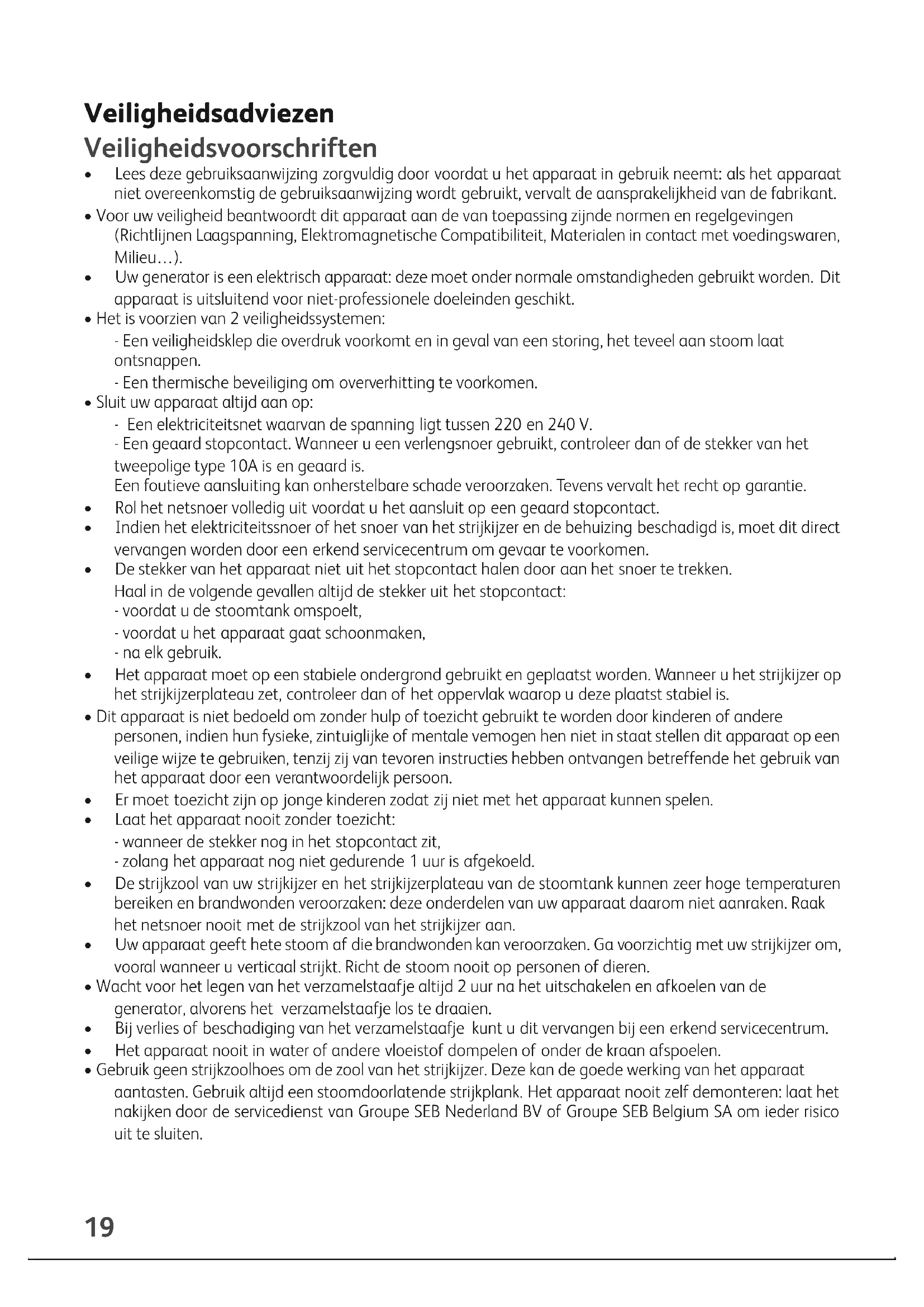 Er komt water uit de gaatjes van de strijkzool. Waterplekken verschijnen op het strijkgoed. De thermostaat werkt niet goed, waardoor de temperatuur altijd te laag is. Uw strijkplank is verzadigd van water omdat hij niet geschikt is voor de stoom- kracht van de generator. Neem contact op met een erkend reparateur of rechtstreeks met de consumentenservice. Zorgt u voor een geschikte stoomdoorlatende strijkplank. Er druppelt witte vloeistof uit de gaatjes in de strijkzool. Er komt kalkaanslag uit de stoomtank, omdat hij niet regelmatig is gespoeld. Spoel de stoomtank. Er komt bruine vloeistof uit de gaatjes van de strijkzool wat vlekken op het strijkgoed veroor- zaakt. U gebruikt chemische ontkalkings-middelen of voegt producten toe aan het strijkwater (bijv. stijfsel ofgeparfumeerd water). Voeg nooiteen product aan het water in het re- servoir of in de stoomtank (boiler) toe (zie onze tips over het te gebruiken water). Neem contact op met een erkend reparateur of rechtstreeks met de consumentenservice. De strijkzool is vuil ofbruin en veroorzaakt vlekken op het strijkgoed. U strijkt op een te hoge temperatuur. Controleer of de stand van de thermostaat ove- reenkomt met het strijkvoorschrift in uw kleding. Uw strijkgoed is niet voldoende uitgespoeld of u heeft een nieuw kledingstuk gestreken zonder het van te voren te wassen. Zorg ervoor dat uw (nieuwe) kledingstukken zorgvuldig zijn gewassen en ergeen zeepresten zijn achtergebleven. U gebruikt stijfsel. Breng stijfsel op de achterzijde van de te strijken stof aan. Er is geen of nauwelijks stoom. Het waterreservoir is leeg, het rode lampje op de stoomtank brandt. Vul het reservoir en druk op de toets "Restart" tot het lampje dooft. De temperatuur van de strijkzool is op maxi- mum ingesteld. De generator werkt maar de stoom is erg heet en droog. Dit heeft als gevolg dat de stoom minder zichtbaar is. Het rode controlelampje « waterreservoir leeg » brandt. U heeft niet op de Restart knop gedrukt. Druk op het bedieningspaneel op de toets “Re- start” voor het opnieuw starten, totdat het lampje dooft. Stoom ontsnapt rondom de dop van de stoomtank. De dop is niet goed vastgeschroefd. Draai de dop weer stevig aan. De pakking van de dop is beschadigd. Neem contact op met de afdeling onderdelen om een nieuwe pakking te bestellen. Stoom of water ontsnapt aan de onderkant van het apparaat. Het apparaat is defect. Gebruik de stoomgenerator niet meer en raad- pleeg een erkende klantenservice. Het “antikalk” controlelampje brandt. U heeft niet op de toets « restart » voor het opnieuw starten gedrukt. Druk op de toets « restart » voor het opnieuw starten, op het bedieningspaneel. U kunt altijd rechtstreeks contact opnemen met de consumentenservice van Groupe SEB Nederland BV of Groupe SEB Belgium SA (zie hiervoor de bijgevoegde servicelijst) indien u de oorzaak van het probleem niet zelf heeft kunnen vinden.Demonteer het apparaat nooit zelf ! Wees vriendelijk voor het milieu !