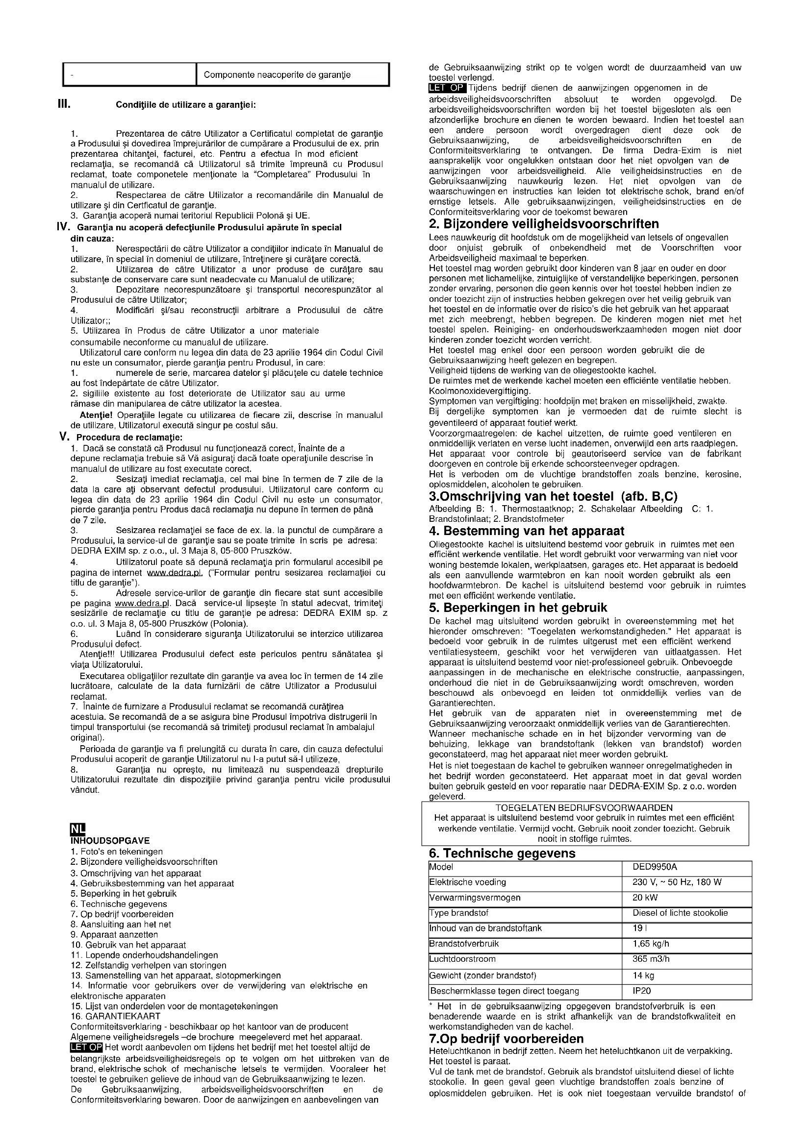 De kachel mag uitsluitend worden gebruikt in overeenstemming met het hieronder omschreven: "Toegelaten werkomstandigheden." Het apparaat is bedoeld voor gebruik in de ruimtes uitgerust met een efficiënt werkend ventilatiesysteem, geschikt voor het verwijderen van uitlaatgassen. Het apparaat is uitsluitend bestemd voor niet-professioneel gebruik. Onbevoegde aanpassingen in de mechanische en elektrische constructie, aanpassingen, onderhoud die niet in de Gebruiksaanwijzing wordt omschreven, worden beschouwd als onbevoegd en leiden tot onmiddellijk verlies van de Garantierechten. Het gebruik van de apparaten niet in overeenstemming met de Gebruiksaanwijzing veroorzaakt onmiddellijk verlies van de Garantierechten. Wanneer mechanische schade en in het bijzonder vervorming van de behuizing, lekkage van brandstoftank (lekken van brandstof) worden geconstateerd, mag het apparaat niet meer worden gebruikt. Het is niet toegestaan de kachel te gebruiken wanneer onregelmatigheden in het bedrijf worden geconstateerd. Het apparaat moet in dat geval worden buiten gebruik gesteld en voor reparatie naar DEDRA-EXIM Sp. z o.o. worden geleverd. TOEGELATEN BEDRIJFSVOORWAARDEN Het apparaat is uitsluitend bestemd voor gebruik in ruimtes met een efficiënt werkende ventilatie. Vermijd vocht. Gebruik nooit zonder toezicht. Gebruik nooit in stoffige ruimtes.